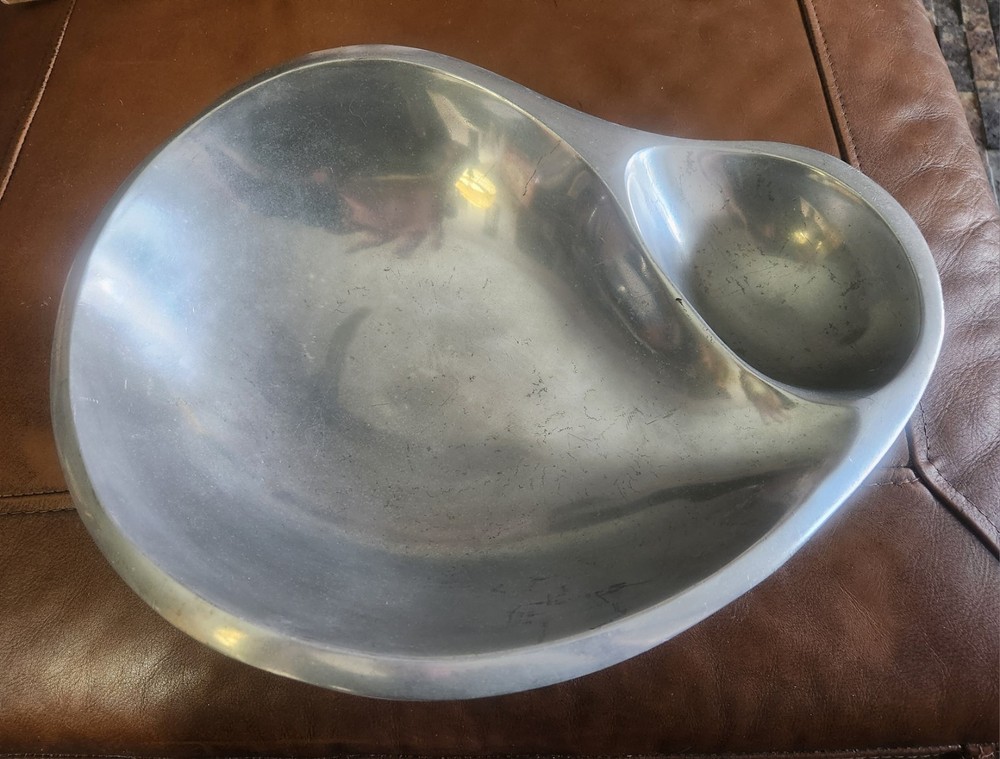 Elevate your hosting game with this vintage Nambe Classic 560 serving bowl, a timeless piece crafted in 1956. With its sleek metallic finish and large 14-inch size, it's an elegant choice for presenting chips and dips at your next gathering. The alloy metal material ensures durability, while the iconic design adds a touch of Mid-Century Modern charm to your table. The bowl's brand heritage is rooted in quality and style, making it a statement piece for any kitchen or dining collection. Its unique character, represented by the 'Chip' model name, is sure to spark conversation and admiration. Whether for special occasions or as a standout display piece, this Nambe serving bowl is a versatile addition to your home. Nambe polish included.