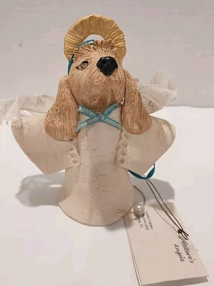 Add a touch of celestial charm to your holiday decor with the Nature's Angel Studio Pottery Christmas Bell Ornament, featuring a serene Dog Angel motif. This unique piece, crafted with meticulous attention to detail, showcases the exquisite talent of Florida-based artists, bringing a sense of peace and joy to any space. The ornament is an expertly realized in clay, and is a standout addition to any collection of holiday ornaments. Whether you're accenting your own tree or gifting it to a canine enthusiast, this Dog Halo Angel ornament is a timeless treasure that captures the essence of the Christmas spirit.