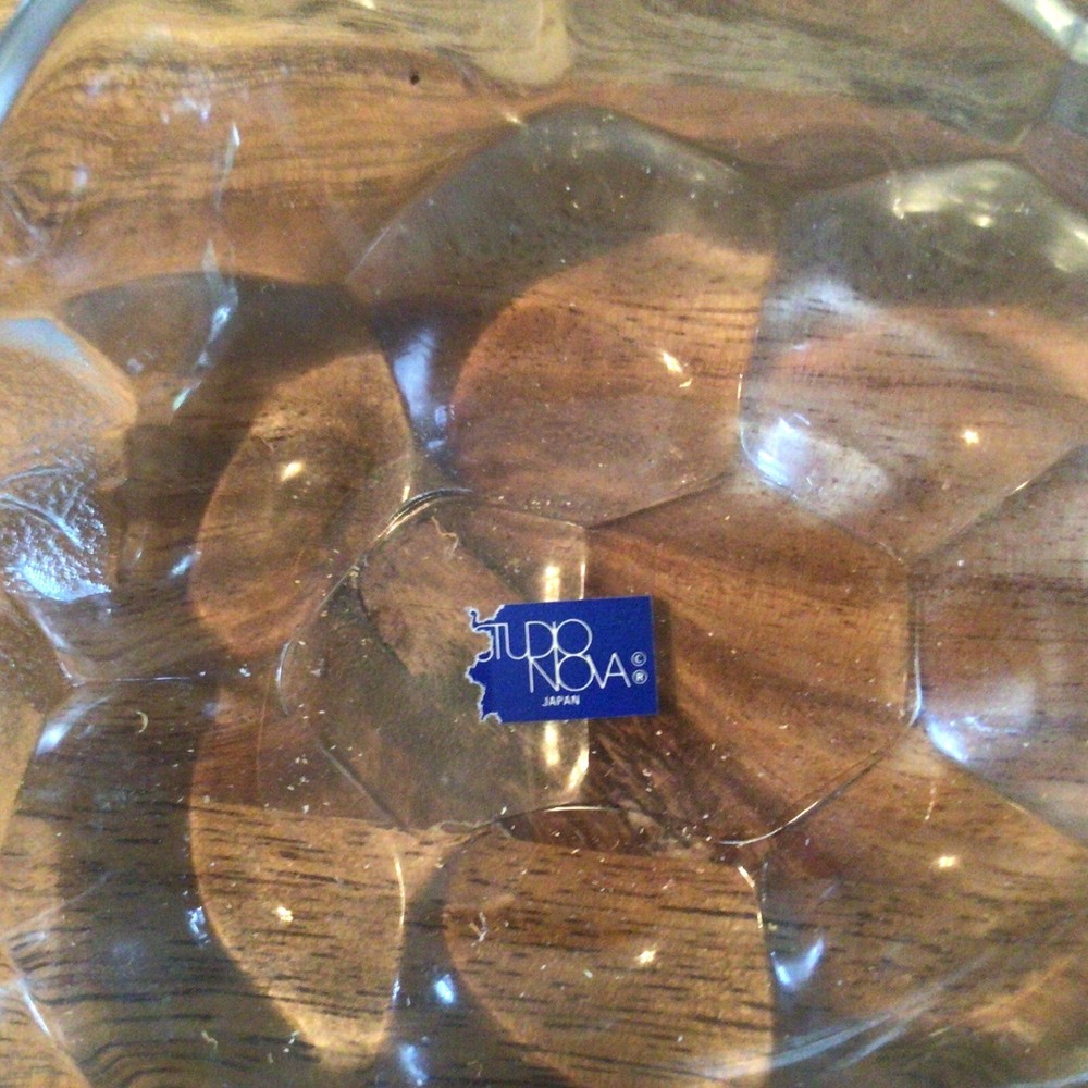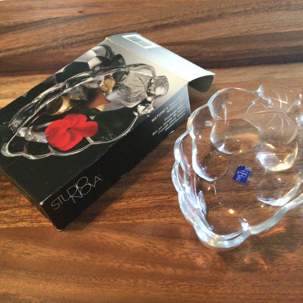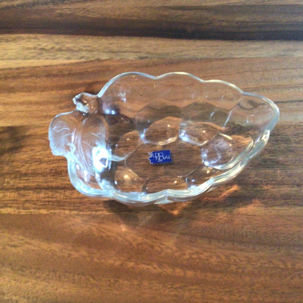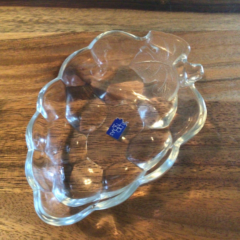 Introducing the Nature's Harvest Fruit Bowl by Studio Nova, a stunning piece with a unique design that will surely stand out in any home. Made in Japan with a glossy finish, this oval-shaped bowl features a bunch of grapes pattern that adds a touch of elegance to your table setting. Crafted using pressed glass production style, this original piece from the 1980s has a vintage feel that will make it a conversation starter at any gathering. Perfect for all occasions, this fruit bowl can hold your favorite fruits or be used as a decorative centerpiece. The Natures Harvest product line from Studio Nova features high-quality and original pieces that are perfect for any home decor.