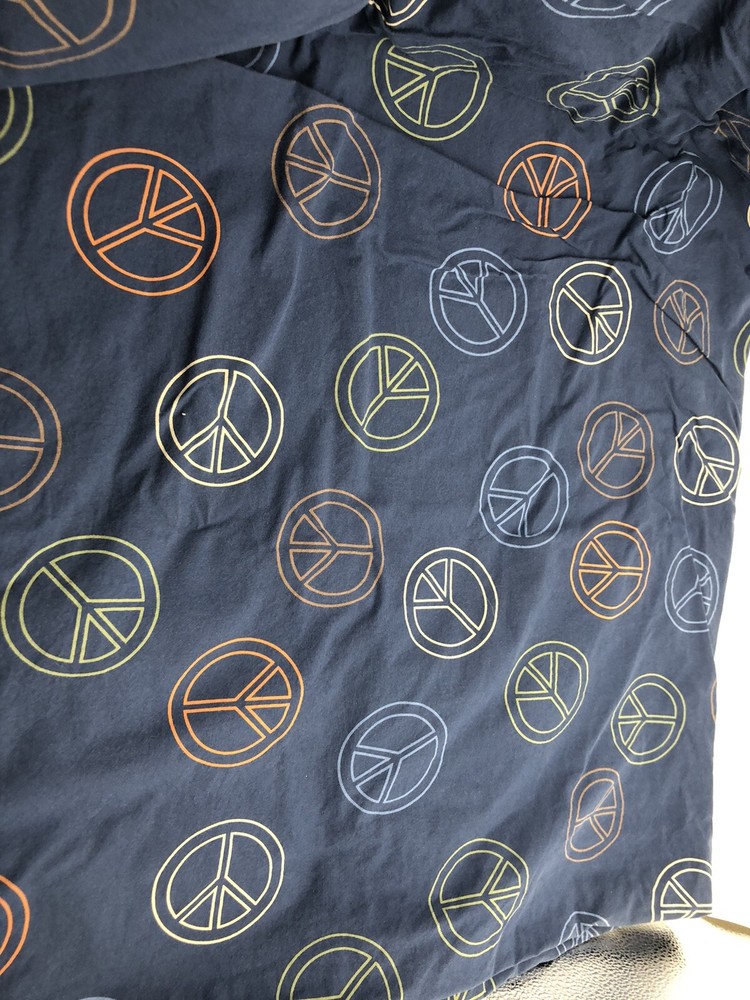 This navy blue flat sheet is a must-have for anyone who loves fun, stylish bedding! The soft all-cotton fabric feels amazing, and the playful peace sign design adds a cool retro vibe. Perfect for teens or anyone wanting a pop of personality in their room. The queen size fits great, and Pottery Barn’s quality means it’ll stay cozy wash after wash. Such a rare, unique find—so happy I grabbed it!