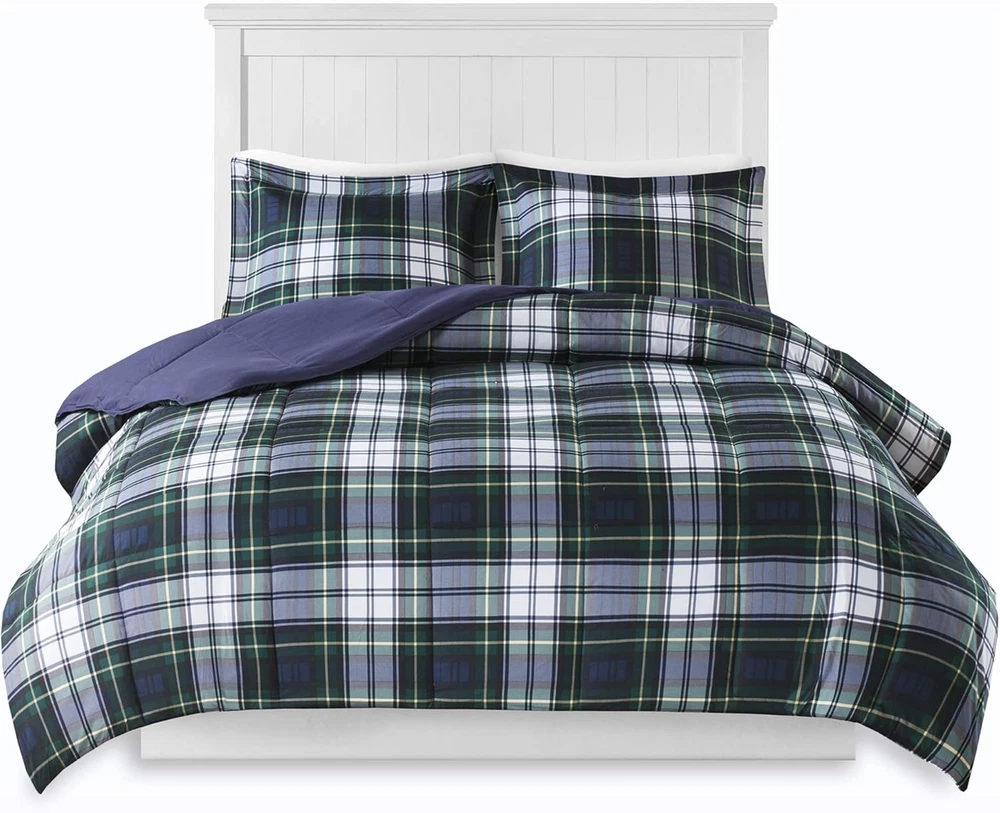 100% Microfiber Imported NEW & TRENDY - Search no further for your new comforter, Parkston comforter set with matching sham offers a popular style of modern cabin lifestyle of plaid design. 3M Scotchgard moisture management treatment to help wick away moisture, keeping you dry and comfortable at all times. The matching sham completes the look. Add a casual country charm to your bedroom and wake up to a new advanture every day BETTER SLEEP - We simply offer you a really soft high cover and our moisture wicking technology will help to keep you dry and stay comfortable. Our cozy comforter set will naturally help you sleep by making you feel toasty warm at night ALL SEASON - This is all the bedding comfort you need. With the right amount of down alternative fill and brushed microfiber cover, our comforter will stay dry while keeping you warm and comfortable year round HOW BIG? - This set is for FULL/QUEEN size bed; Comforter Set: 86"W x 90"L, Matching Standard Sham: 20"W x 26"L (2) Care instructions: Machine wash cold, gentle cycle, and separately. Do not bleach. tumble dry low, remove promptly. Do not iron. If there is no free movement in the washer or dryer, use large capacity commercial washer/dryer. Sleep comfortably with the Madison Park Essentials Parkston 3M Scotchgard Down Alternative Comforter Mini Set. Sporting a cool plaid pattern, this ultra-soft comforter brings a classic casual style to your bedroom decor. The matching shams (1 in Twin/TwinXL) feature 2-inch flanges that add a charming touch to the top of the bed. A 3M Scotchgard Moisture Management Treatment helps wick away moisture to keep you cooler and drier for a comfortable night’s sleep. This comforter set is OEKO-TEX certified, meaning it does not contain any harmful substances or chemicals. Items in the set may come in a rolled or compressed packaging, which will need to be fluffed up or steam ironed before use to remove wrinkles.