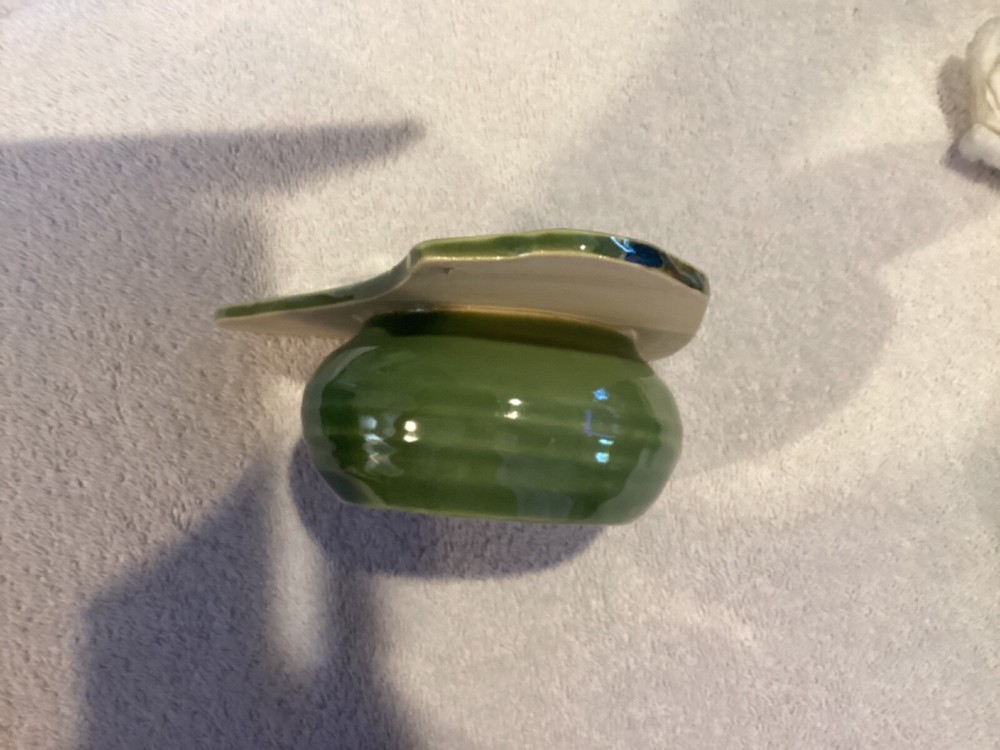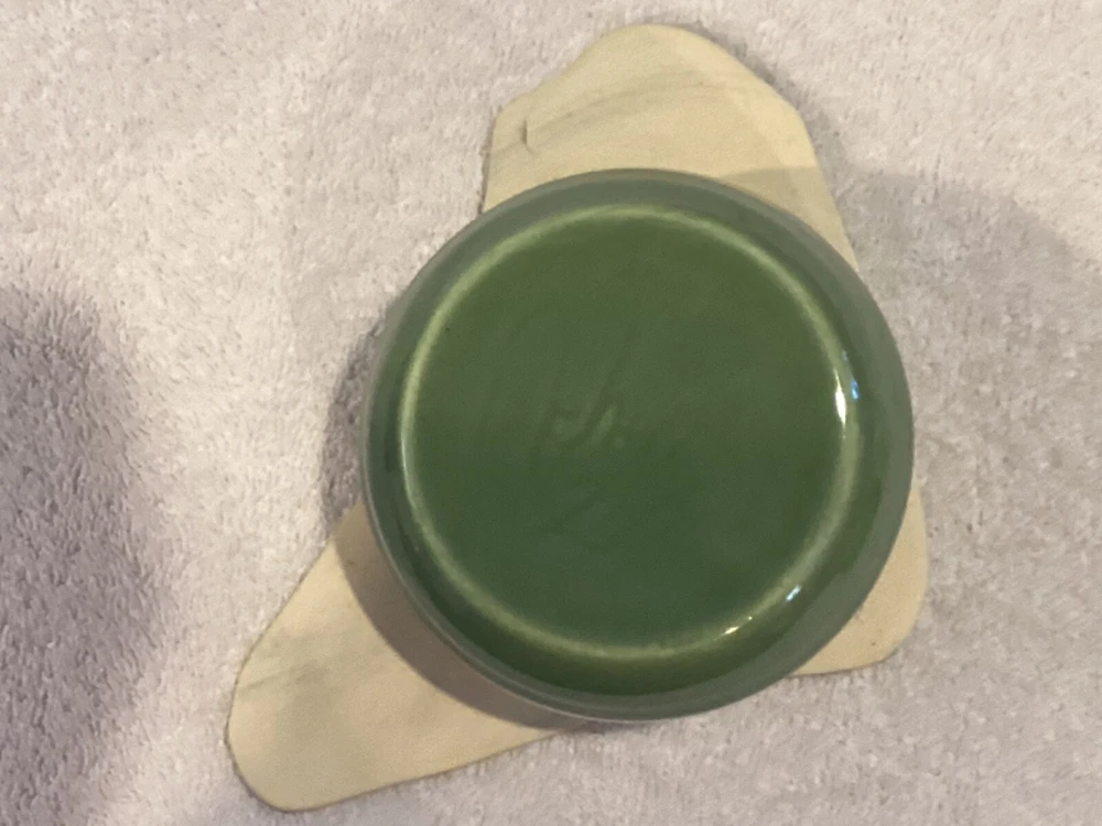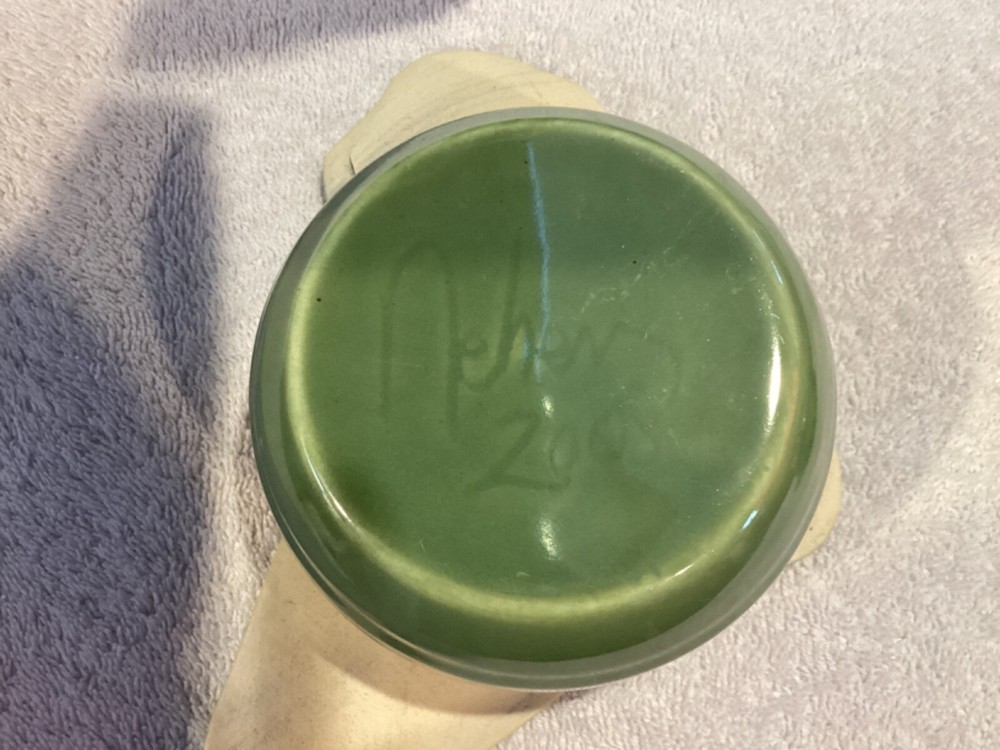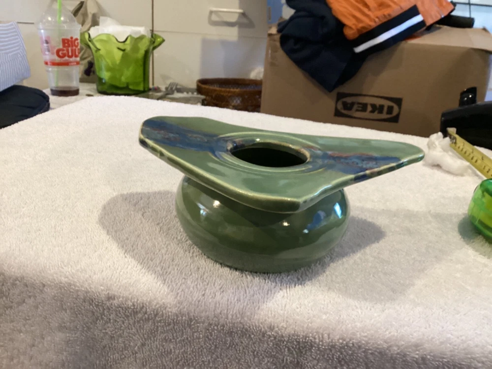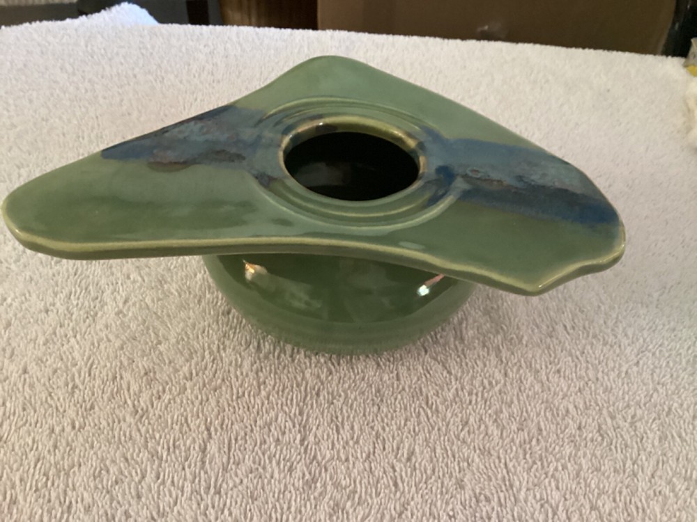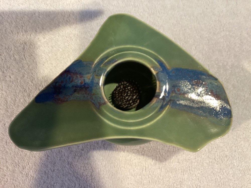 Unique rounded base with abstract triangle top with metal frog to arrange your flowers. Glossy green with accents of blues. Signed by Neher 2008. Nehers opened their “Clay in Motion” Studio in Northern Oregon in 1981 and still in business. Beautiful quality pottery hand made and hand decorated Japanese Ikebana Style Vase. Very good condition. We try our best to describe and take sufficient pictures so look carefully as the photos are part of the description. Photos show details where words can't and show you exactly what you are bidding on. Shipping charges are not refundable. Any returned items by Buyer will pay the returned postage and will not be refunded. Only the price paid (minus the shipping) will be refunded by Seller. Almost 100% of what we sell is used or vintage/antiques. We accept PayPal only. We use recycled bubble wrap, paper and boxes. Thanks for looking! Vf#7