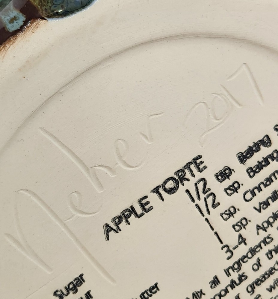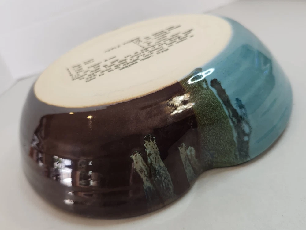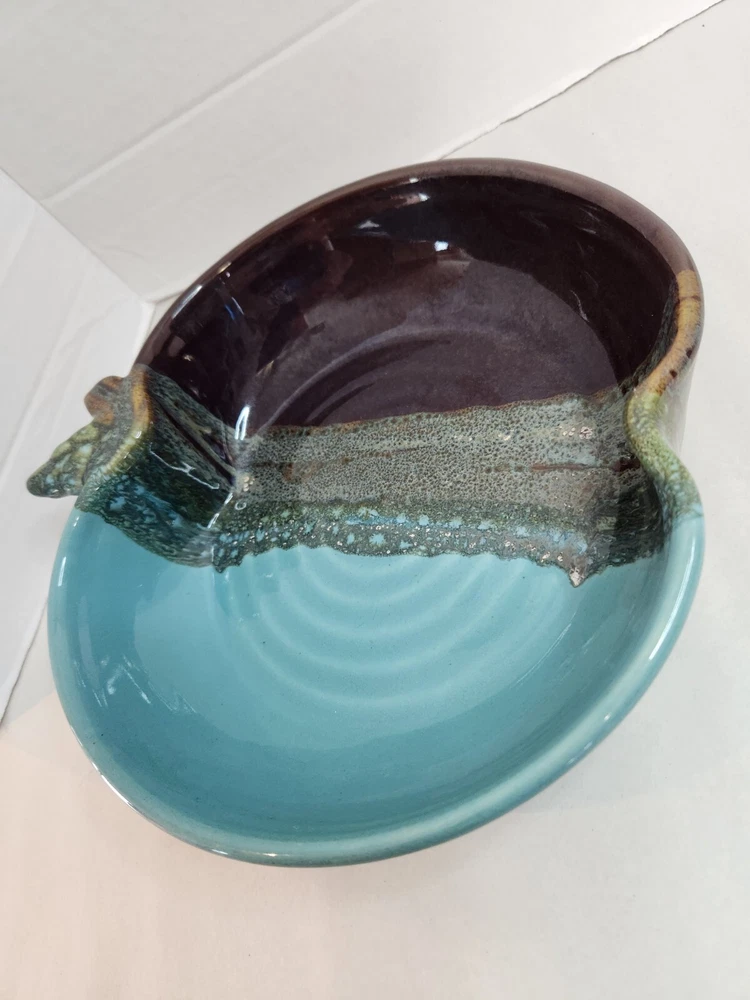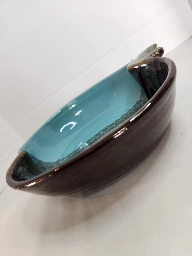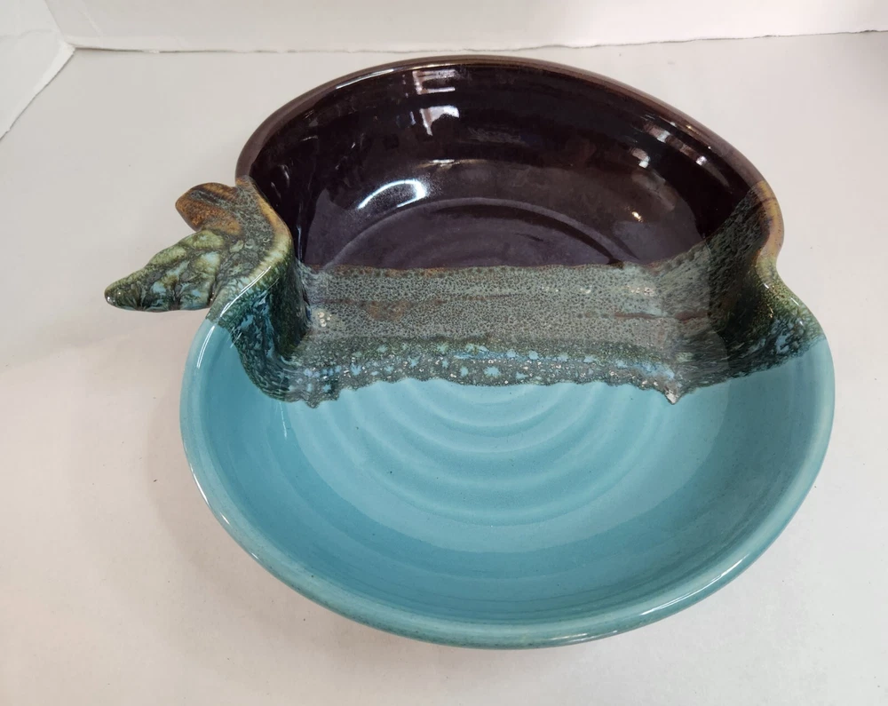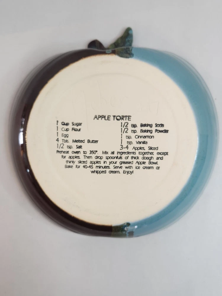 Pretty NEHER Pottery 9" apple shaped bowl or Apple Torte baker. Color is blue and brown and the bottom has an apple torte recipe. Bowl is signed and dated. Eye catching piece with a beautiful glaze. Shipped with USPS