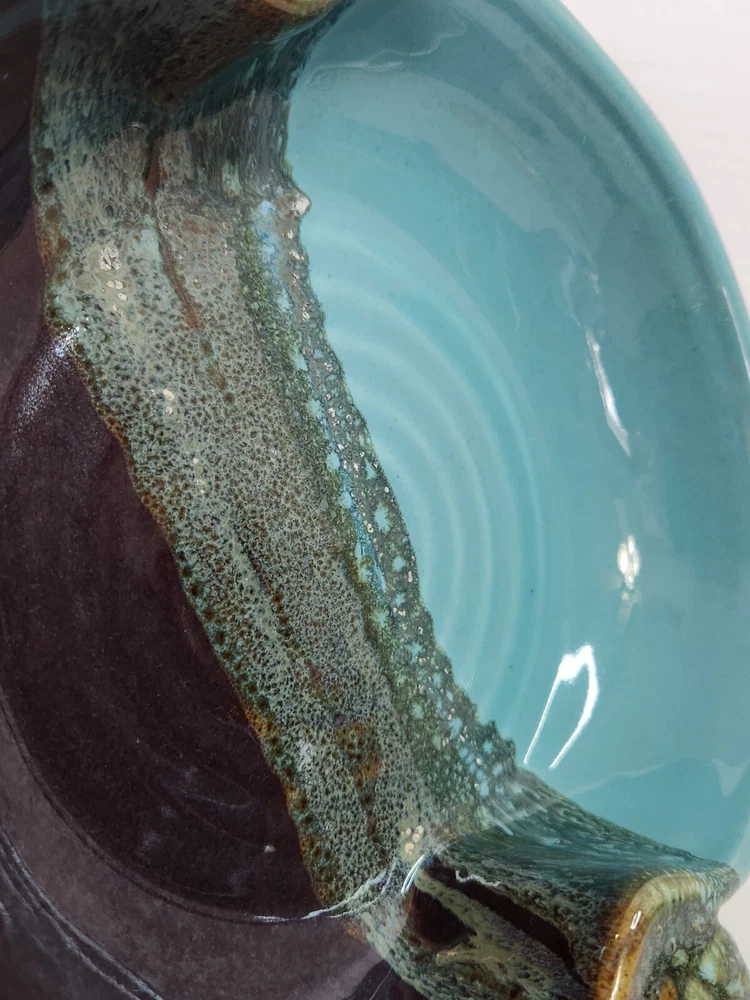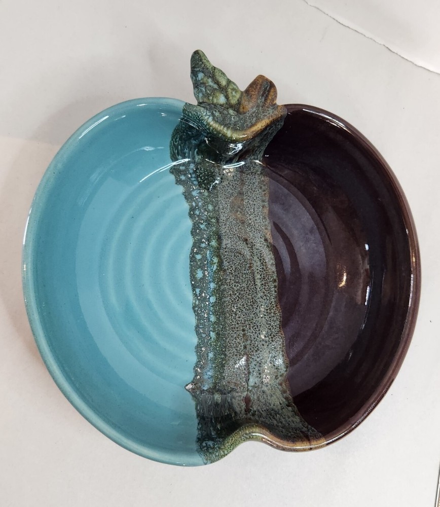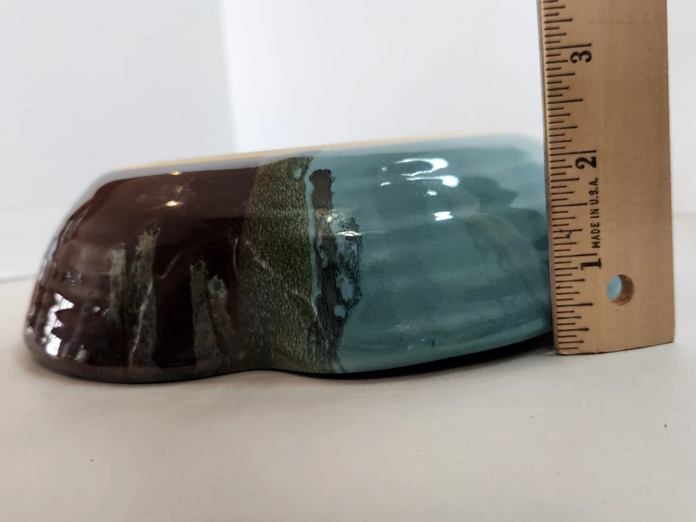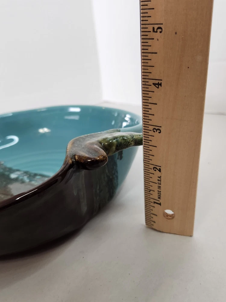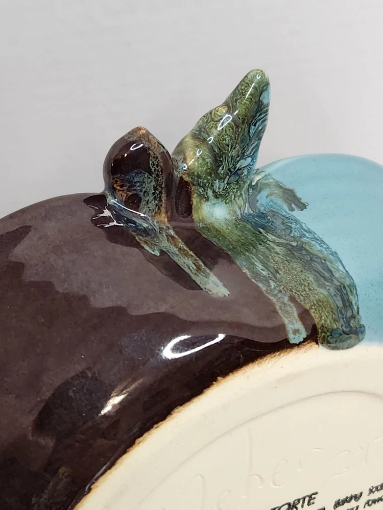 Pretty NEHER Pottery 9" apple shaped bowl or Apple Torte baker. Color is blue and brown and the bottom has an apple torte recipe. Bowl is signed and dated. Eye catching piece with a beautiful glaze. Shipped with USPS