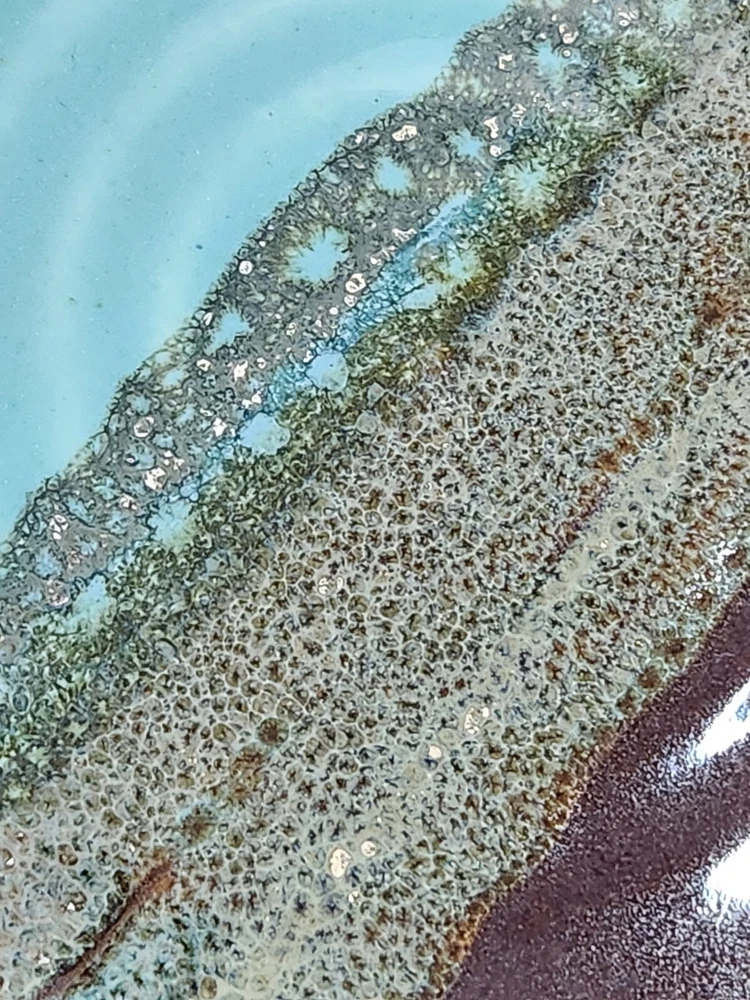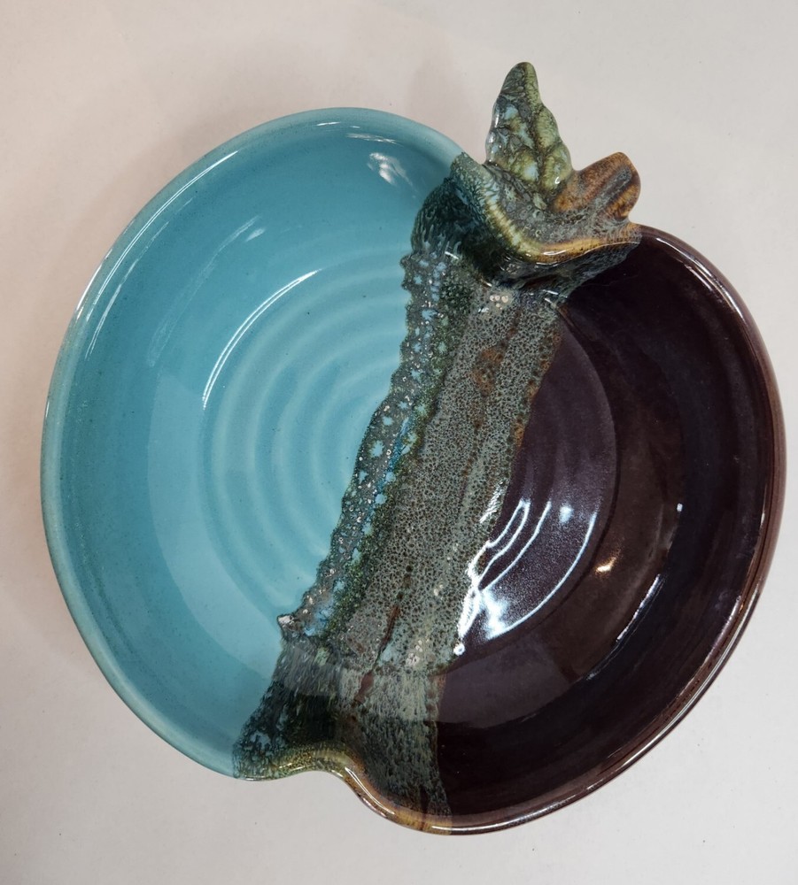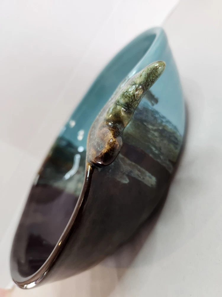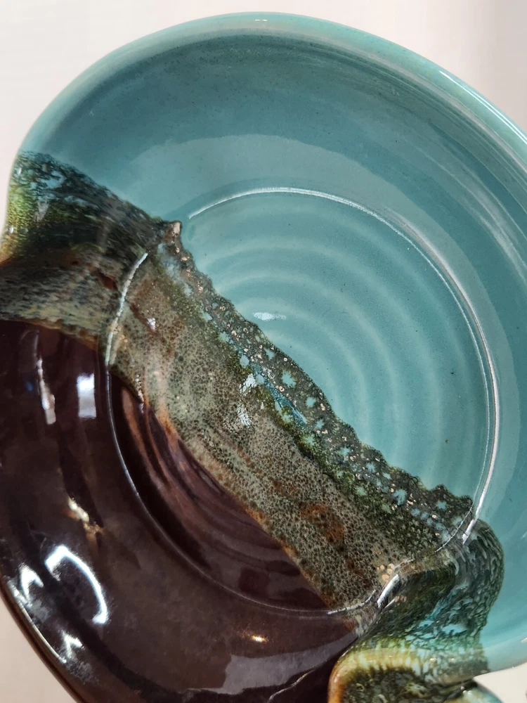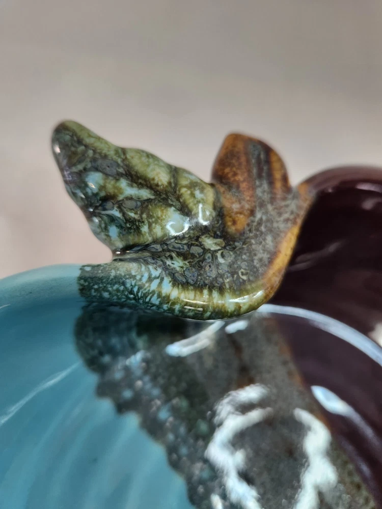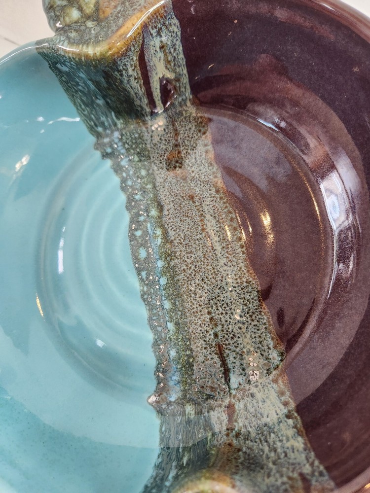 Pretty NEHER Pottery 9" apple shaped bowl or Apple Torte baker. Color is blue and brown and the bottom has an apple torte recipe. Bowl is signed and dated. Eye catching piece with a beautiful glaze. Shipped with USPS