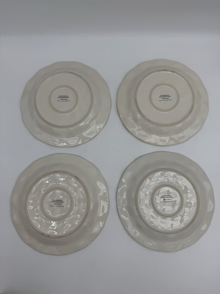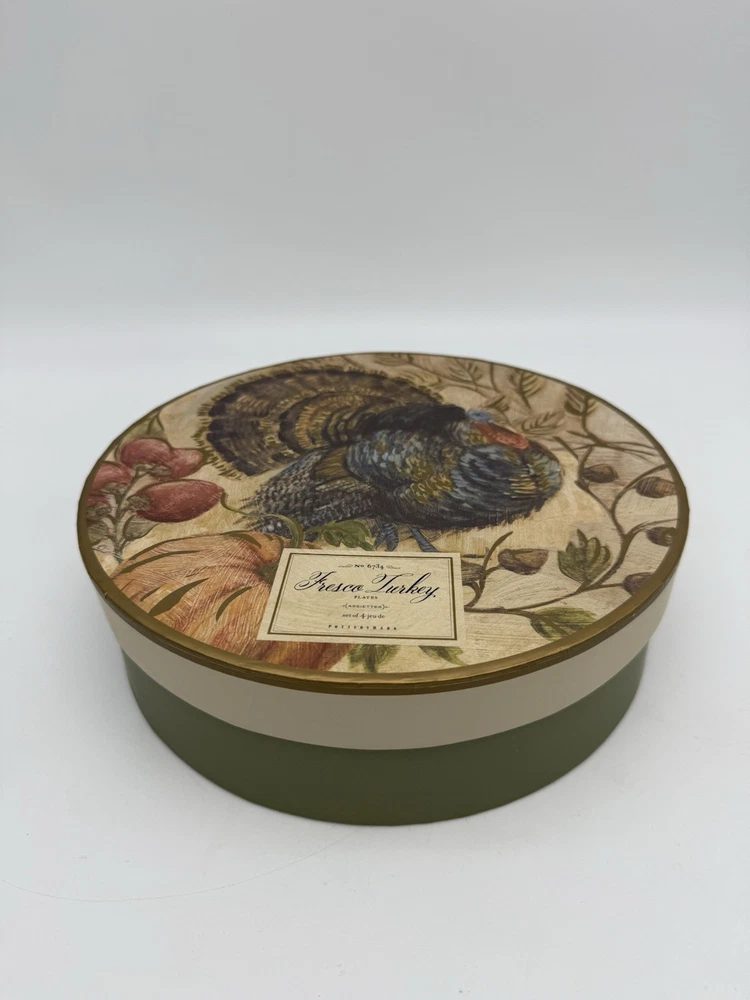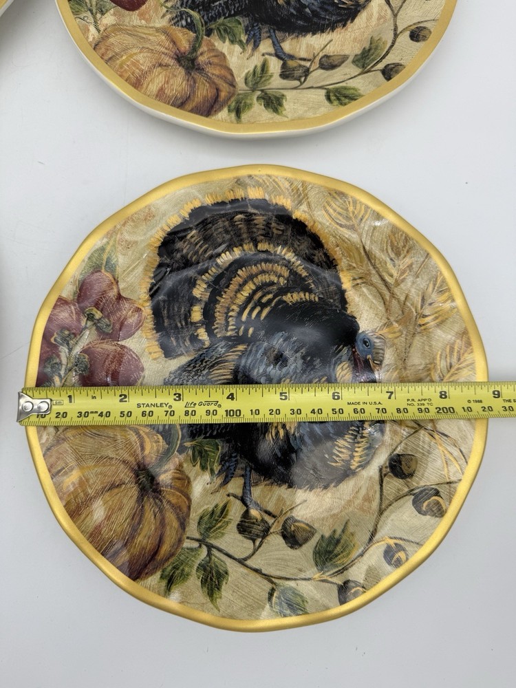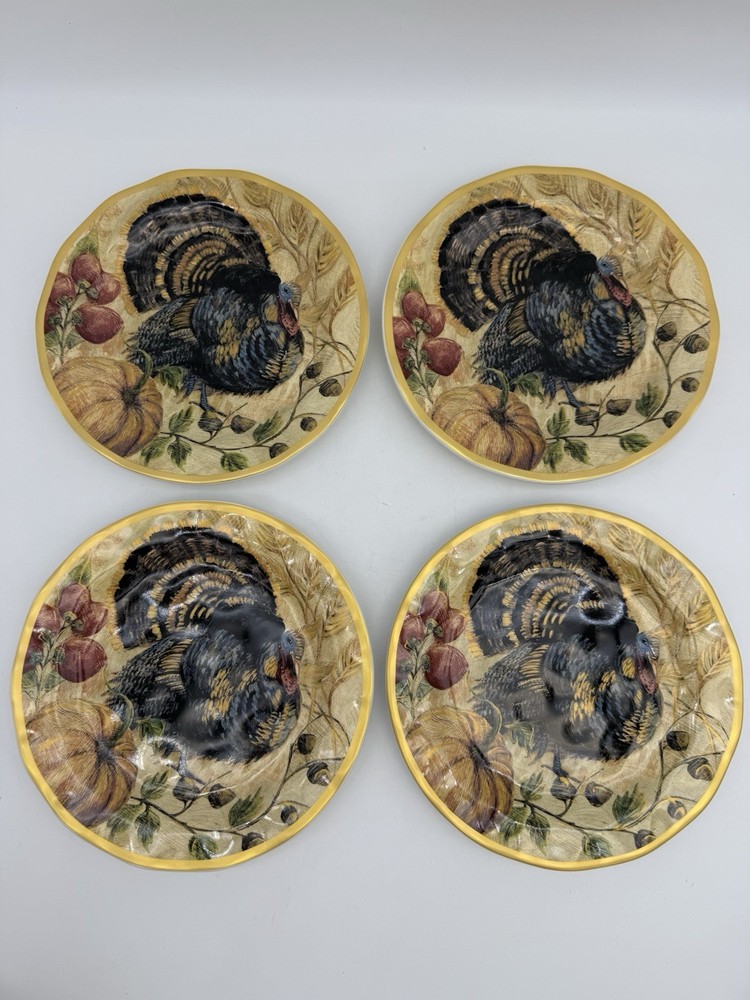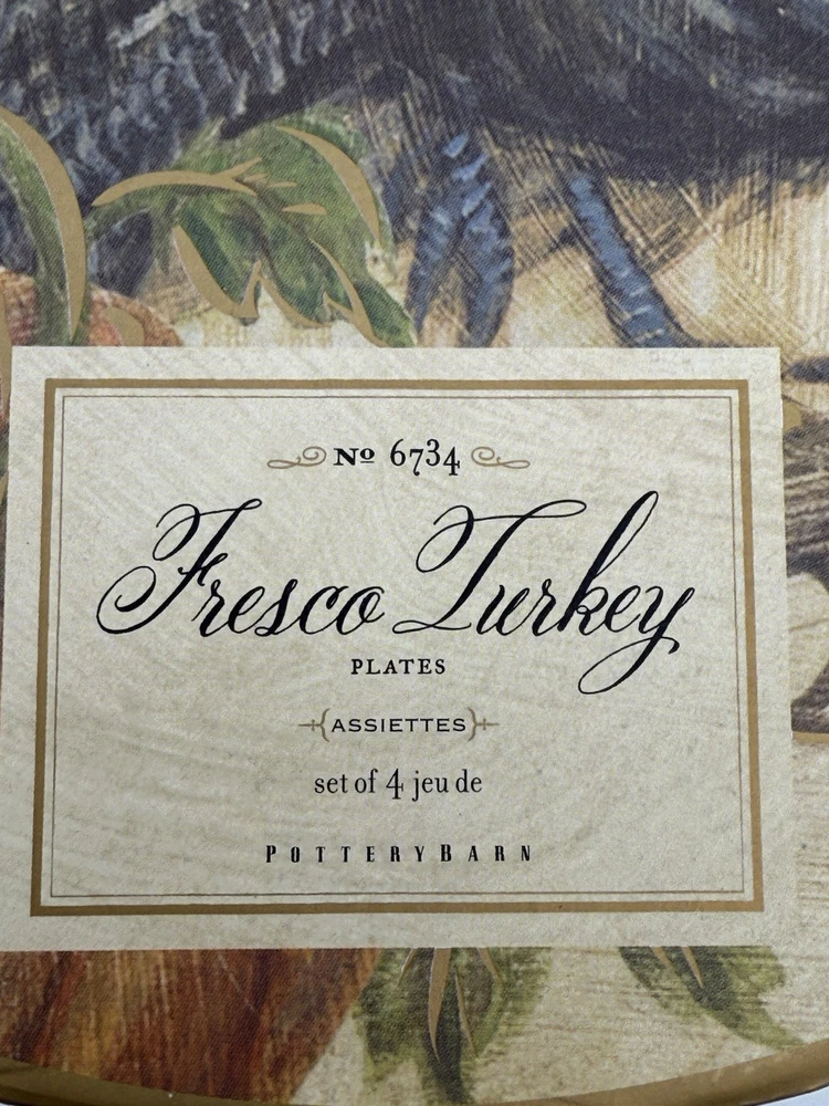 Add a touch of Harvest charm to your Thanksgiving table with this beautiful set of 4 Pottery Barn Fresco Turkey 9" plates. The plates feature a colorful fresco turkey design that will surely be a hit with your guests. The plates are made of high-quality stoneware and are dishwasher safe for easy cleaning. Perfect for serving luncheon or salad, these round plates are a great addition to your dinnerware collection. The multi-color design is perfect for a festive Thanksgiving dinner. Made in China, these plates are durable and will last for years to come. Get your hands on this stunning set of Pottery Barn Fresco Turkey plates today!