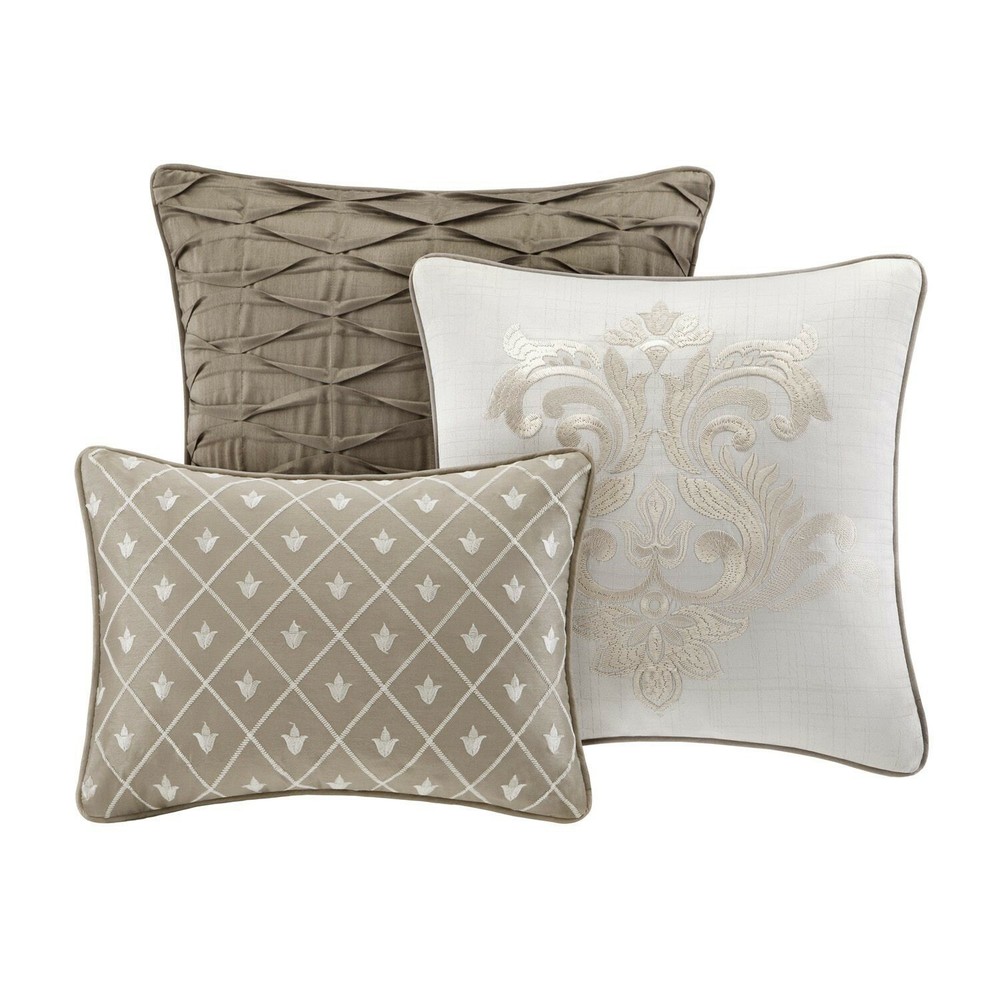 Product Specifics: 7-Pc Comforter Set by Madison Park Model: Conrad Size: King Colors: Natural (Grayish, stone) Includes: 1 comforter, 2 king size shams, 1 bed skirt, & 3 decorative pillows Jacquard facing with pin-tucked details Machine wash Polyester Super fast to ship with tracking number provided Shipping weight: 16lbs