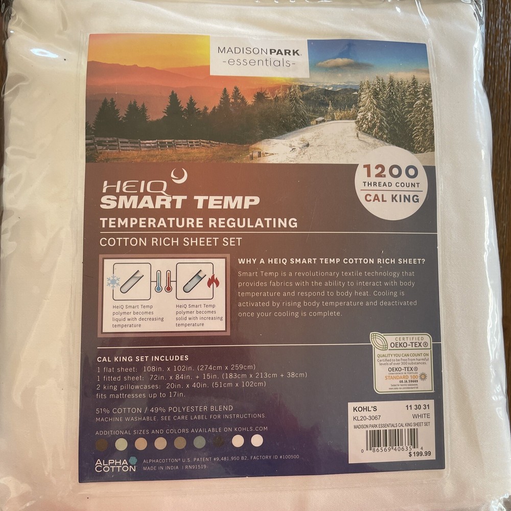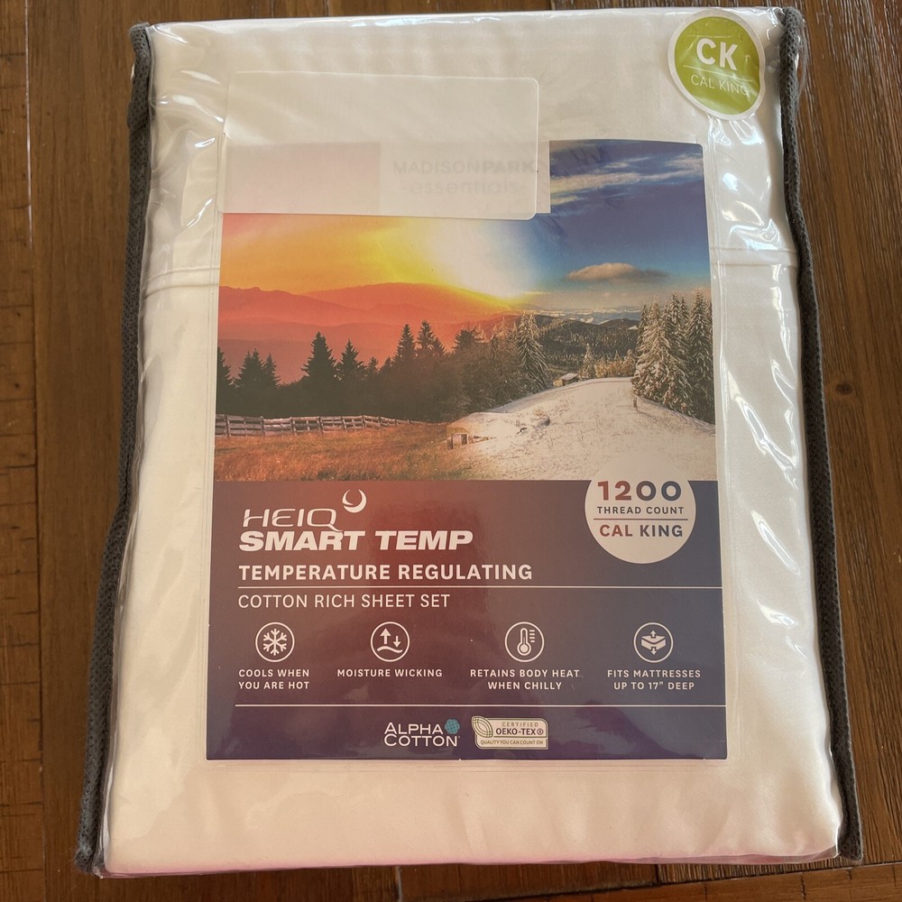 New California King Sheet Set White. Temperature regulating. 17 inch deep pockets. Contains one flat sheet one fitted sheet and two king pillowcases. Flat sheet measures 108“ x 102“ fitted sheet measure 72“ x 84“ +15“