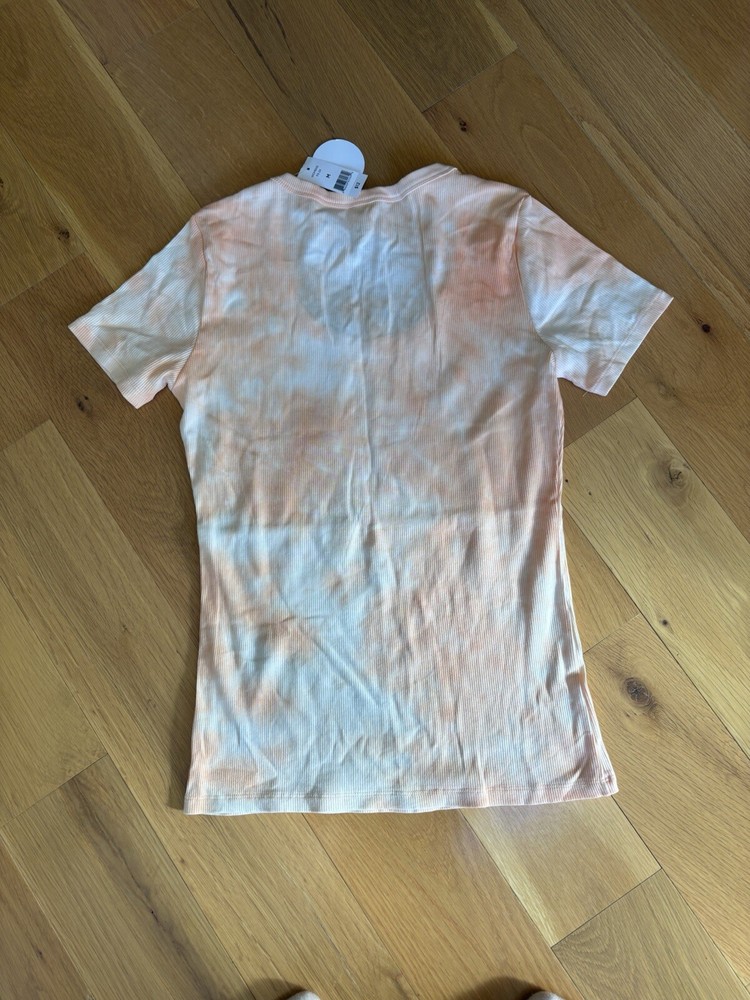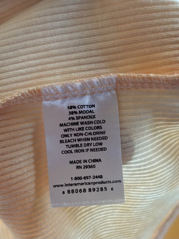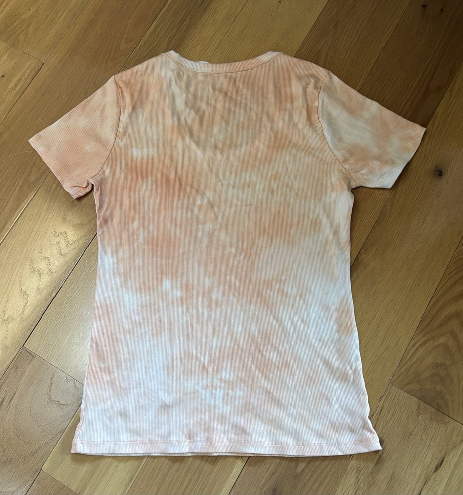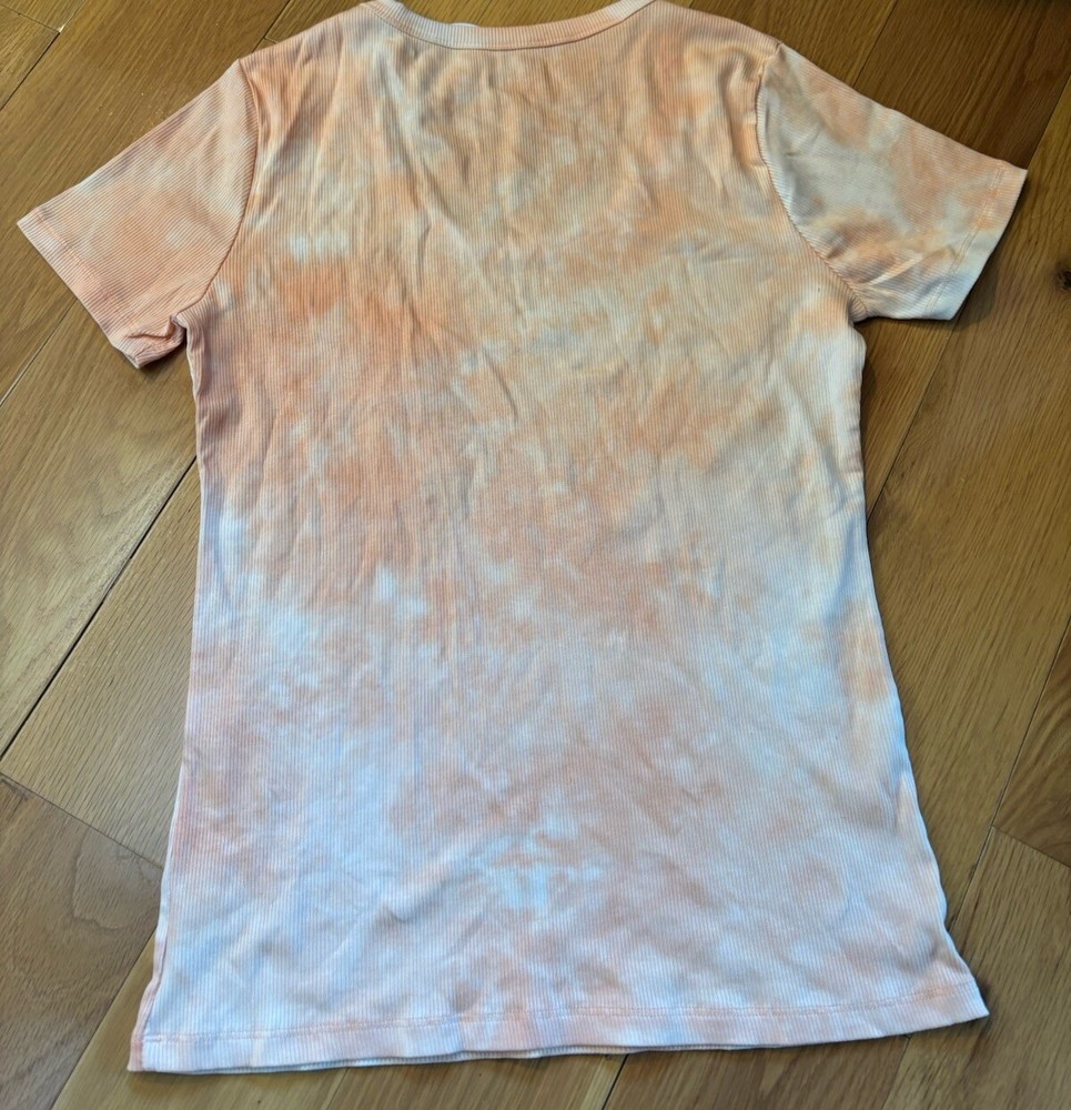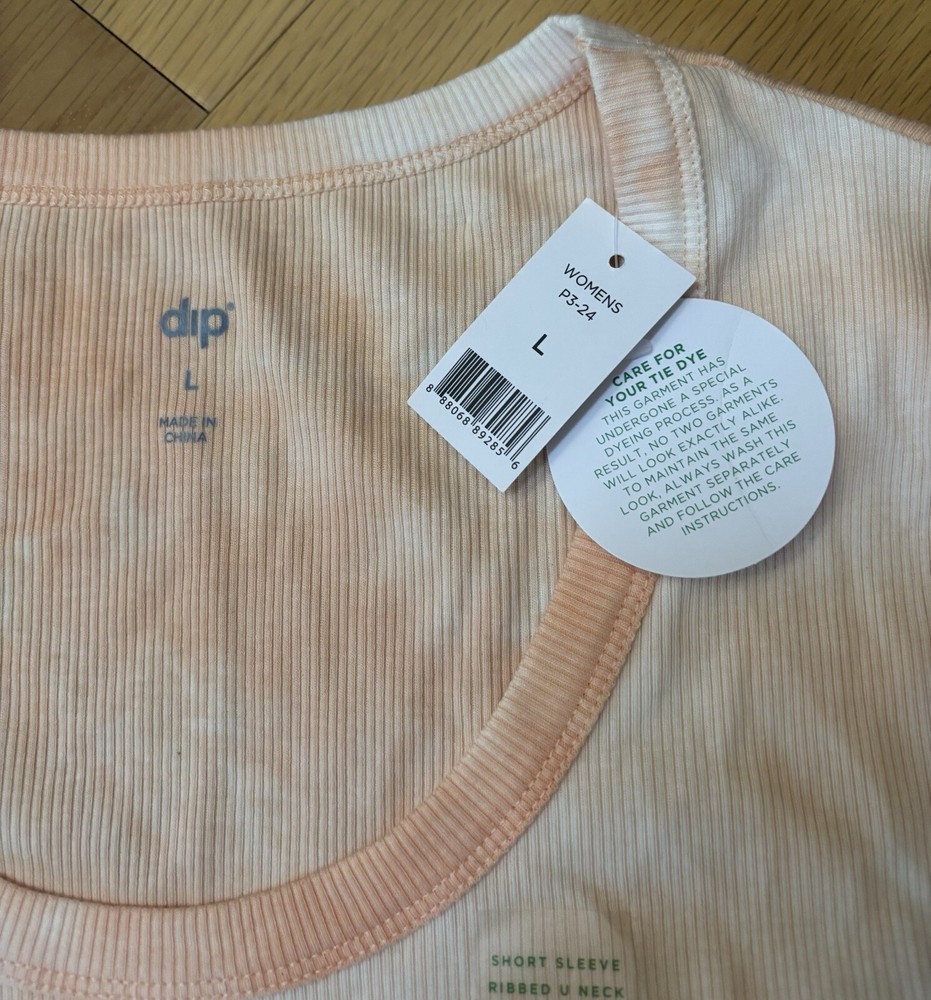 New Dip Brand Women’s Large Ribbed Scoop Neck Tie Dyed T-Shirt, Short Sleeves, White/Light Peach. Cute & Comfy Scoop Neck T-Shirt, Ribbed /Great Quality Fabric with Stretch! Fabric 58% Cotton, 38% Modal, 4% Spandex Chest 36” Length 25” Sleeves ( Shoulder to Cuff) 7”. Great Overall T-Shirt, Fits Longer. MSRP $12