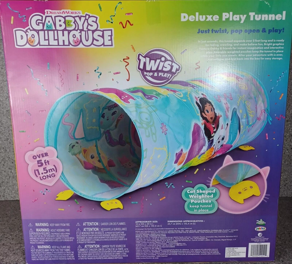 TWIST POP & PLAY DELUXE TUNNEL Twist, pop, and play with your favorite Gabby's Dollhouse characters! In just seconds, this tunnel expands over 5 feet long and is ready for hiding, crawling, and make believe fun. Bright graphics features Gabby, MerCat and Cakey for instant imagination and interactive play. Includes adorable bean bags to keep the tunnel in place while your little one crawls. After your adventure with Gabby & friends is over, just collapse and fold Back into the box for easy storage. BRAND NEW ~ AGES 3+ ROBSTOYGARAGE PAYMENT : Payment must be received within 2 days of purchase. SHIPPING : We are always working hard to ensure your package arrives as soon as possible. Please understand that some factors like weather, high postal traffic, and the performance of shipping companies are outside of our control. We offer free shipping to the lower 48 states and ship within 1-2 business days of payment. For shipping outside of the continental USA, we only use eBay's Global Shipping Program. The item is shipped to eBay Hub and then sent to the rest of the world. International customers are responsible for all duties and taxes. Continue to check out in order to calculate costs for shipping the item to your country. Messages regarding eBay's Global Shipping Program MUST be directed at eBay EXCLUSIVELY. AVAILABILITY : All items were in stock at the time of the original listing. FEEDBACK: I Will leave feedback for you, Once it's left for Me! GUARANTEE : If I Misrepresent Item Listed, I will refund ALL Your money!! Please know what you are buying. If you have any question, Just Ask. THANK YOU FOR VISITING ROBS TOY GARAGE TODAY - CHECK OUT MY FACEBOOK PAGE. WE HOPE TO SEE YOU AGAIN SOON.