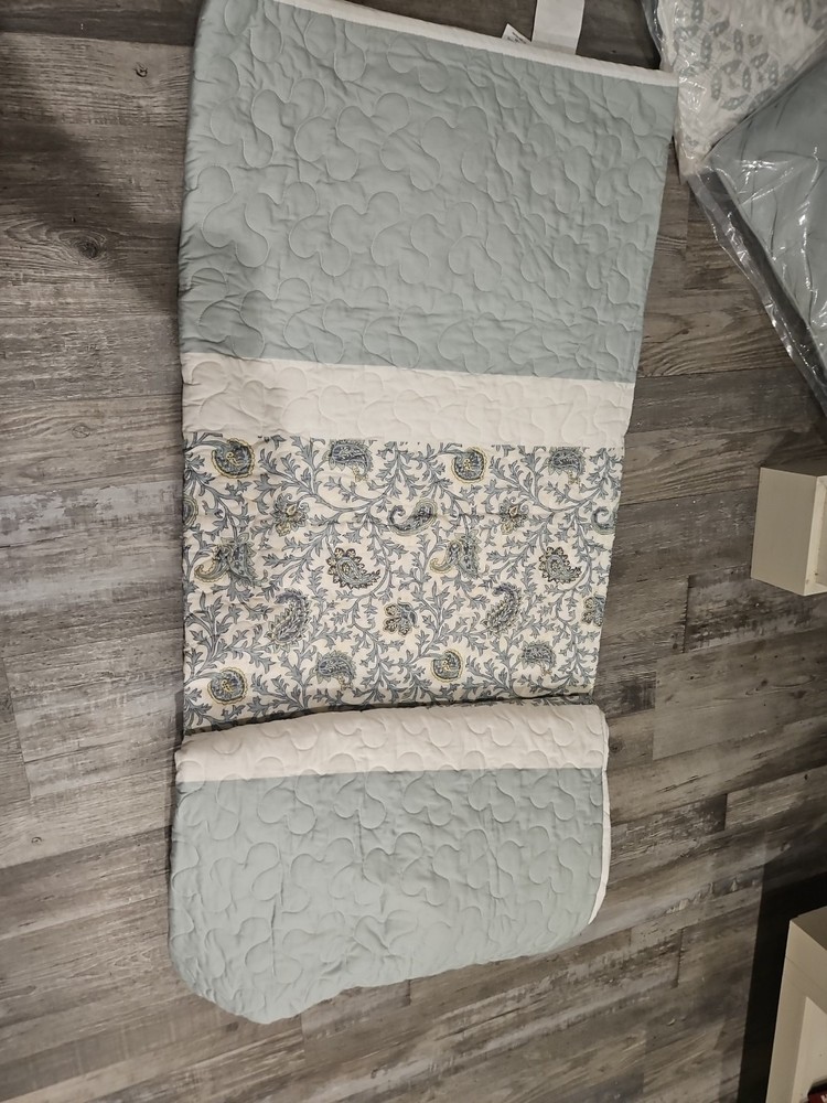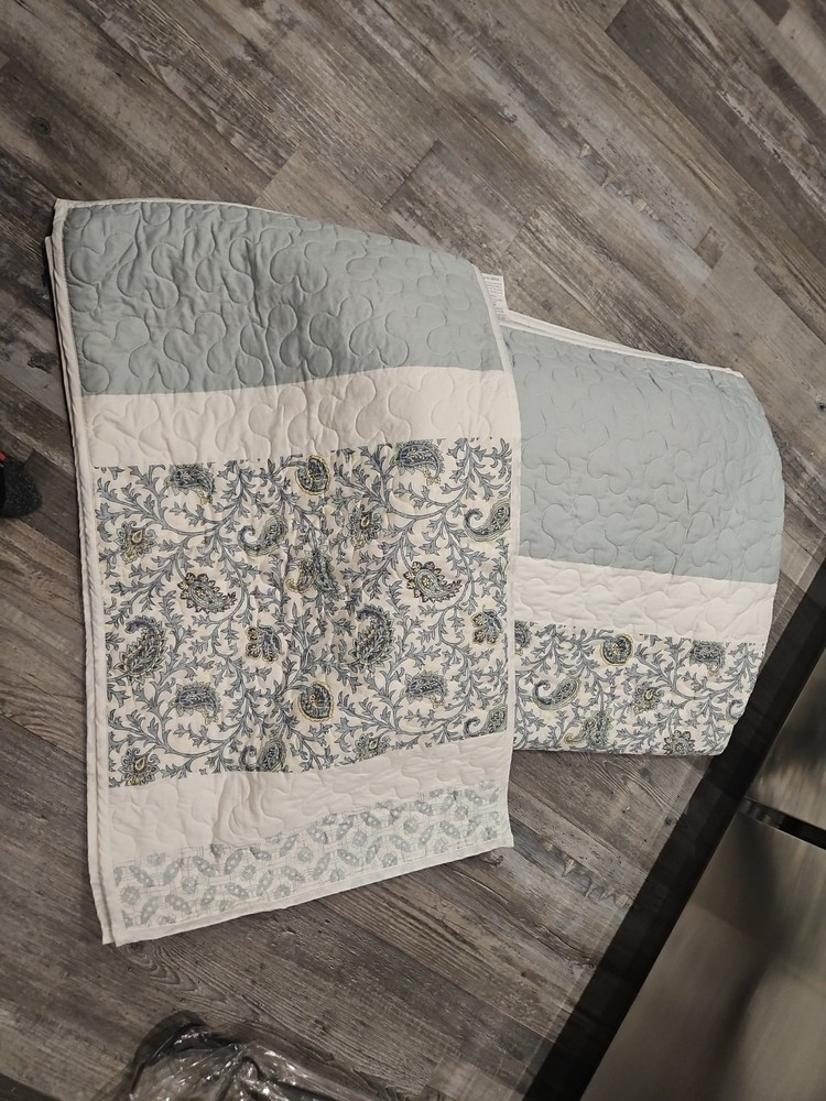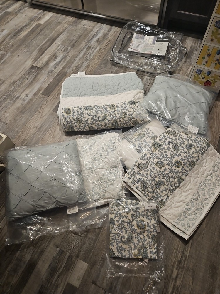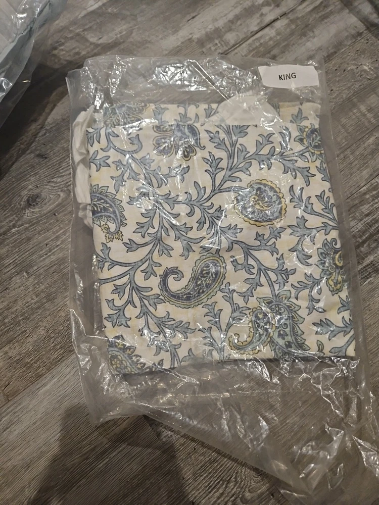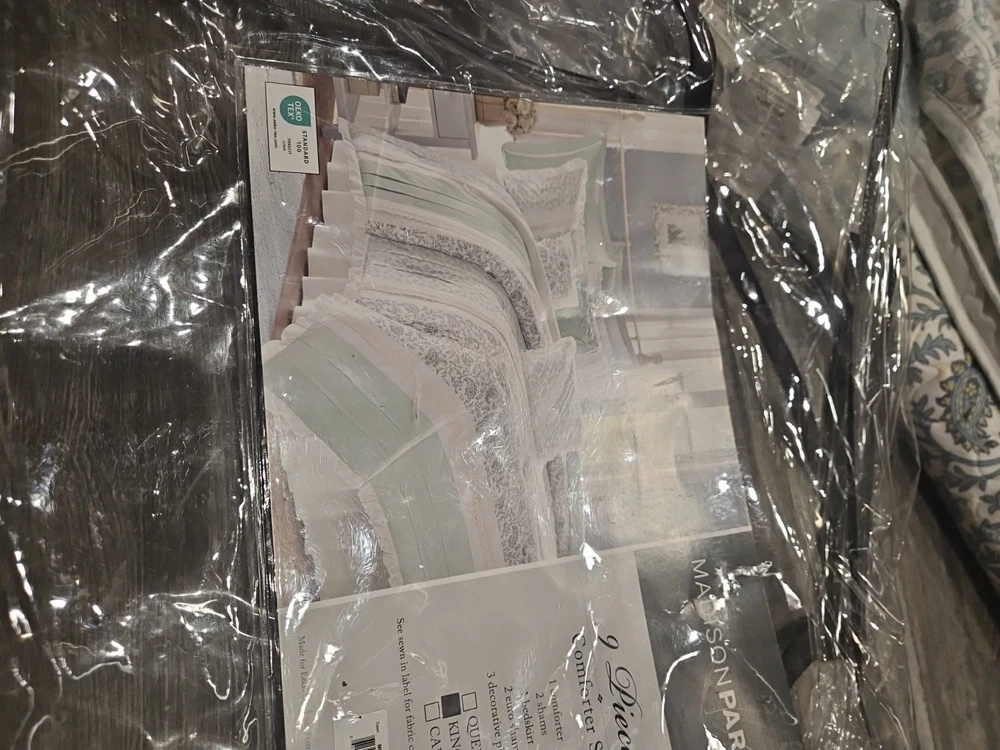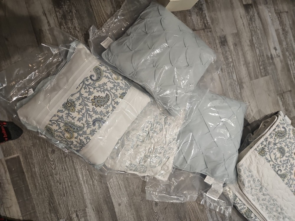 All brand new-never used or displayed. 4 decorative pillows are still sealed in plastic DESCRIPTION The Madison Park Dawn 9 Piece Cotton Percale Comforter Set offers a shabby chic update to your bedroom decor. A paisley print is featured on the cotton comforter with pintucked fabric separated by lace taping embellishments. Around the edge, a ruched flange adds a graceful touch, for a charming cottage look. Matching shams mirror the design of the comforter, while two solid Euro shams complement the top of the bed. Four decorative pillows complete this farmhouse comforter set. This bedding set is also OEKO-TEX certified, meaning it does not contain any harmful substances or chemicals to ensure quality comfort and wellness. A coordinating shower curtain is available and sold separately. Items in the set may come in a rolled or compressed packaging, which will need to be fluffed up or steam ironed before use to remove wrinkles. FEATURES • Cottage and shabby chic 9 piece comforter set in cotton fabrication • Sophisticated elegance using pintucking, pieced and printed textile variety • Soothing farmhouse bedroom decorating idea • Set includes quilt, 2 shams, 2 euro shams and 4 decorative pillows • Lace taping embellishment for a feminine and shabby chic touch • 4 decorative pillows featuring pleating and ruching details • Oeko-Tex Certified, includes no harmful substances or chemicals • Machine washable and steam iron for wrinkle removal • Items in this set may come in rolled or compressed packaging and will need to be fluffed up MATERIAL Comforter/Sham: cotton percale, printed, piecing, pintuck, ruched flange, cotton/polyester reverse, polyester filling, 2" ruched flange on sham, overlap opening at back of sham Bedskirt: cotton/polyester ruched drop, non-woven fabric platform Euro Shams: cotton /polyester Pillow: cotton cover, polyester filling King Comforter Set includes: 1 Reversible Quilt: 104"W x 92"L 2 King Shams: 20"W x 36"L + 2"D 2 Euro Sh ams: 26"W x 26"L 1 Decorative Pillow: 18"W x 18"L 2 Dec orative Pillows: 16"W x 16"L 1 Decorative Pillow: 12"W x 18"L