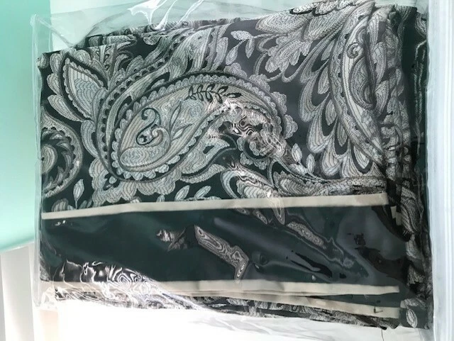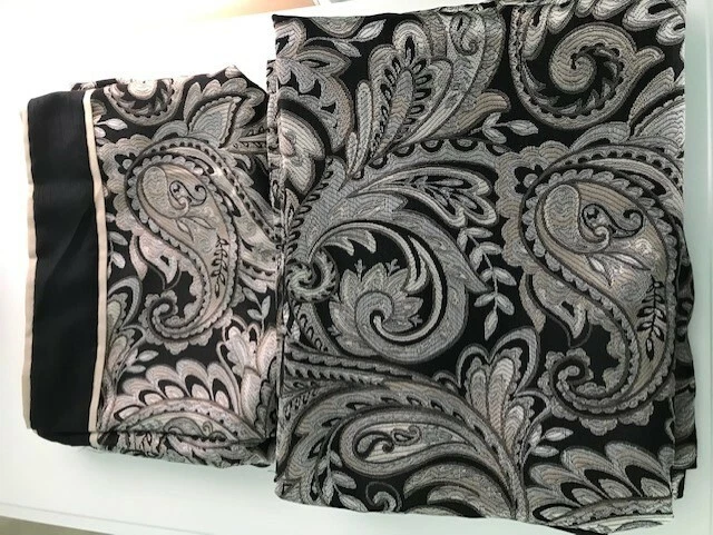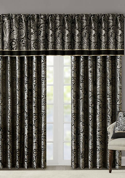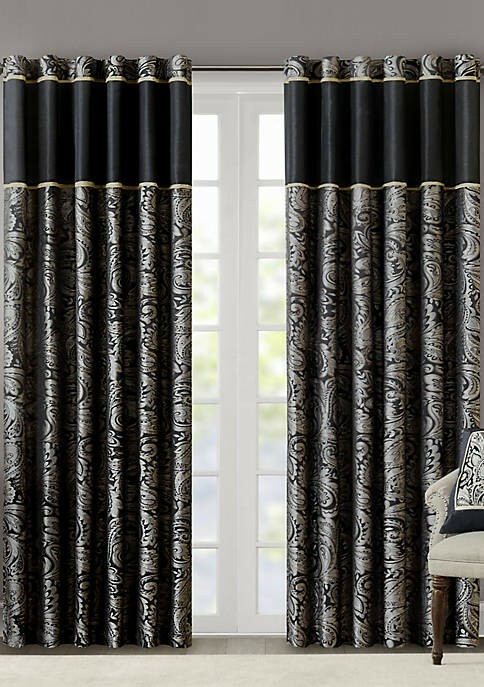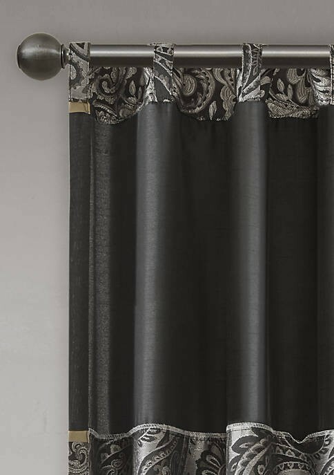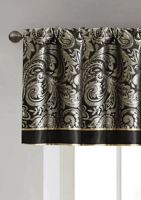 Madison Park Aubrey Black and Gold Paisley Jacquard Curtain Panel Pair + two Aubrey Jacquard Rod Pocket Valance, totally 4 pieces. curtain : 50"x 84", 2-Panel valance: 50" x 18" 2 pieces Open package, never use, bought wrong height. So, it is a total set. The Madison Park Aubrey Window Curtain Pair and window valance are the perfect touch to your decor. The alluring jacquard weave is inspired from an updated paisley motif and is woven in beautiful hues and a hint of platinum for a shimmering accent. The window panels are pieced with solid faux silk and beautiful flat piping details in gold, creating an elegant look. Rod pocket hanging style Imported Product Specifications 3 in rod pocket size Fits up to a 1.25 in diameter rod Material & Care Polyester Machine washable All my listings are from pet-free and smoke-free house. Thanks for looking.