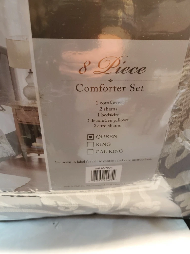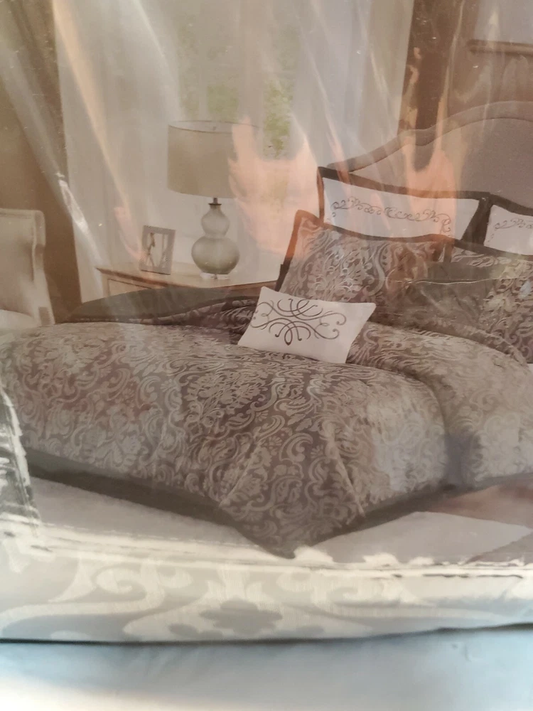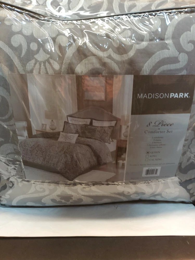 New Madison Park Flourish Jacquard 8 Piece Queen Comforter/Bedding Set In Gray. Location shelf 3...