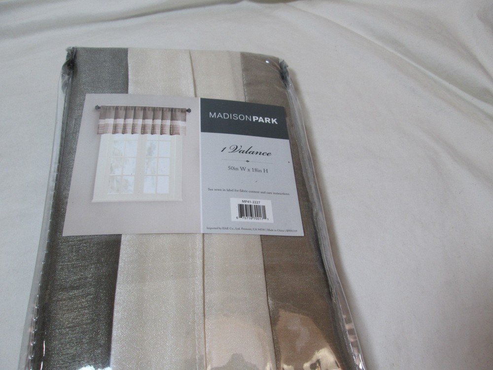 Madison Park Lined valance Measure: 55"Wx18"H Color: ivory, taupe, beige Content: 100% polyester New in package From smoke free and pet free environment International Buyers – Please Note: Import duties, taxes, and charges are not included in the item price or shipping cost. These charges are the buyer's responsibility. Please check with your country's customs office to determine what these additional costs will be prior to bidding or buying. Payment to be made within 4 days of auction end. Thank you