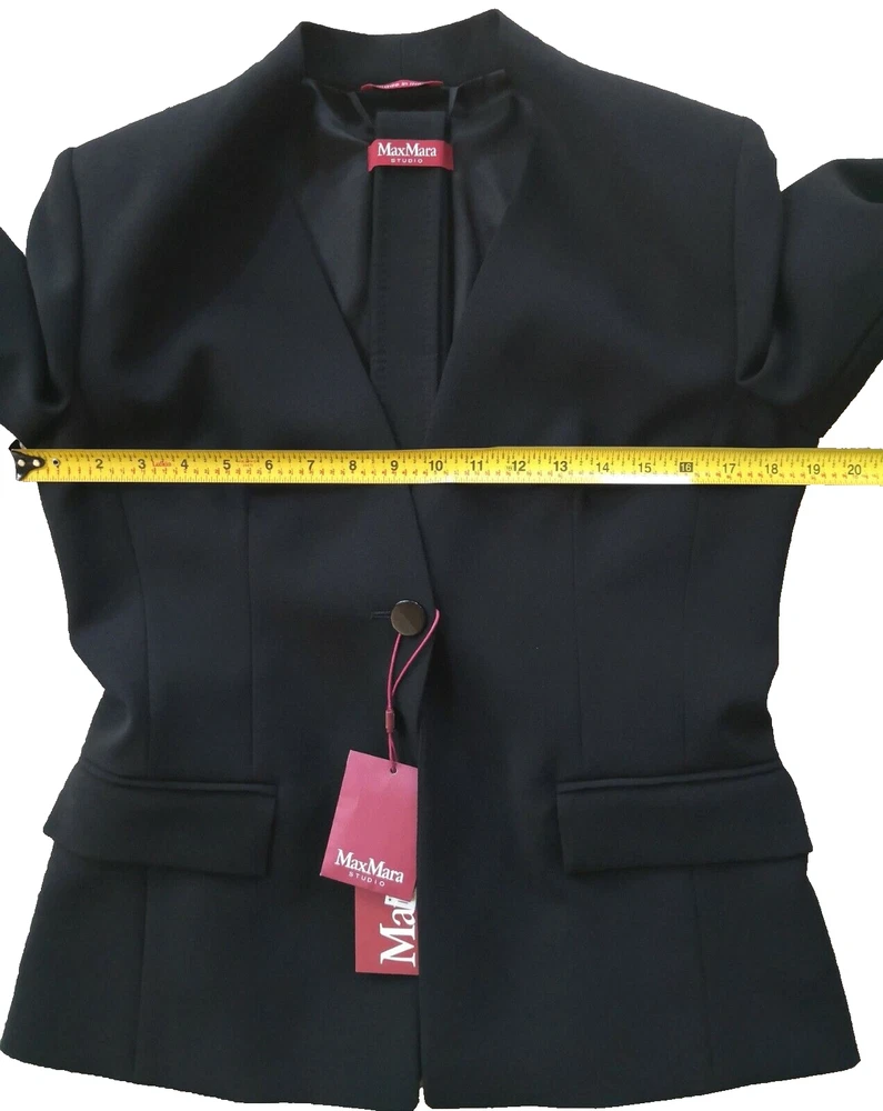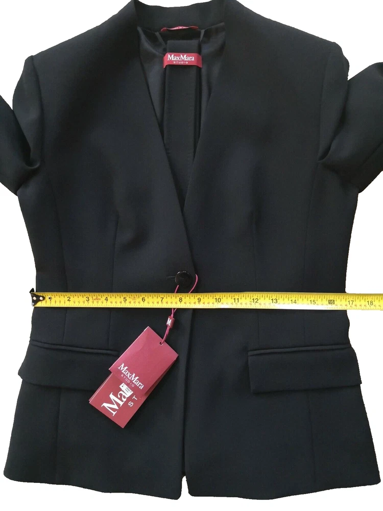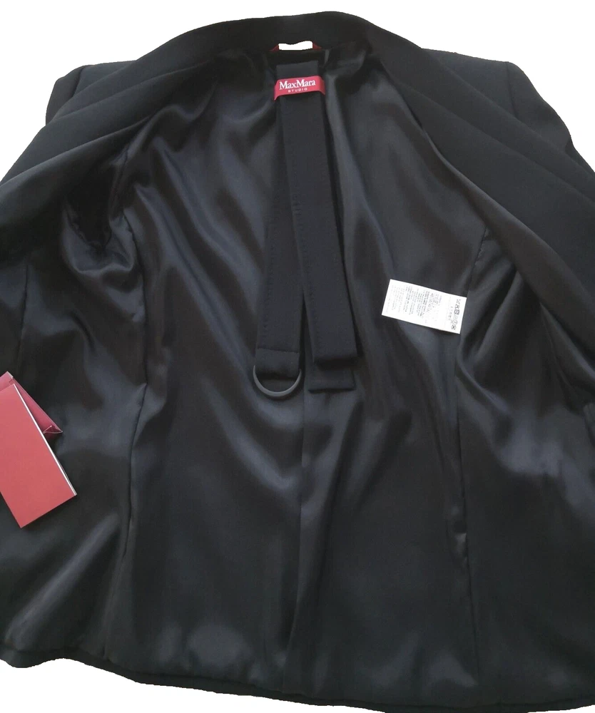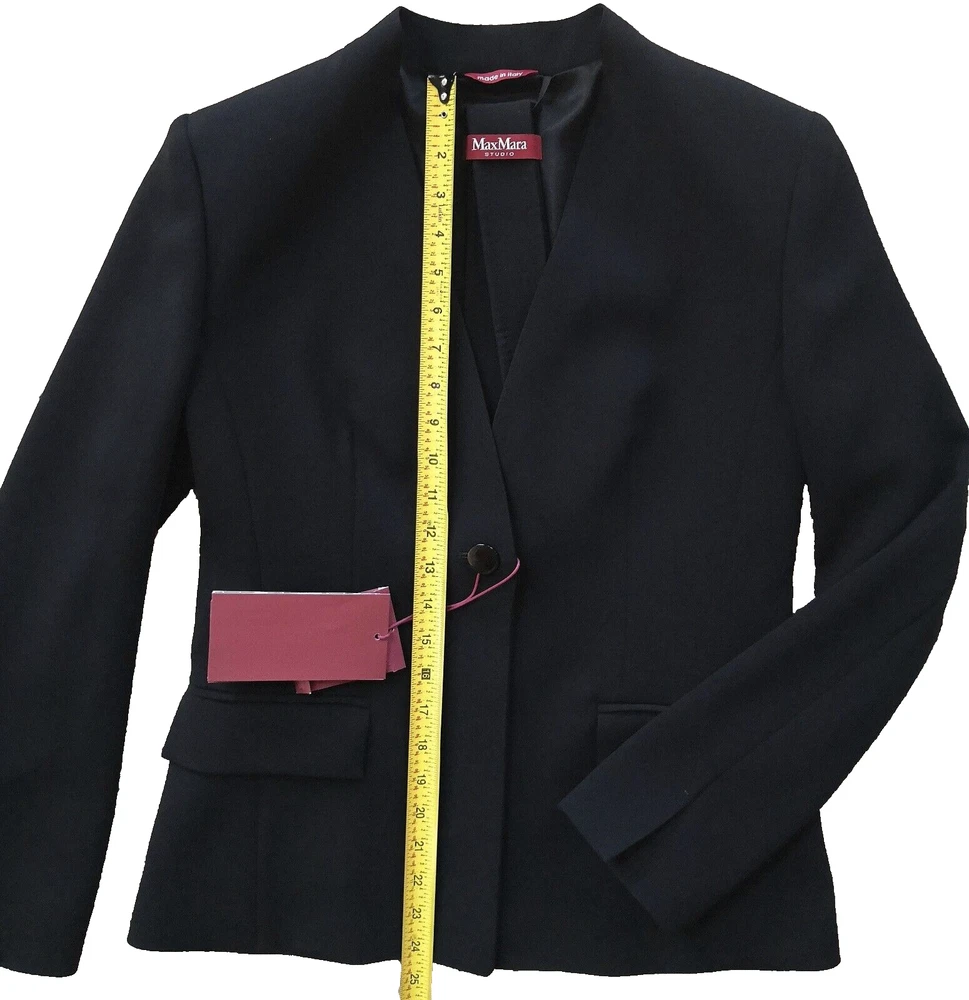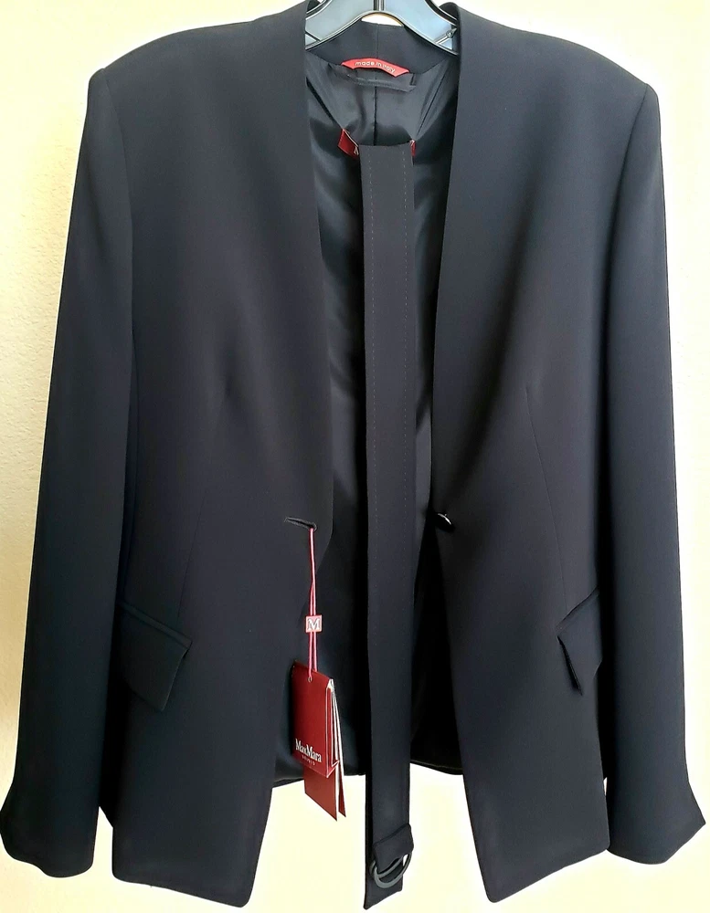 New with tags MaxMara Studio "Pincio" Fitted/Belt Real Black Hip-length V-neck No Collar Jacket in size 44IT/8-10US Orig.$695 ----Made in Italy ----very versatile and practical jacket ----Really black-black color, high quality material ----fit is smaller, but size 10US is indicated on the tag ----Waist 33.5-34in (when buttoned and on a flat surface) ----Length around chest and back 37.5-38in ----Length in the back from top to bottom is 24in ----looks very good with almost everything, also with jeans I will provide as many as asked additional photos and measurements before purchase to ensure Buyer's satisfaction. I do not have option "Or Best Offer" in my listings, do not send offers, do not have seasonal sales. Shipping rates provided to eBay by shipping companies. Buyers and Seller see the same discounted by eBay shipping rates. Signature confirmation will be required upon delivery of the parcel to a Buyer. Let me know, please, as soon as possible by leaving feedback (or starting Return process) on eBay if I can use funds from this sale. I make detailed photos of the item along with packing slip before shipping it to the Buyer ,to avoid unreasonable claims. Opening of the returned parcel will be videotaped. Returned items should be in original before purchase new condition, without any signs of wear or damage, all tags attached. No Return for parcels with shipping address from outside of the USA. Parcels to countries restricted for shipping from USA will be returned to the Seller by shipping company and shipping cost will not be refunded. Combined shipping for several items should be discussed before purchase, there is no automatic recalculation for it in my listings.