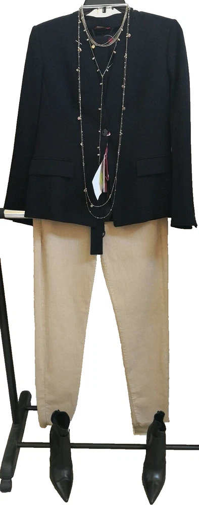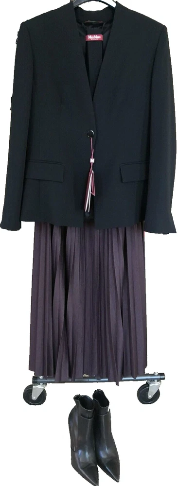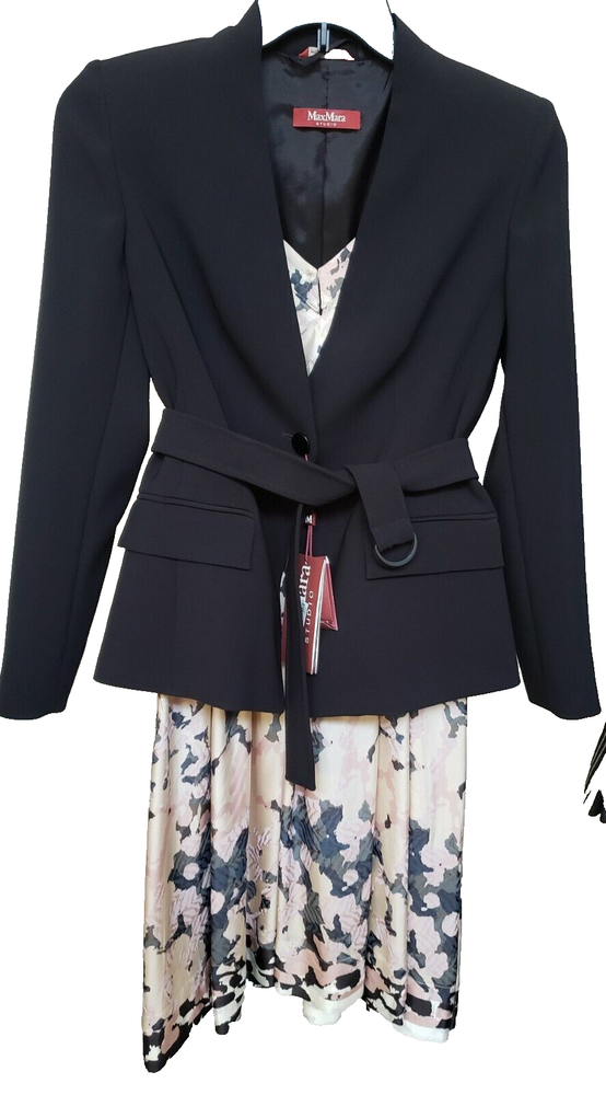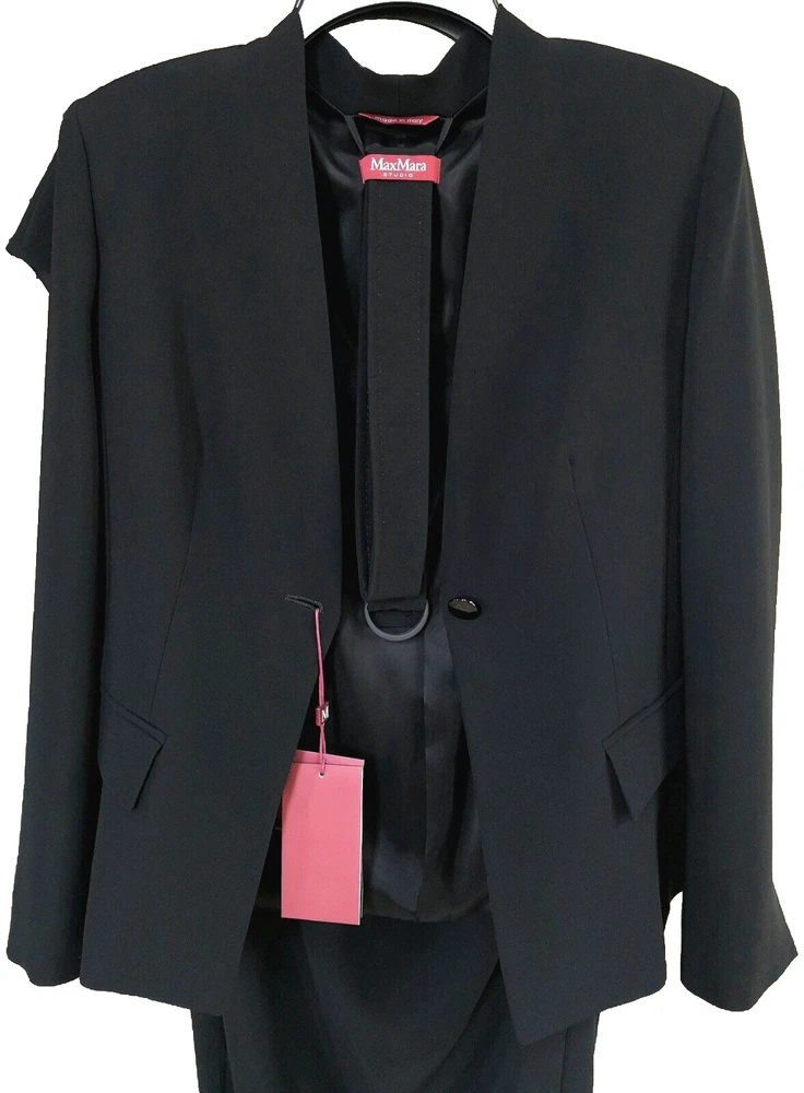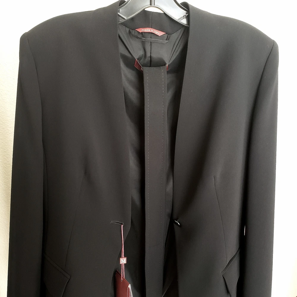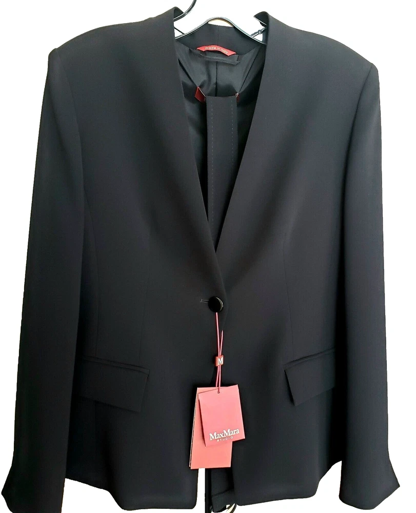 New with tags MaxMara Studio "Pincio" Fitted/Belt Real Black Hip-length V-neck No Collar Jacket in size 44IT/8-10US Orig.$695 ----Made in Italy ----very versatile and practical jacket ----Really black-black color, high quality material ----fit is smaller, but size 10US is indicated on the tag ----Waist 33.5-34in (when buttoned and on a flat surface) ----Length around chest and back 37.5-38in ----Length in the back from top to bottom is 24in ----looks very good with almost everything, also with jeans I will provide as many as asked additional photos and measurements before purchase to ensure Buyer's satisfaction. I do not have option "Or Best Offer" in my listings, do not send offers, do not have seasonal sales. Shipping rates provided to eBay by shipping companies. Buyers and Seller see the same discounted by eBay shipping rates. Signature confirmation will be required upon delivery of the parcel to a Buyer. Let me know, please, as soon as possible by leaving feedback (or starting Return process) on eBay if I can use funds from this sale. I make detailed photos of the item along with packing slip before shipping it to the Buyer ,to avoid unreasonable claims. Opening of the returned parcel will be videotaped. Returned items should be in original before purchase new condition, without any signs of wear or damage, all tags attached. No Return for parcels with shipping address from outside of the USA. Parcels to countries restricted for shipping from USA will be returned to the Seller by shipping company and shipping cost will not be refunded. Combined shipping for several items should be discussed before purchase, there is no automatic recalculation for it in my listings.