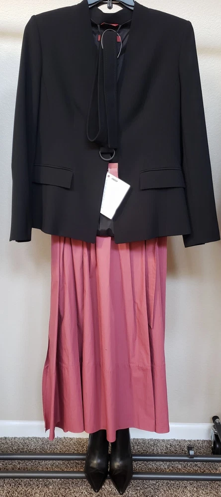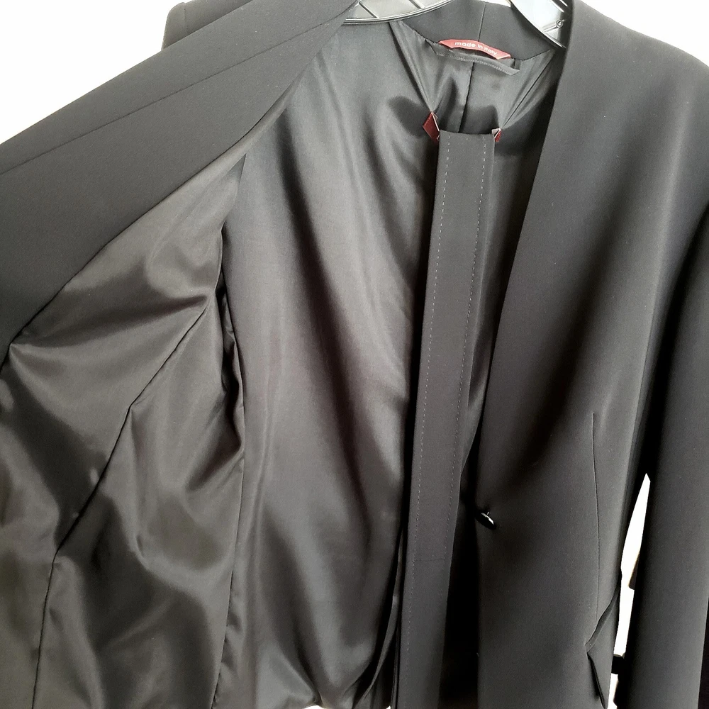 This jacket is absolutely stunning! The sleek black design is so versatile—it pairs effortlessly with jeans or dressier outfits. The high-quality Italian craftsmanship is evident in the fine fabric and perfect stitching. The fitted, belted waist gives a flattering silhouette, though it runs slightly small, so keep that in mind. The V-neck adds a chic touch, and the lack of collar keeps it modern. Lightweight yet structured, it’s ideal for layering or wearing alone. A timeless piece that elevates any wardrobe—worth every penny!