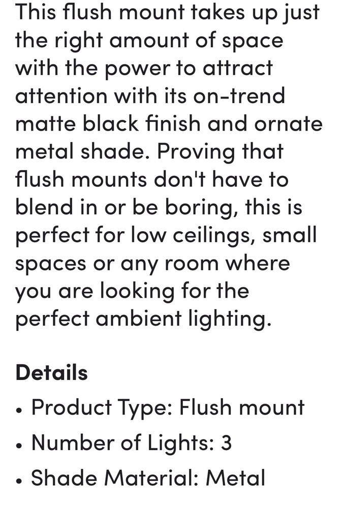 Love this sleek black flush mount! The modern design adds a bold yet elegant touch to any room. The three lights provide just the right amount of brightness without being harsh. Perfect for entryways, bedrooms, or even over a dining table. High-quality finish and sturdy construction—looks way more expensive than it is. Great deal for brand new fixtures in unopened boxes! Highly recommend for anyone wanting a stylish upgrade.