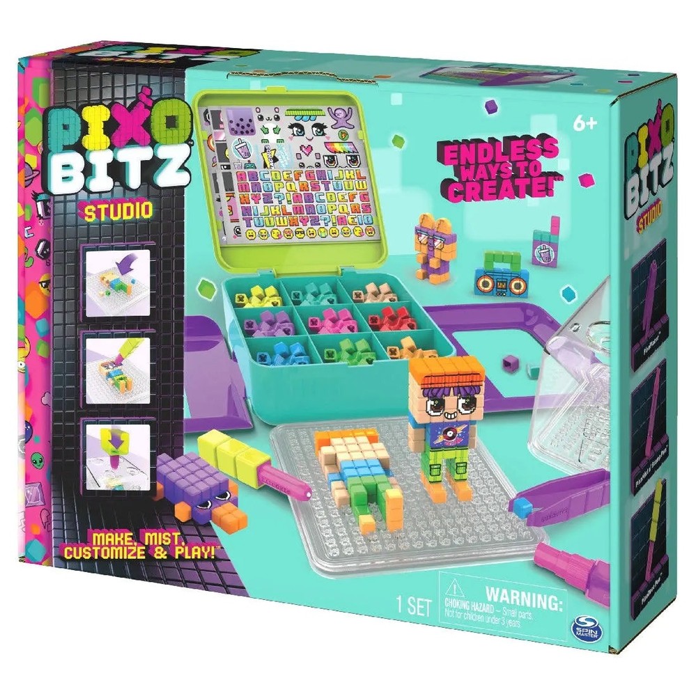 Experience a new dimension of creativity with the Pixobitz Studio! This DIY studio has everything you need to make your own 3D and 2D pixel art creations that stick together with water. The Pixobitz Studio features 500 Bitz (cube-shaped water fuse beads) in 10 colors, 14 accessories, over 100 water transfer decos, four easy-to-use tools, two trays and three template cards. Following the templates in this bead kit, make 12 amazing end results, including cool avatars, adorable animals, photo holders, a boombox, skateboard and more, or design your own unique creations. Creating with Pixobitz is as easy as stack, spray, and style! Slide a template under a tray and use the tools to help you build. Lay out your Bitz on the tray – the cube design makes them easy to stack, preventing them from rolling away. Mist each layer, then style your creation! Choose from different water deco eyes, facial expressions, outfits, letters, icons and more, and accessories including ears, hair buns, keychains and more. With so many Bitz, water decos and accessories, there are endless ways to create! For best results, wait 20 minutes after each layer and 45 minutes for your Pixobitz bead art to fully set before play. Use your creations in imaginative pretend play or display them as creative kids room decor! For easy organization and storage, the Pixobitz Studio closes into a carrying case and fits everything inside – take it with you on-the-go! The Pixobitz Studio and the Clear and Metallic Bead Packs (each sold separately) are fun kids crafts, perfect toys for girls and boys who like arts and crafts projects, DIY kits and toy building sets. They’re great birthday gifts for kids, Christmas gifts or gifts for any occasion. Unleash your creativity with the Pixobitz Studio! NO HEAT NEEDED: The mess-free Bitz (cube-shaped beads) stick with water! Stack on the tray, spray each layer and style with unique Pixobitz accessories and water transfer decos! LlENDLESS WAYS TO CREATE: With 14 accessories like keychains and photo clips and over 100 decos like facial expressions, outfits, letters and more, style your way! Follow the templates or make your own creations! ALL-IN-ONE WATER FUSE BEADS CRAFT KIT: Make 3D and 2D creations like avatars, a boombox and more with 500 Bitz in 10 colors, 4 tools, 3 templates (for 12 designs), 14 accessories and over 100 water decos! EASY STORAGE: The Pixobitz Studio toy fits everything inside and becomes a carrying case. Store the water fuse beads kit with your crafts and art supplies or take it on-the-go! Pixobitz crafts for kids are great gifts! FUN ARTS & CRAFTS TOYS FOR 6 YEAR OLD GIRLS AND BOYS: Discover endless ways to create with Pixobitz! Perfect toys for creative kids who enjoy DIY, self-expression, craft kits, building toys and more. Includes: 1 Pixobitz Studio, 500 Bitz (Cube-Shaped Water Fuse Beads) in 10 Colors, 14 Accessories, 1 Water Transfer Deco Sheet, 4 Tools, 2 Trays, 3 Templates, 1 Instruction Guide WARNING: CHOKING HAZARD - Small parts. Not for children under 3 years. Covered by the Spin Master Care Commitment. If you have a problem with a Spin Master product that you purchased from an authorized seller, we’ll resolve it! Because Spin Master is unable to control the quality of products sold by unauthorized sellers, unless otherwise prohibited by law, the Care Commitment is not available for products purchased from unauthorized sellers. The Care Commitment is limited to the original end-user purchaser. You may also be required to provide proof of purchase and/or a picture of your product to Spin Master to verify eligibility. Spin Master reserves the right to verify information, require a valid proof of purchase, and to deny request in its discretion