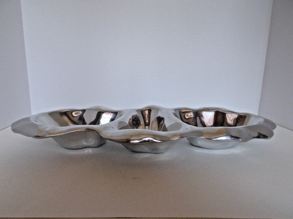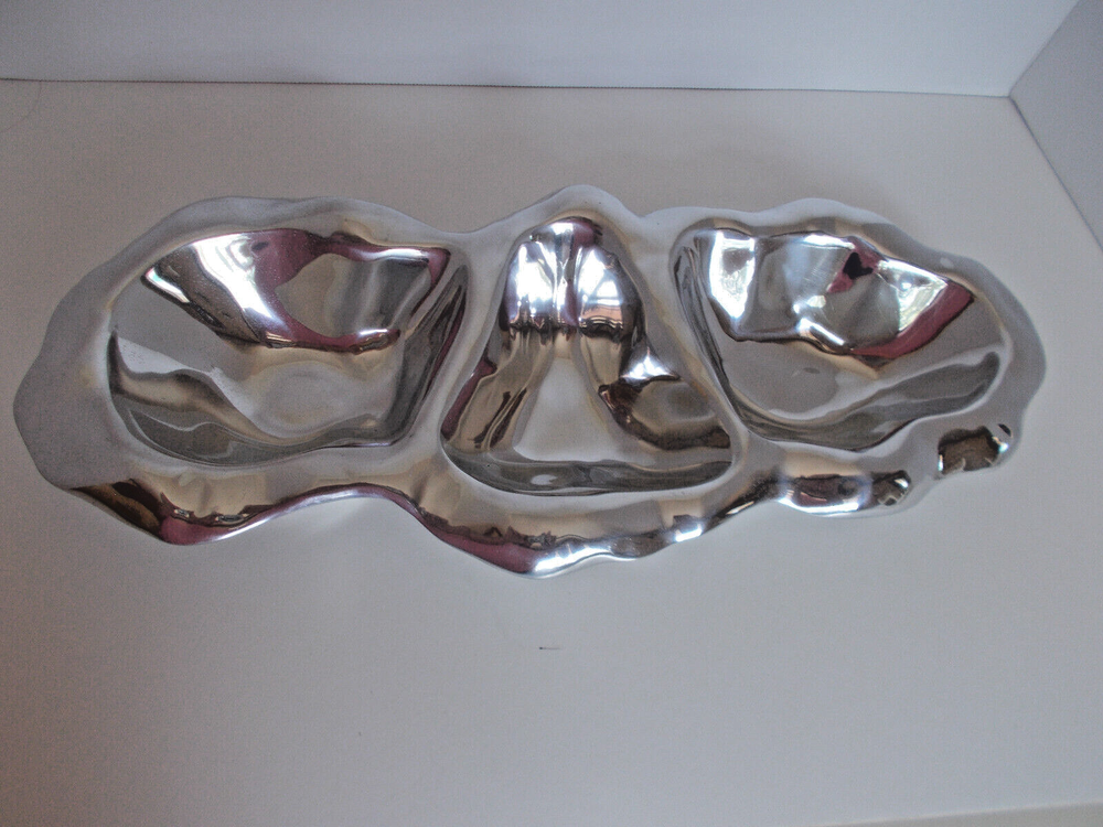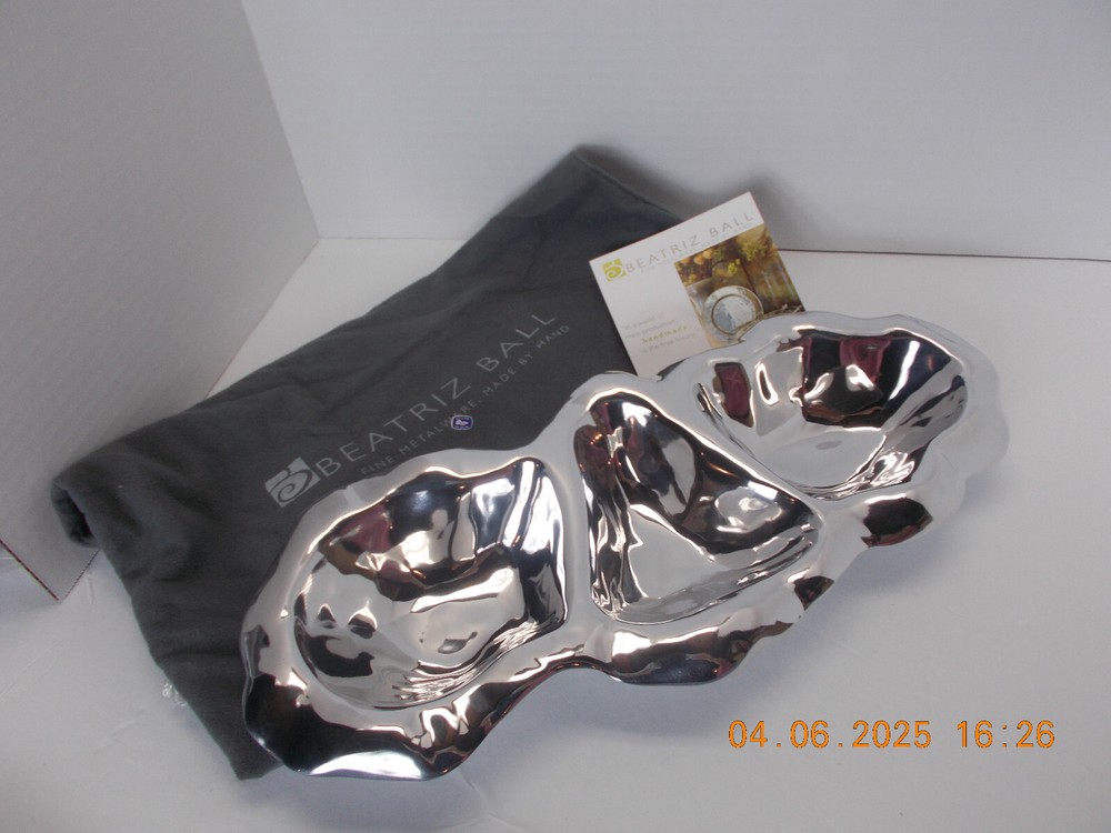 New in flannel dust bag beautiful Polished Aluminum Beatriz Ball Fine Metalware large dip or relish bowl tray. Made of eco-friendly 100% recycled aluminum. Elegant and practical designs are easy care and lustrous and will be your choice for special occasions as well as everyday use. Each piece made one at a time and each piece one of a kind. Using the same ancient method of casting used by Greeks and Romans to create masterpieces, molten aluminum alloy is poured into individual sand molds, then hand polished to a deep lustrous finish. Of heirloom quality, your piece will not tarnish or lose its shine.