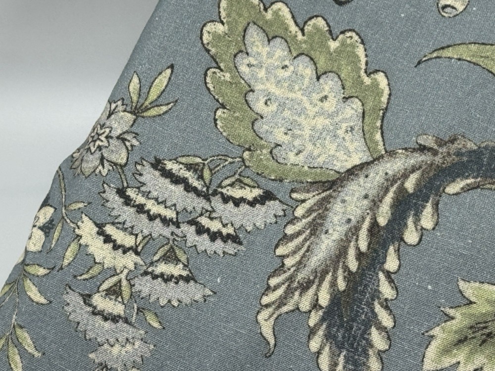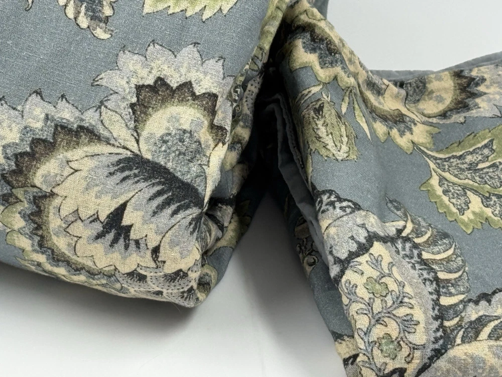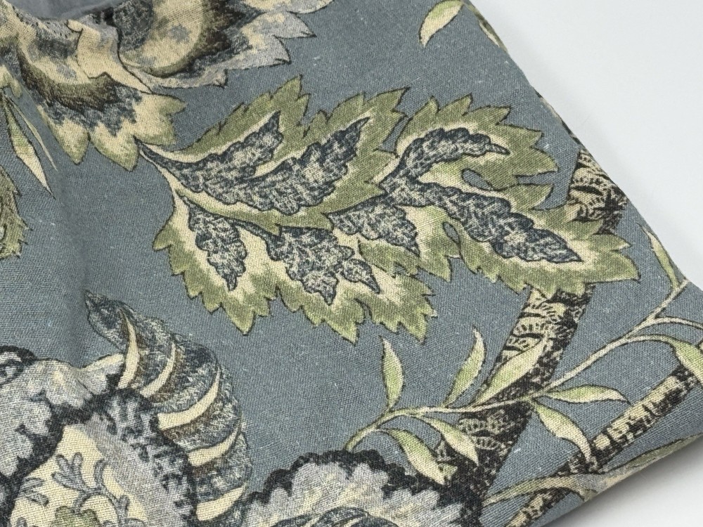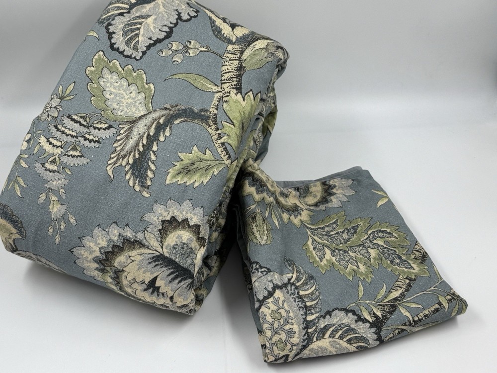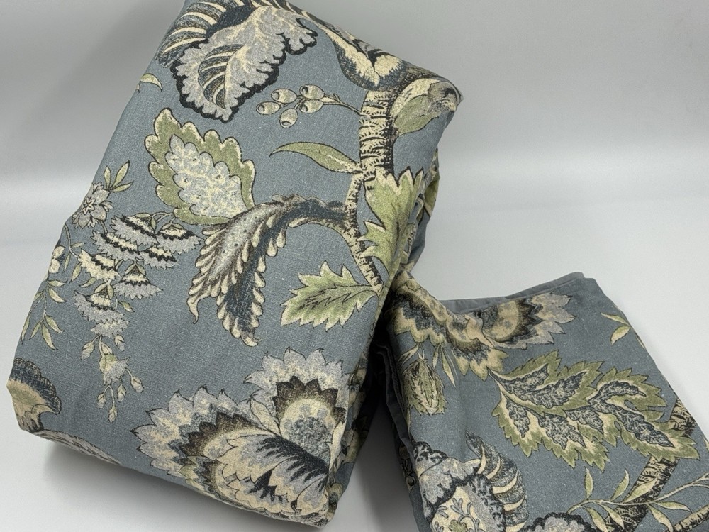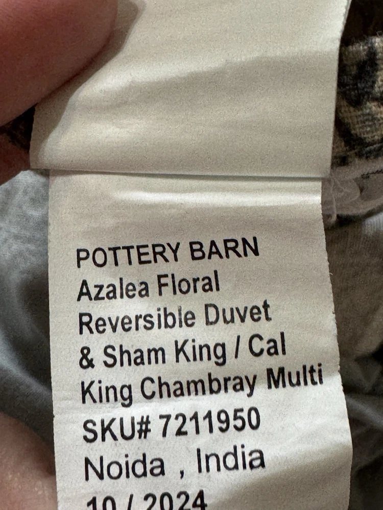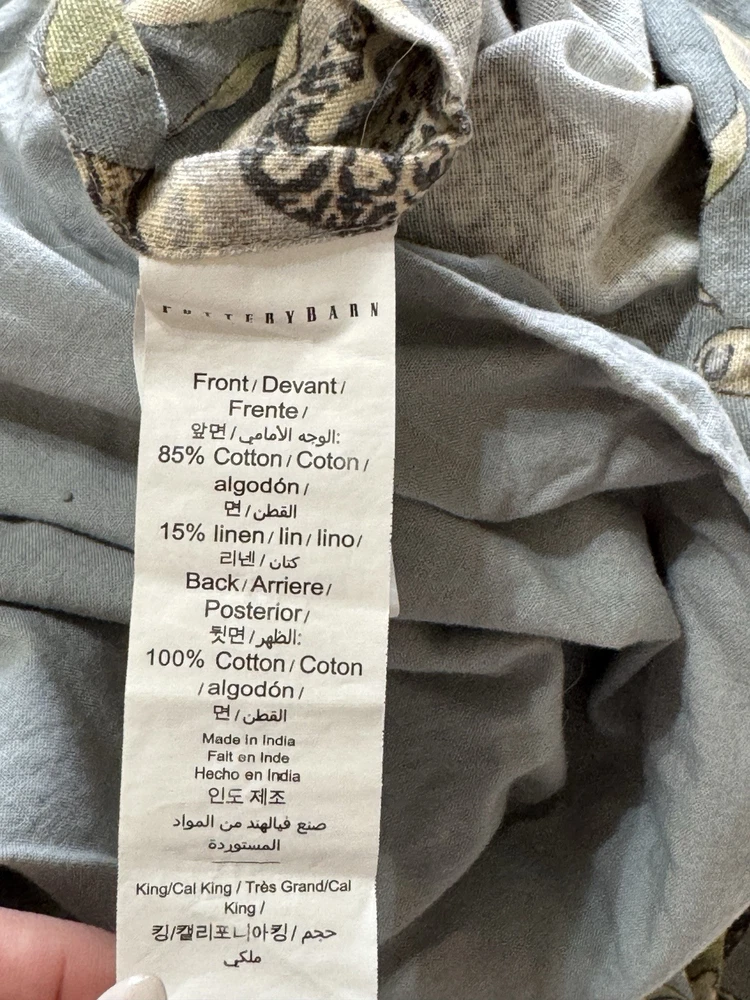 New Pottery Barn Azalea Palempore Duvet King/ Cal King + 1 King Sham This is an open box item. An Open Box item does not include any original packaging. Item is unused, but may arrive slightly more wrinkled than a packaged item and/or have stray hair or fibers. Front is woven from 85% cotton and 15% linen. Back is woven from 100% cotton sheeting. Duvet features a hidden button closure with inner ties that keep insert in place; sham features an envelope closure. King/Cal. King: 92" w x 108" l Sham: 20x36”