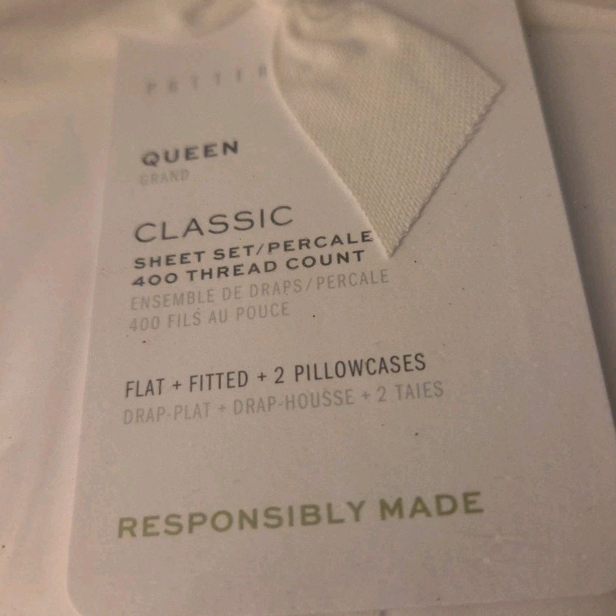The Pottery Barn Classic 400-Thread-Count Sheet Set in White, size Queen, is a luxurious addition to any bedroom. Made from 100% cotton with a high thread count of 400, these sheets are not only soft and comfortable but also durable and long-lasting. The solid white color and classic style make them versatile enough to complement any room decor. Perfect for creating a cozy and inviting space to relax and unwind.