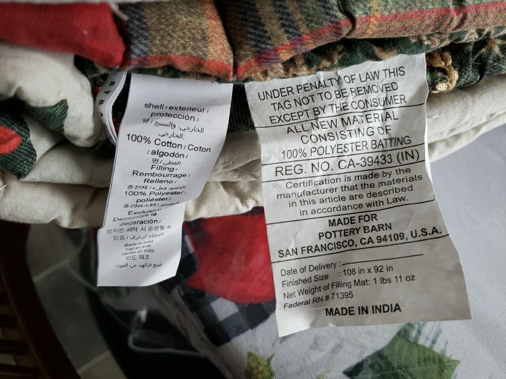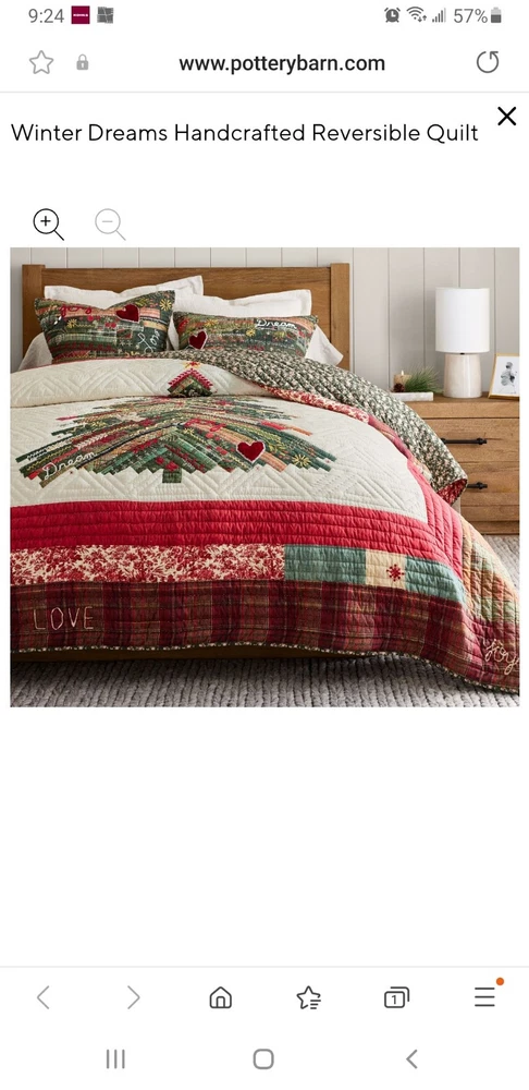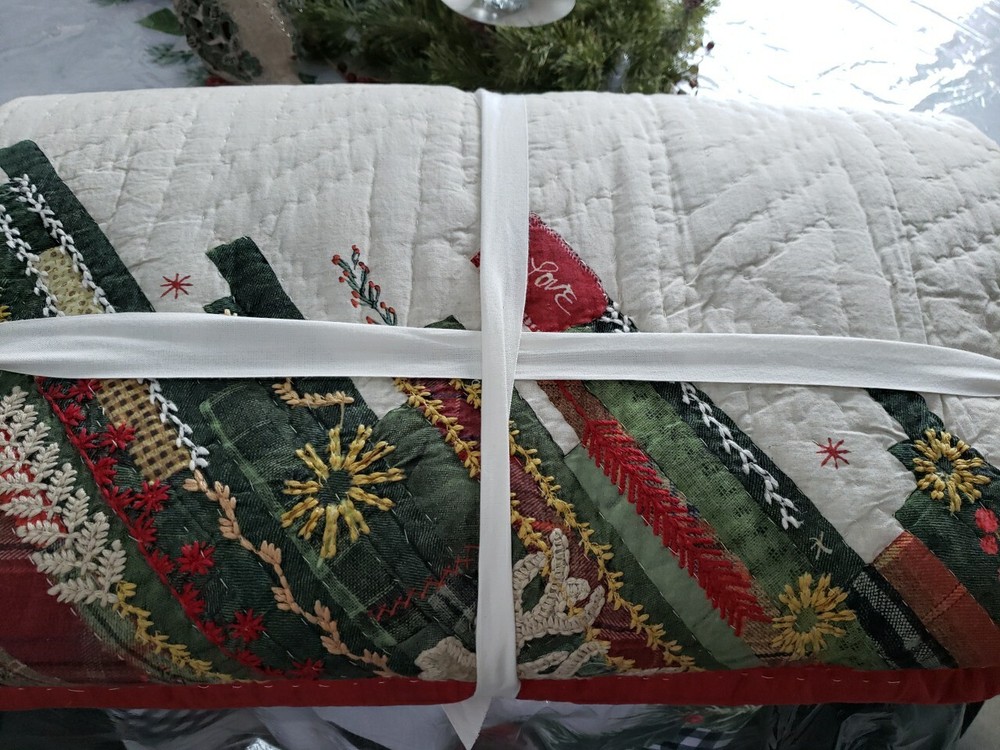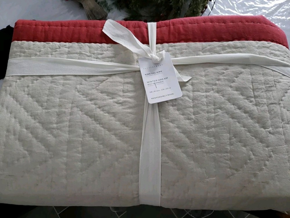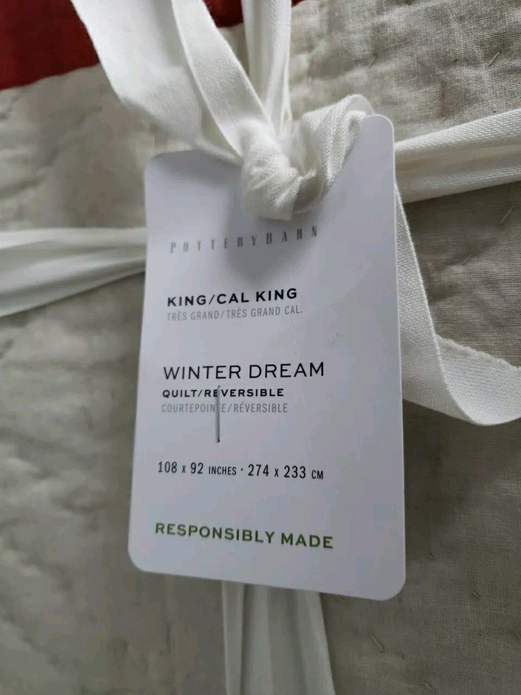 This is a New Pottery Barn Christmas Winter Dream King Quilt featuring a Christmas tree pattern with a farmhouse style and one 26x16" coordinating pillow cover (pillow not included). Handcrafted and quilted, this multicolor quilt is designed for a festive holiday touch in the bedroom. With dimensions of 108 inches in length and 92 inches in width, it is suitable for a King-sized bed. The design is centered around the character of a Christmas tree, making it a cozy and charming addition to your holiday decor. Brand new as shown