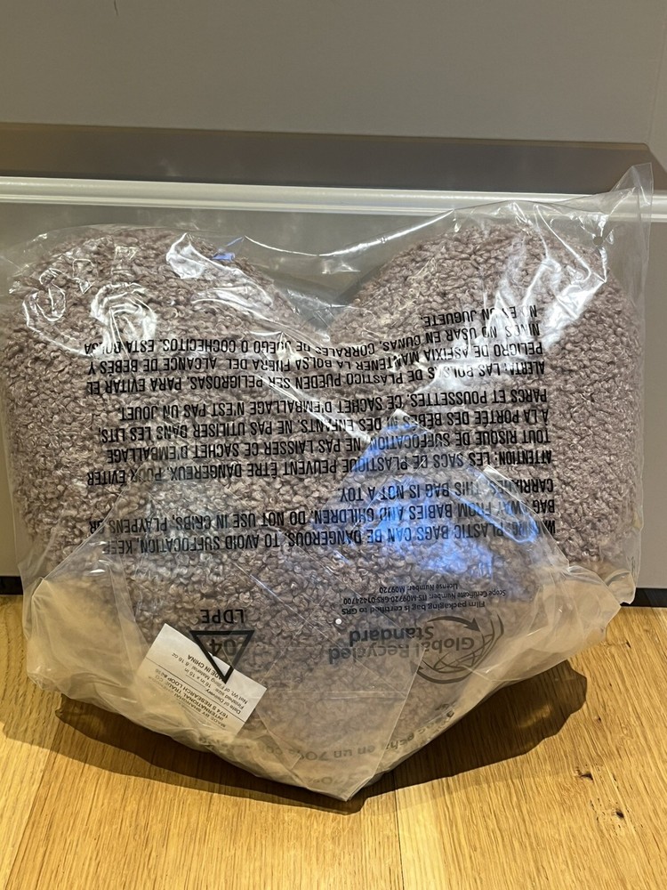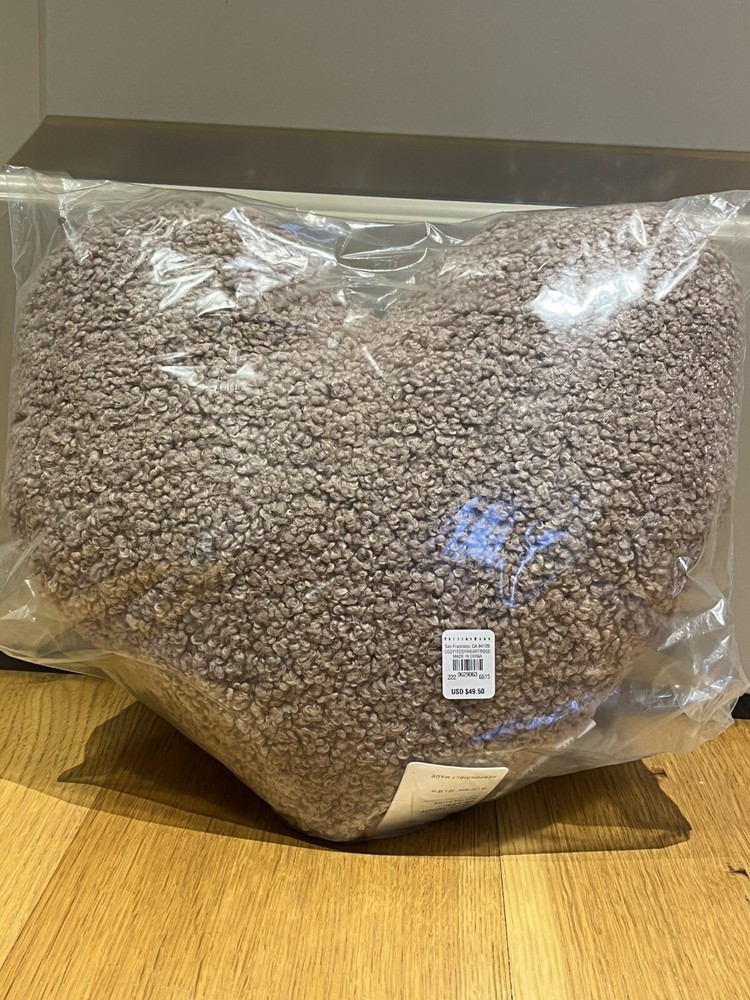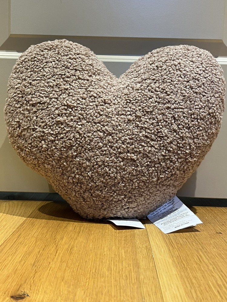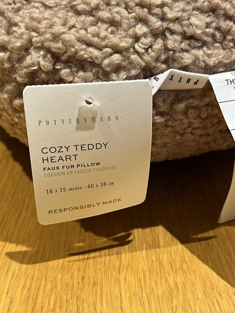 This is a new Pottery Barn decorative pillow featuring a heart pattern, perfect for adding a cozy touch to any space. The pillow measures 16 x 15 inches and showcases a charming pink color that enhances its love and hearts theme. Whether used as a stylish accent piece on a bed or sofa, this adorable teddy heart pillow will surely bring a touch of warmth and personality to any room.