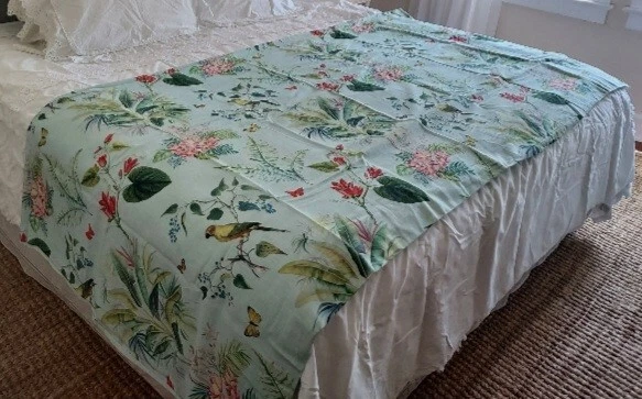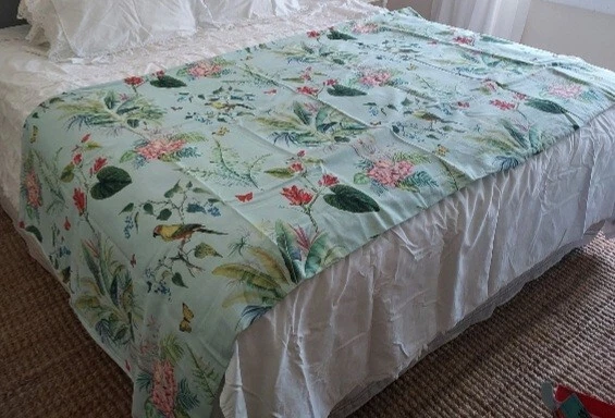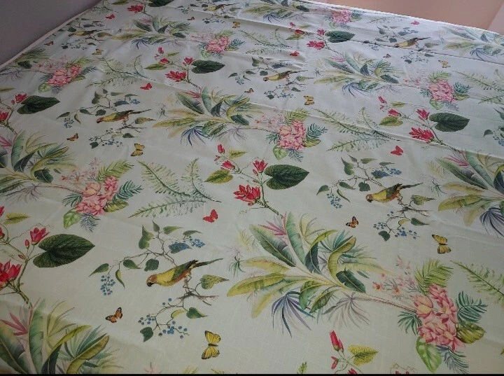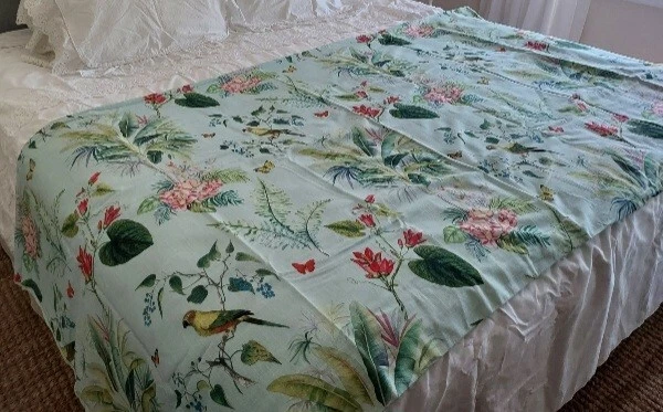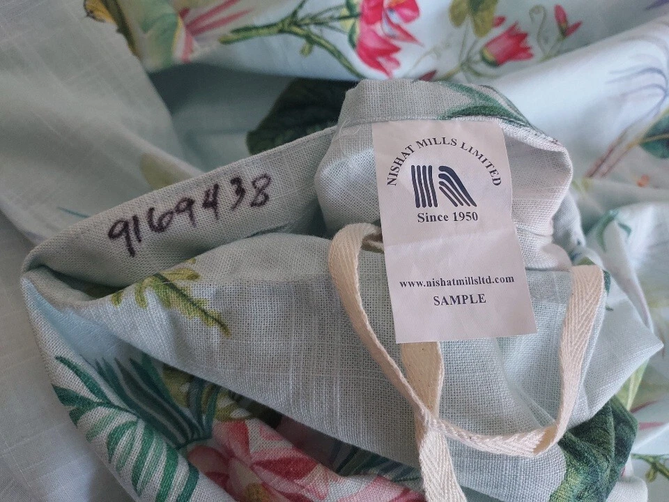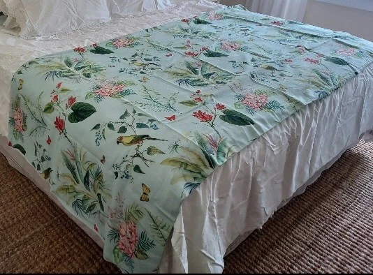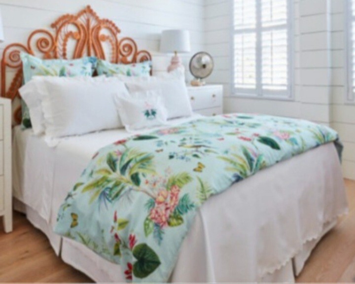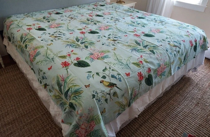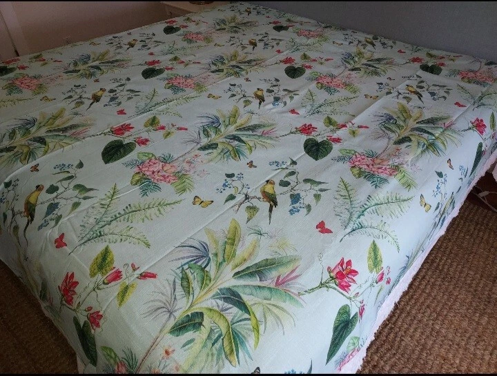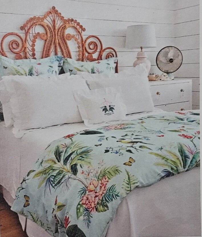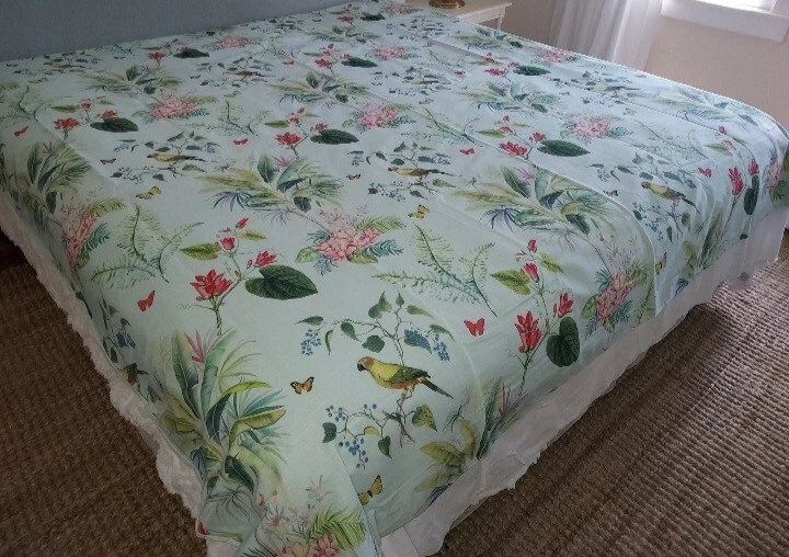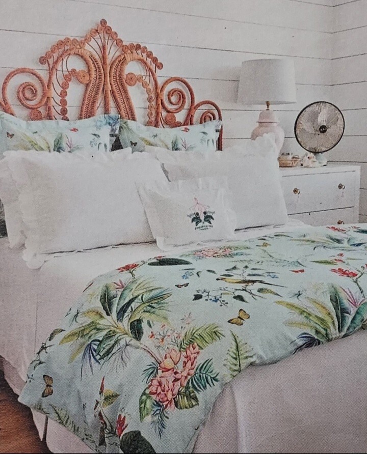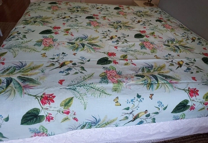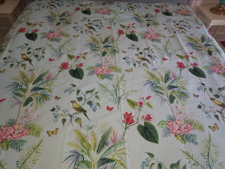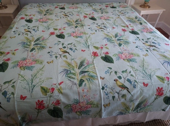 Add a touch of tropical paradise to your bedroom with this beautiful Pottery Barn duvet cover. Featuring a vibrant palm parrot pattern on a multicolor background, this cover is sure to brighten up any space. Made of 100% cotton and measuring 87" in length and 91.5" in width, this full queen cover is perfect for any bedroom. The closure type is buttons, making it easy to remove and wash. This rare find is a must-have for anyone who loves unique and stylish bedding. This beautiful Pottery Barn duvet cover in the Lia Palm print was featured in magazines and websites as shown in some of the pictures, most notably the Pineapple Pad on Palm Beach Island. It is in new condition, never used. The fabric is a heavy cotton, made in Pakistan at the Nishat Mills, for Pottery Barn. The tag shows it as a sample and the inventory number is written on the inside of the button closure area, not visible from the outside. The width is 91.5" inches. The length from head to foot is 87" inches. These are rare and very hard to find, especially in new, unused condition. Please ask questions before buying. The bed in the pictures where the cover is layed flat is a king size bed. Please keep in mind that the pictures were taken various lighting, some natural daylight, some flash, some professional camera, some smartphone. And dye lots can vary. Shipped USPS PRIORITY MAIL, large flat rate box. Returns not accepted. Item is described very well. Shipping in the u.s.a. only. U.s.a. buyers only. Will not ship to third party shipping companies.