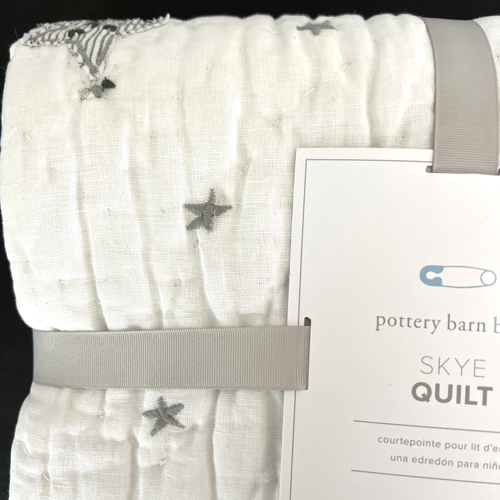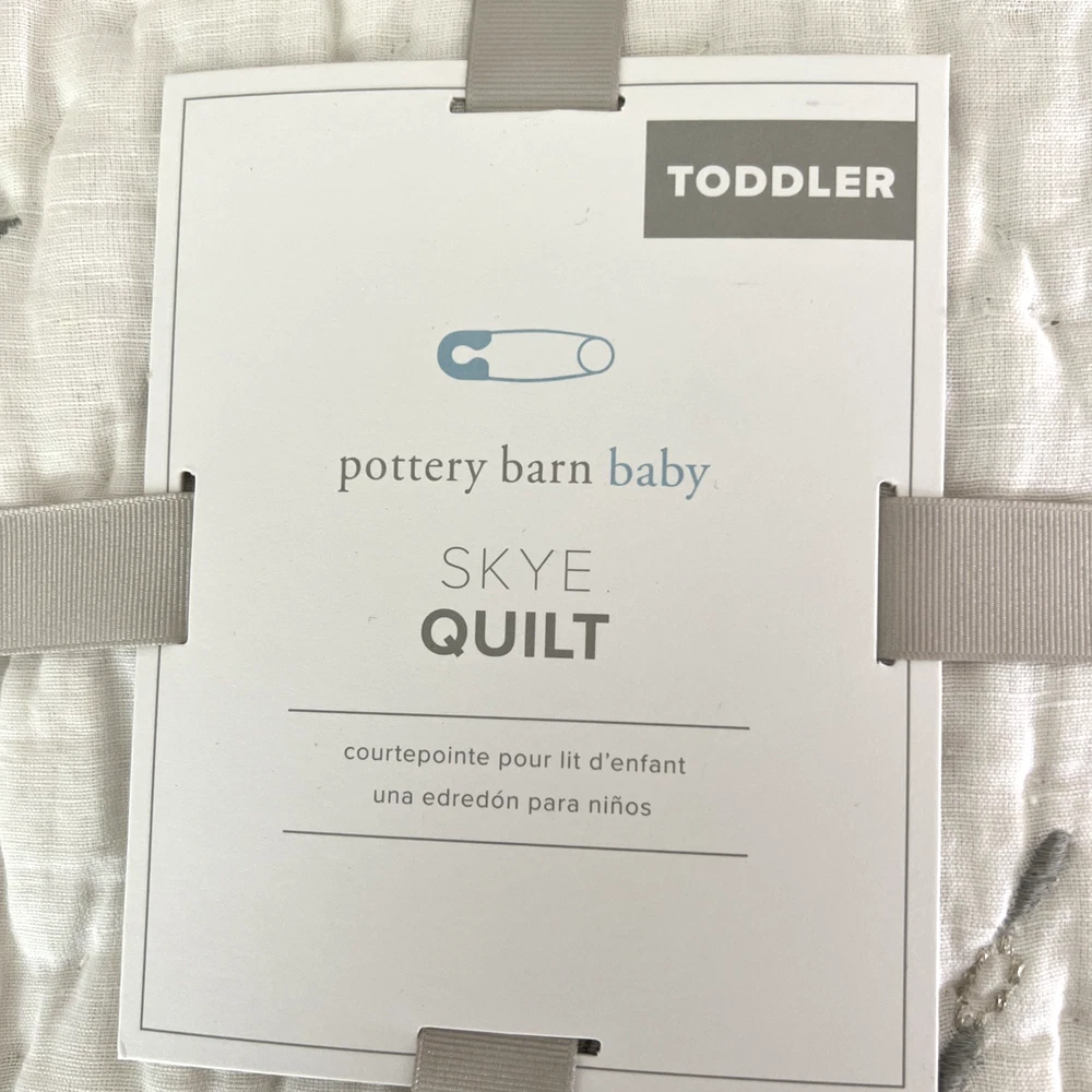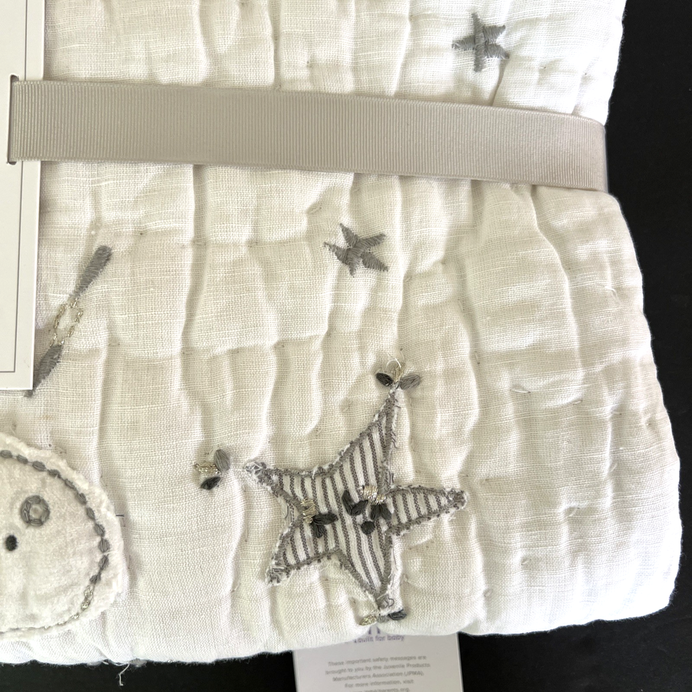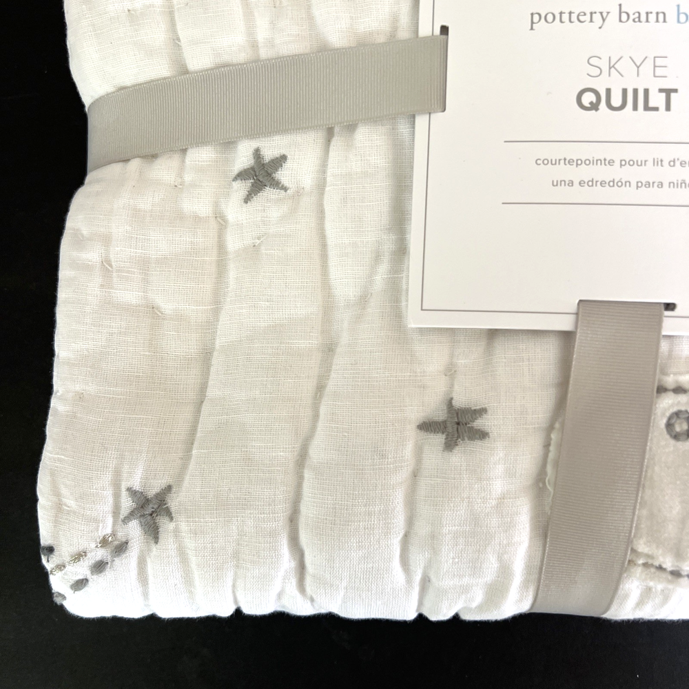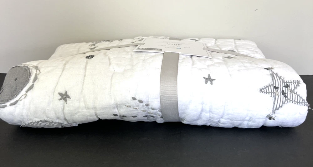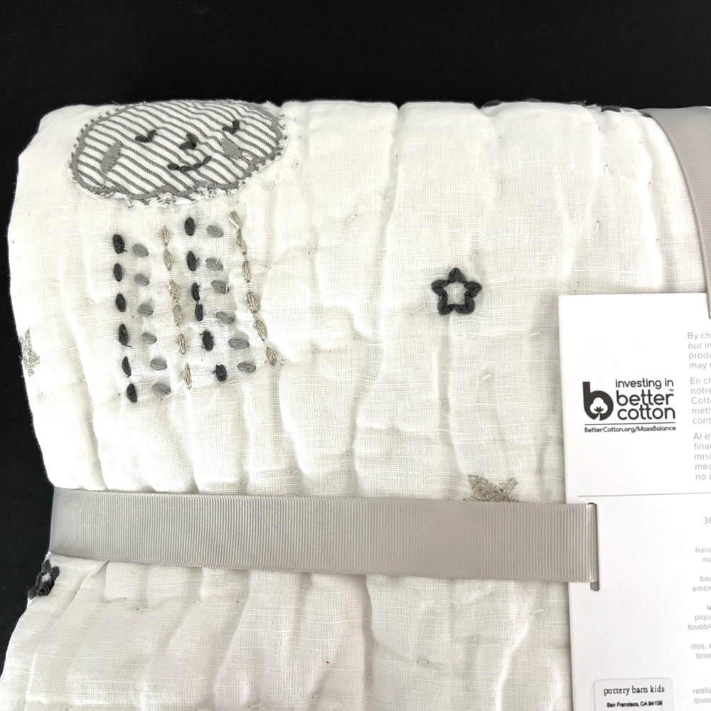 The New Pottery Barn Kids Baby/Toddler Skye Quilt in white features a charming design of suns, moons, stars, and clouds, perfect for a toddler's bedroom. Made with a front of 54% linen and 46% cotton, and a back of 100% cotton, this quilt is not only stylish but also comfortable for your little one. With dimensions of 50" in length and 36" in width, this cozy quilt from Pottery Barn Kids is sure to add a touch of whimsy to your child's room. Please refer to all photos for additional details.