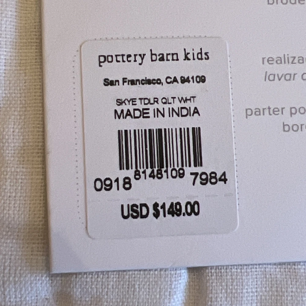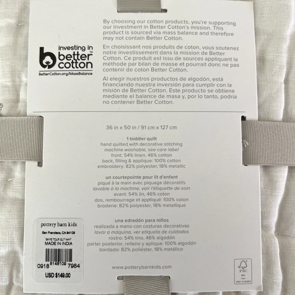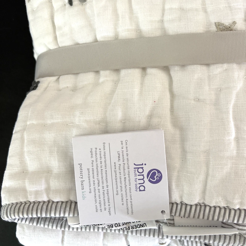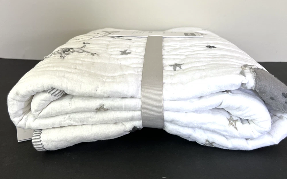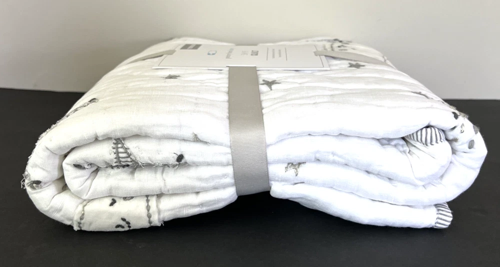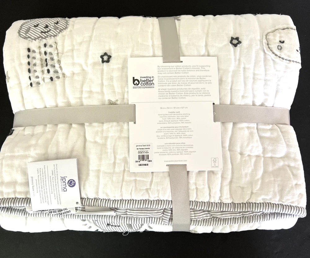 The New Pottery Barn Kids Baby/Toddler Skye Quilt in white features a charming design of suns, moons, stars, and clouds, perfect for a toddler's bedroom. Made with a front of 54% linen and 46% cotton, and a back of 100% cotton, this quilt is not only stylish but also comfortable for your little one. With dimensions of 50" in length and 36" in width, this cozy quilt from Pottery Barn Kids is sure to add a touch of whimsy to your child's room. Please refer to all photos for additional details.