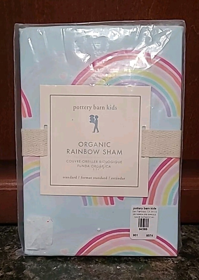 New Pottery Barn Kids Organic Rainbow Pillow Sham Blue Standard Cover Cotton Brand new in package. Blue background with multi-colored rainbows. 100% organic cotton. Smoke and pet free home.