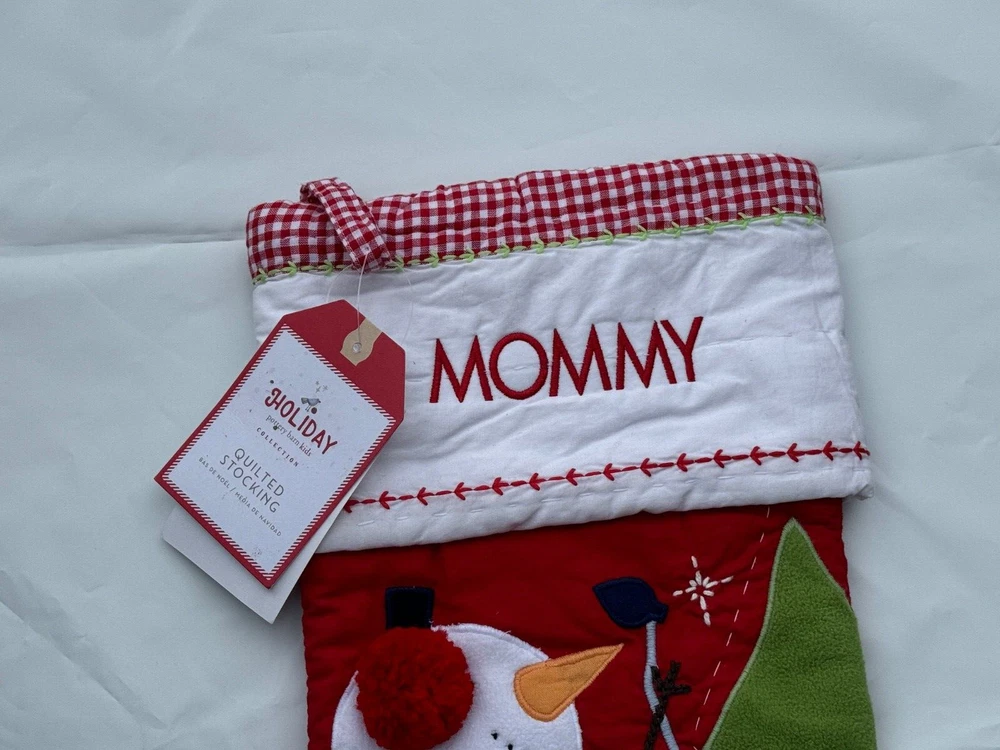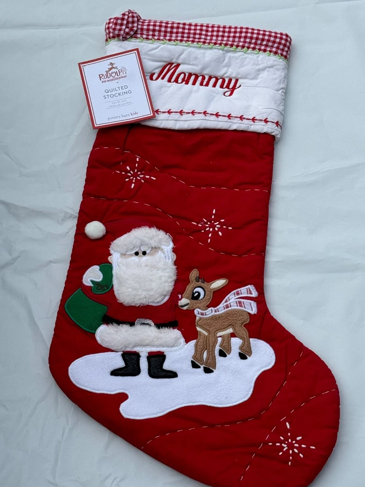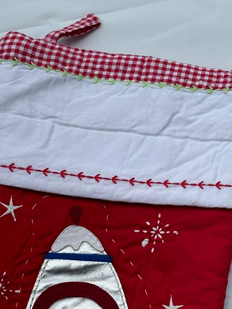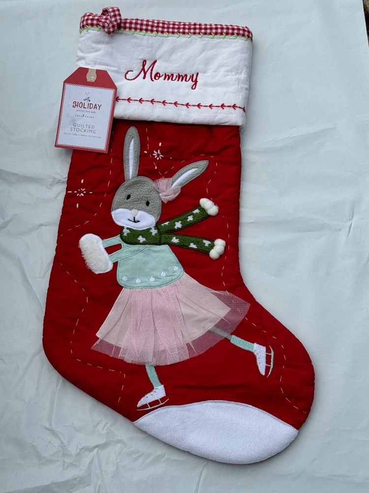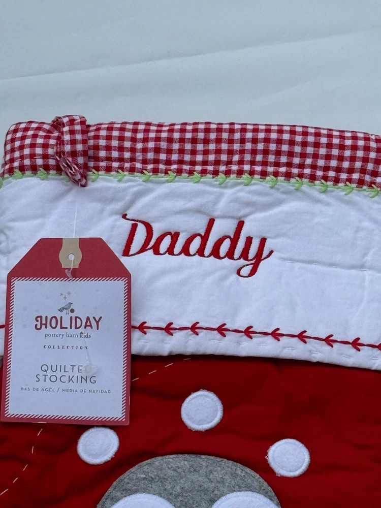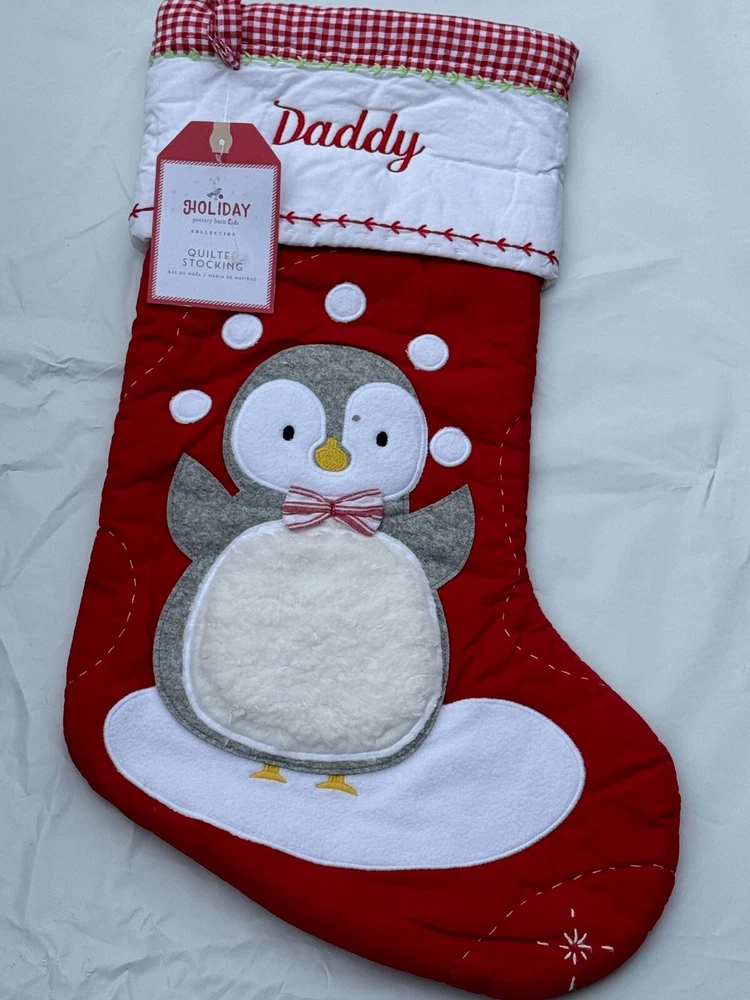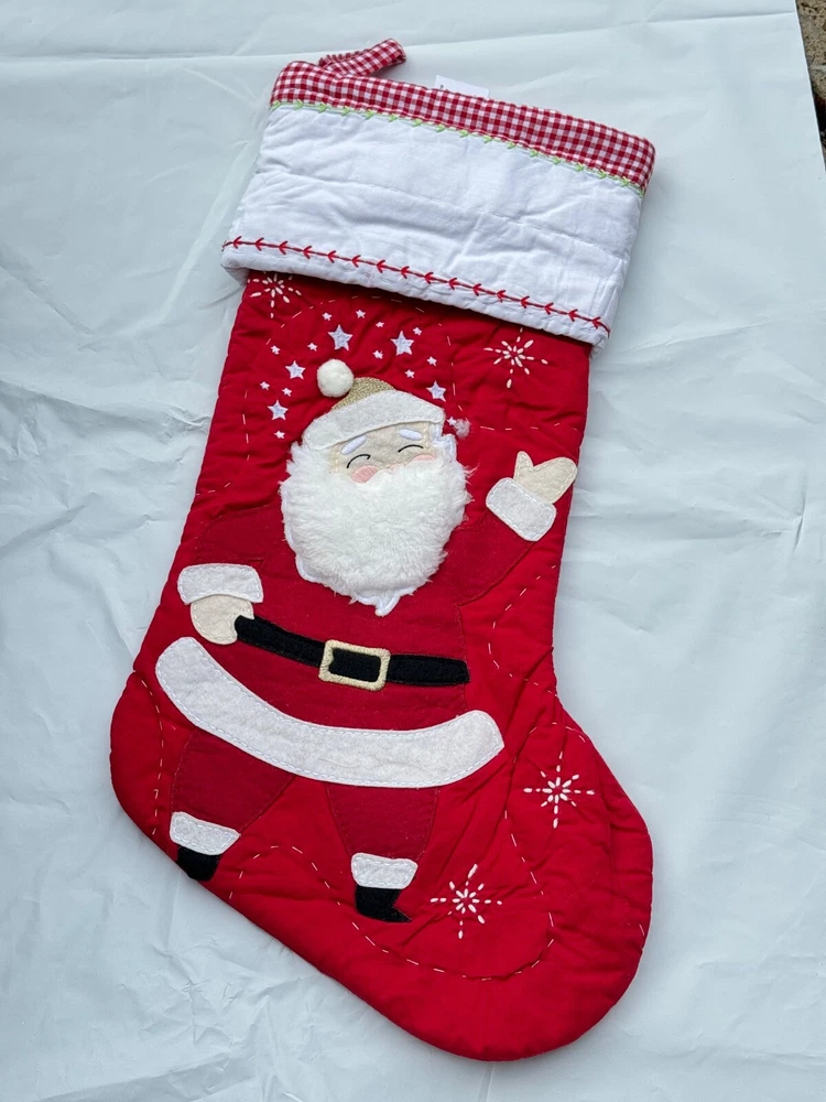 New Pottery Barn Kids Quilted Stocking Designs and monograms vary by selection. These Quilted Stockings are designed by our own artists with vivid and intricate 3-D details, appliqués and embroidery. Made from 100% cotton sheeting, lined with 100% polyester and filled with 100% cotton batting. Cuffs are made of 100% cotton percale. Stockings are yarn-dyed – fibers are treated individually with environmentally safe dyes before weaving to offer vibrant, lasting colors. DIMENSIONS Overall: 11" wide x 20" long Cuff: 5.5" high Length from top of cuff to heel: 20" long Length from heel to toe: 11" long Hanging Loop: 2.5" long Weight: 0.5 lbs