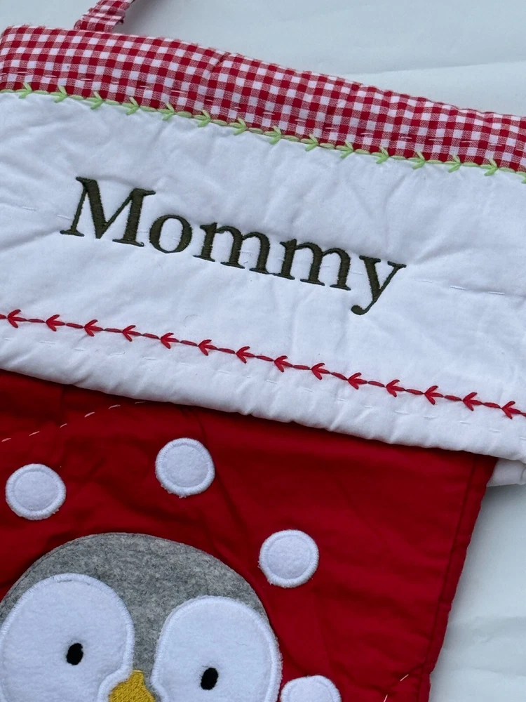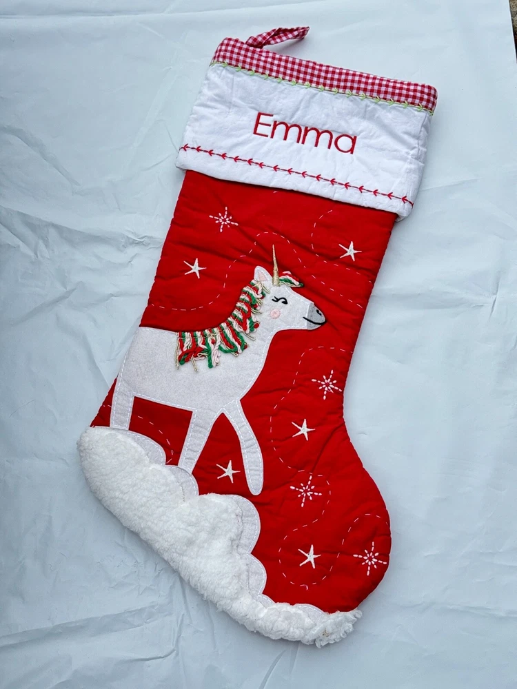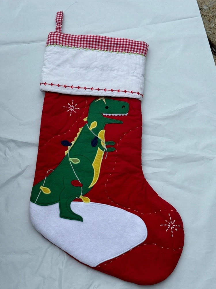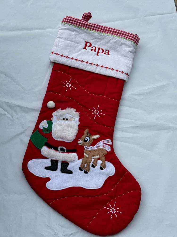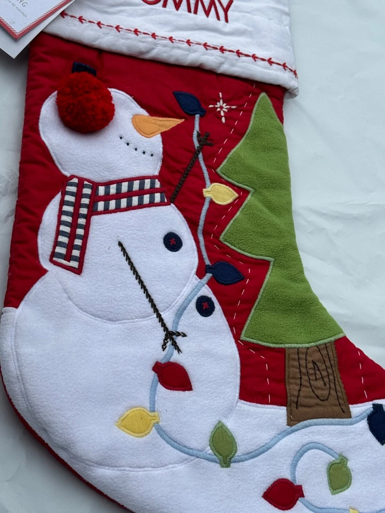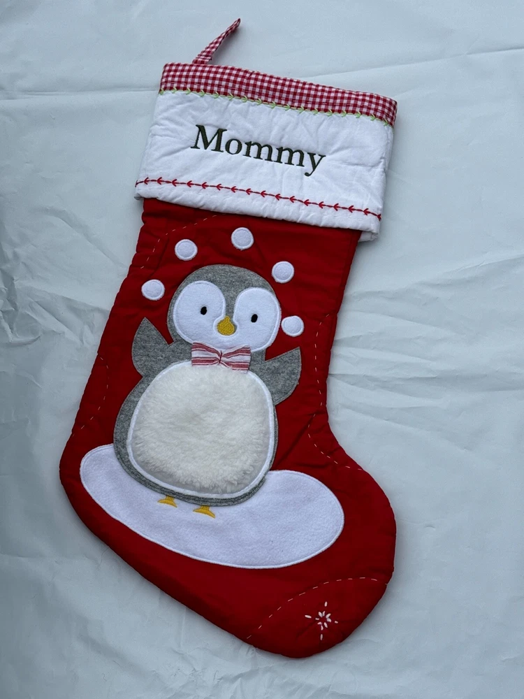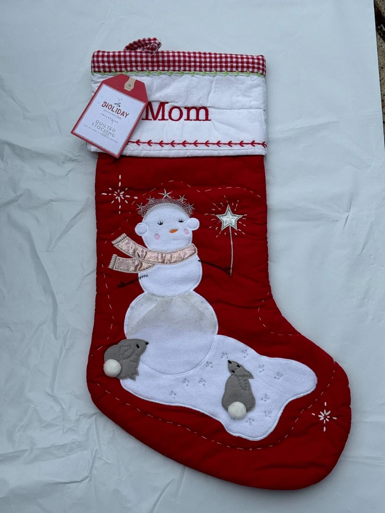 New Pottery Barn Kids Quilted Stocking Designs and monograms vary by selection. These Quilted Stockings are designed by our own artists with vivid and intricate 3-D details, appliqués and embroidery. Made from 100% cotton sheeting, lined with 100% polyester and filled with 100% cotton batting. Cuffs are made of 100% cotton percale. Stockings are yarn-dyed – fibers are treated individually with environmentally safe dyes before weaving to offer vibrant, lasting colors. DIMENSIONS Overall: 11" wide x 20" long Cuff: 5.5" high Length from top of cuff to heel: 20" long Length from heel to toe: 11" long Hanging Loop: 2.5" long Weight: 0.5 lbs