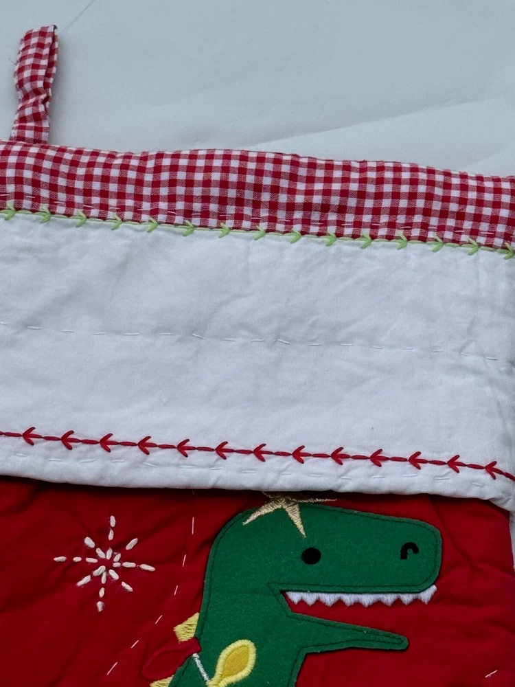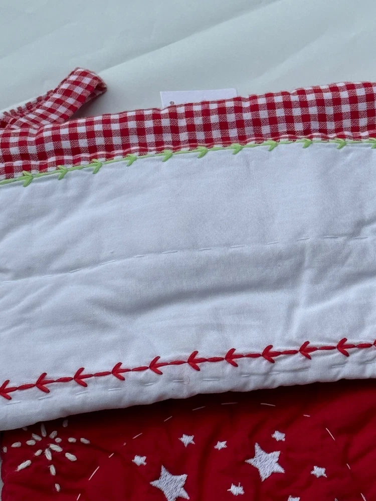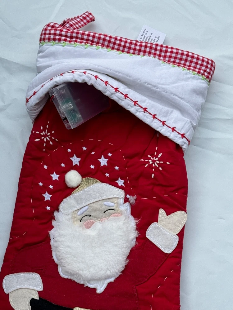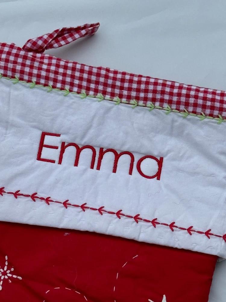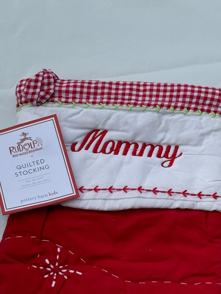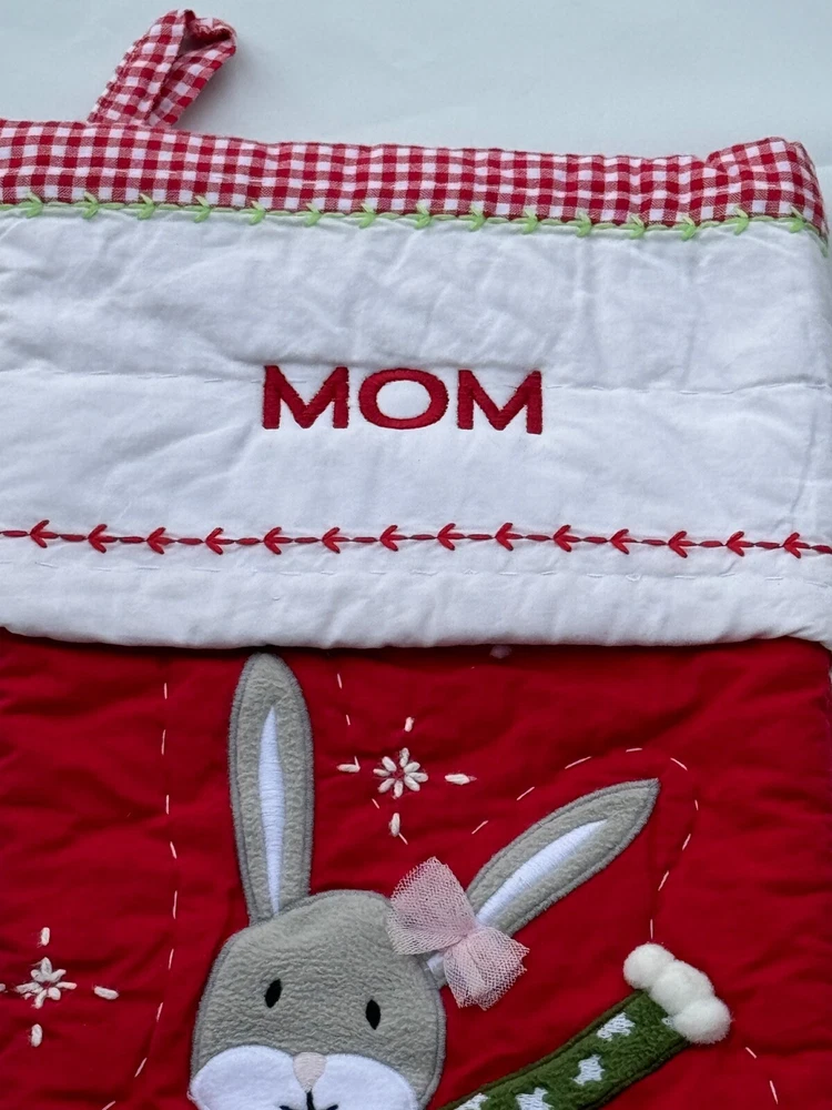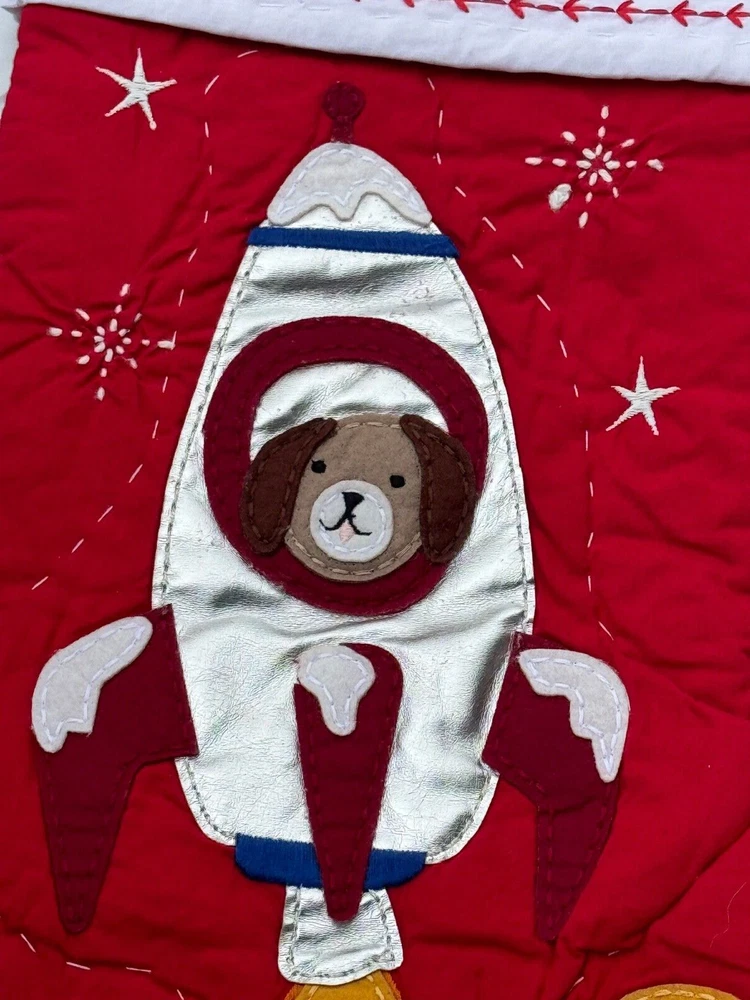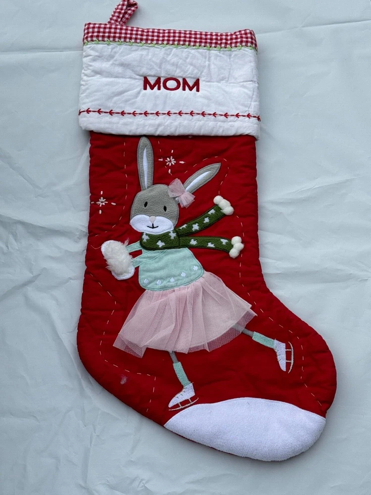 New Pottery Barn Kids Quilted Stocking Designs and monograms vary by selection. These Quilted Stockings are designed by our own artists with vivid and intricate 3-D details, appliqués and embroidery. Made from 100% cotton sheeting, lined with 100% polyester and filled with 100% cotton batting. Cuffs are made of 100% cotton percale. Stockings are yarn-dyed – fibers are treated individually with environmentally safe dyes before weaving to offer vibrant, lasting colors. DIMENSIONS Overall: 11" wide x 20" long Cuff: 5.5" high Length from top of cuff to heel: 20" long Length from heel to toe: 11" long Hanging Loop: 2.5" long Weight: 0.5 lbs