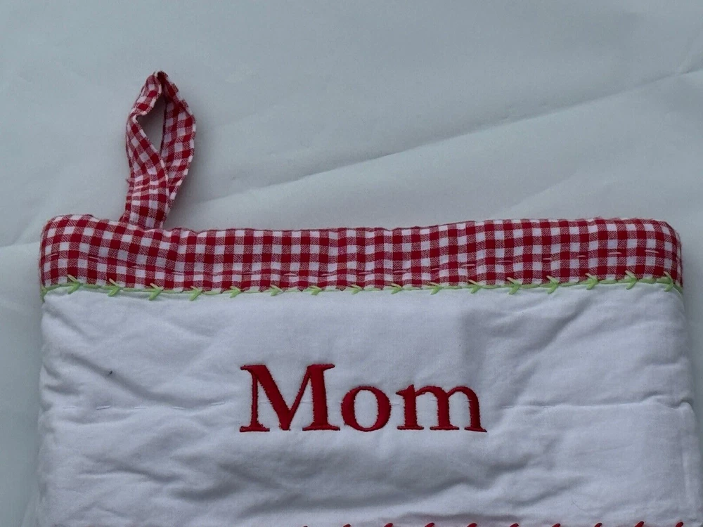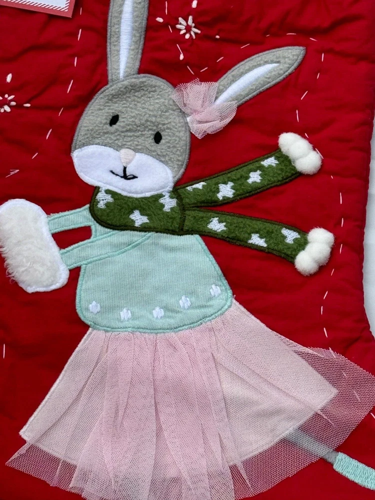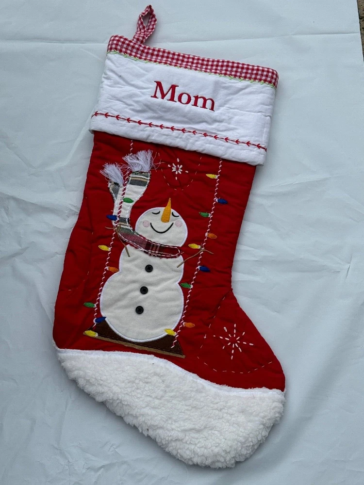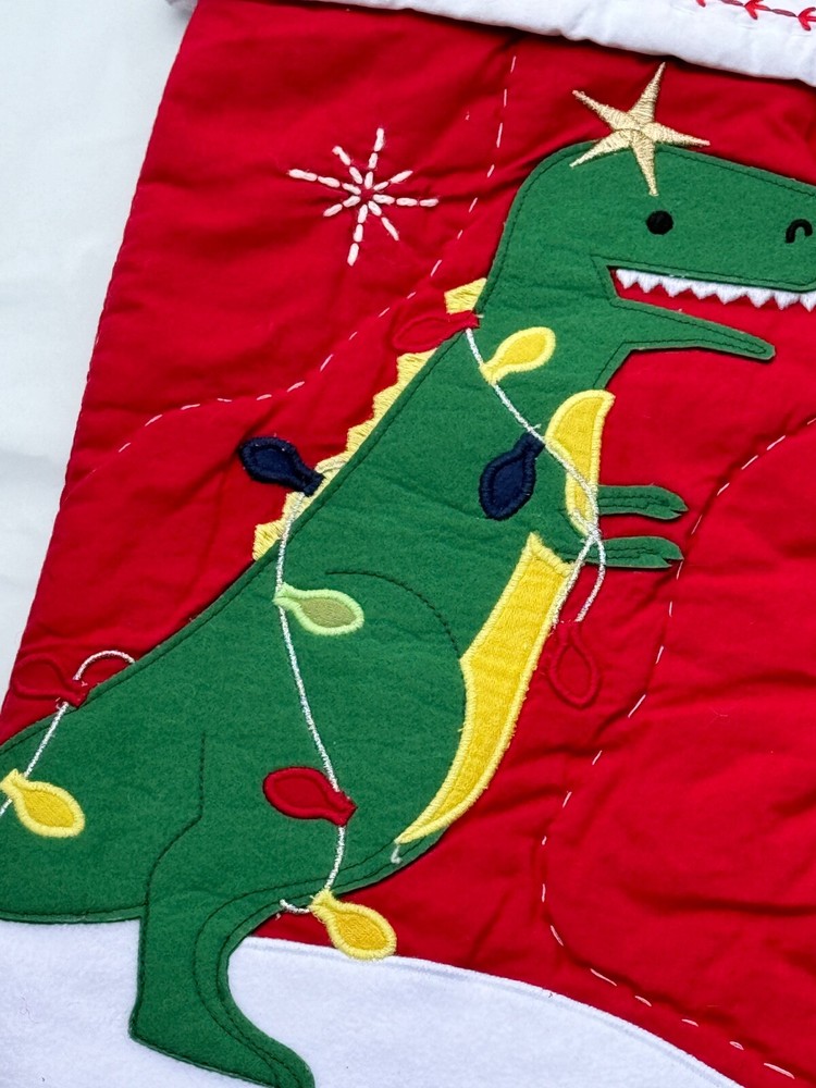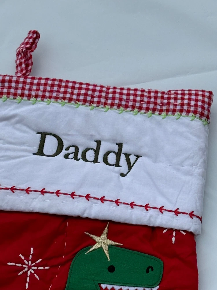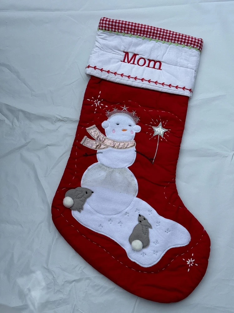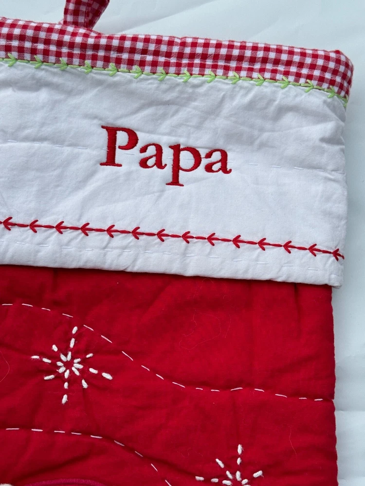 New Pottery Barn Kids Quilted Stocking Designs and monograms vary by selection. These Quilted Stockings are designed by our own artists with vivid and intricate 3-D details, appliqués and embroidery. Made from 100% cotton sheeting, lined with 100% polyester and filled with 100% cotton batting. Cuffs are made of 100% cotton percale. Stockings are yarn-dyed – fibers are treated individually with environmentally safe dyes before weaving to offer vibrant, lasting colors. DIMENSIONS Overall: 11" wide x 20" long Cuff: 5.5" high Length from top of cuff to heel: 20" long Length from heel to toe: 11" long Hanging Loop: 2.5" long Weight: 0.5 lbs