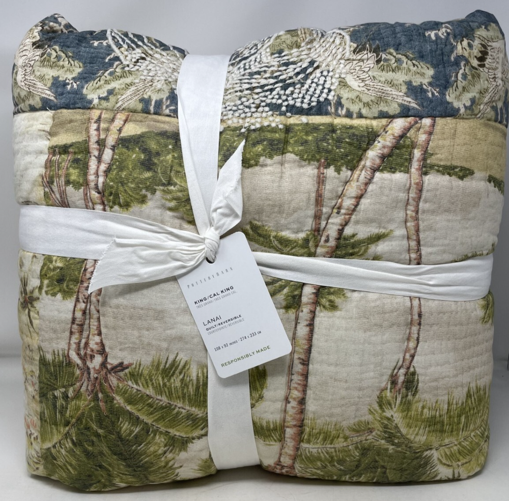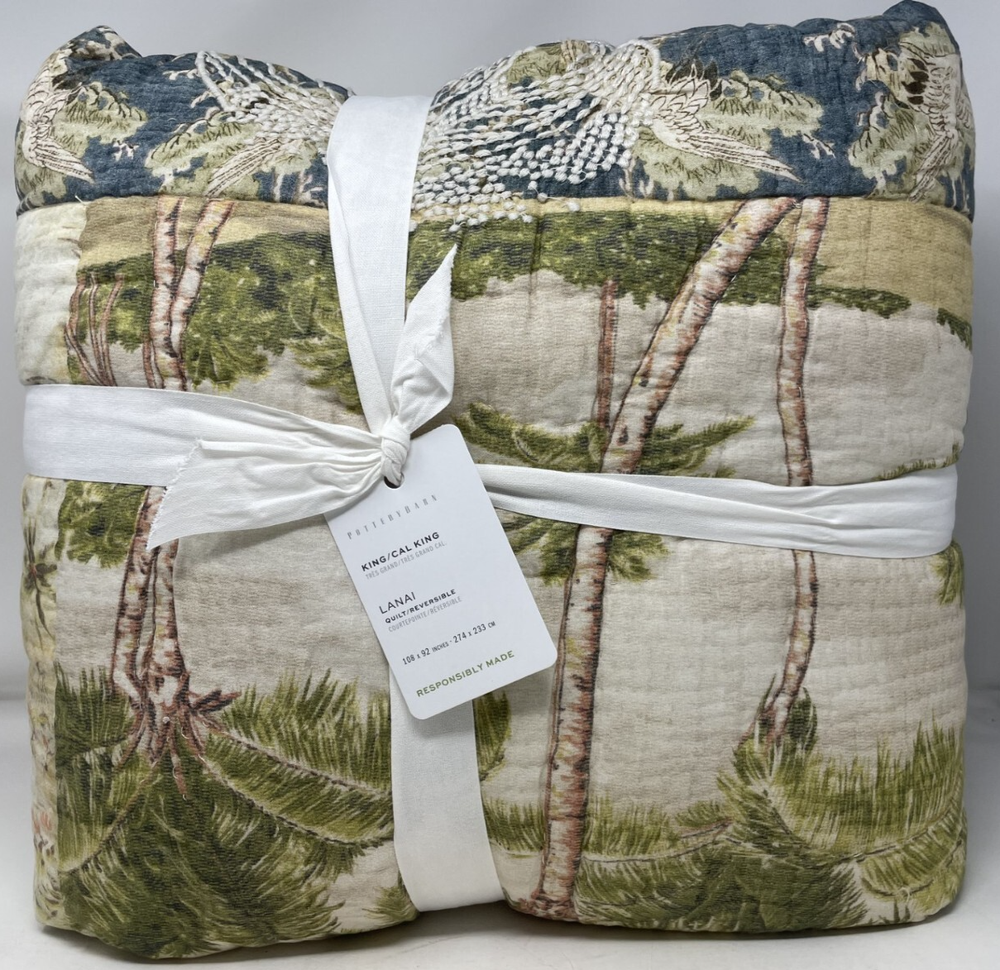 New Pottery Barn Lanai Island Patchwork Reversible King Quilt In a tapestry of sun-kissed fabrics, our reversible bedding celebrates the colorful heritage of patchwork quilts. Faded florals and swaying palms take their cue from tropical-inspired vintage shirts for a relaxed island charm we love. Each quilt is labeled on the back with a message commemorating its individual story and the year it was made—an ode to tradition that makes this piece a special family keepsake. Details Material: Handcrafted from 100% cotton, reverses to coordinating pattern. 100% polyester fill. Reverses to 100% cotton. Place of Manufacture: Imported. Care Instructions Machine wash in warm water; gentle cycle. Only non-chlorine bleach when needed. Tumble dry on low heat; remove promptly. Warm iron as needed. We recommend using large capacity, front loading machines. Dimensions King/Cal. King Quilt: 92" l x 108" w