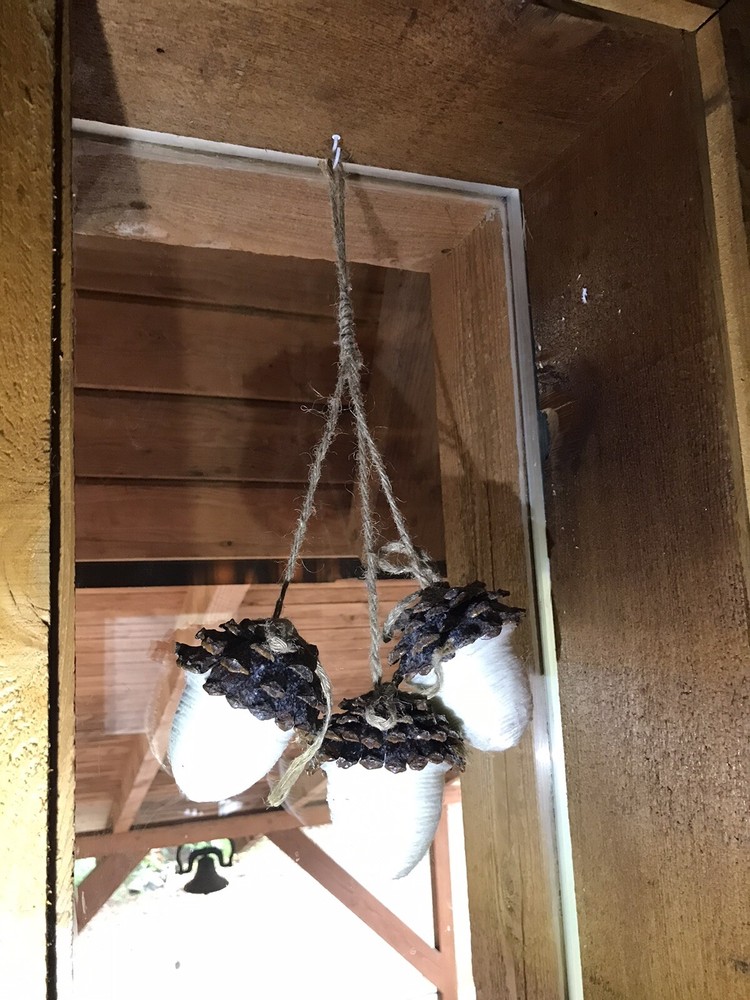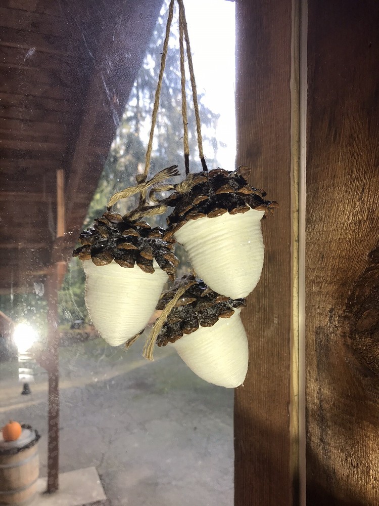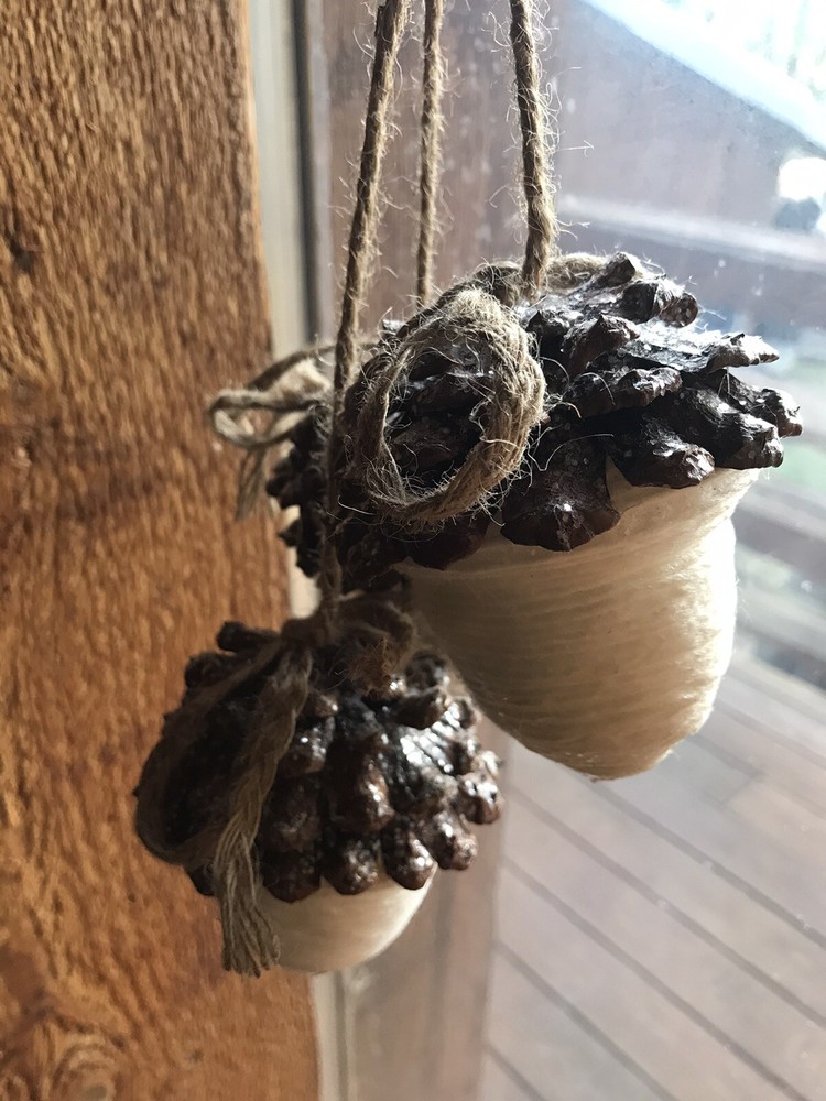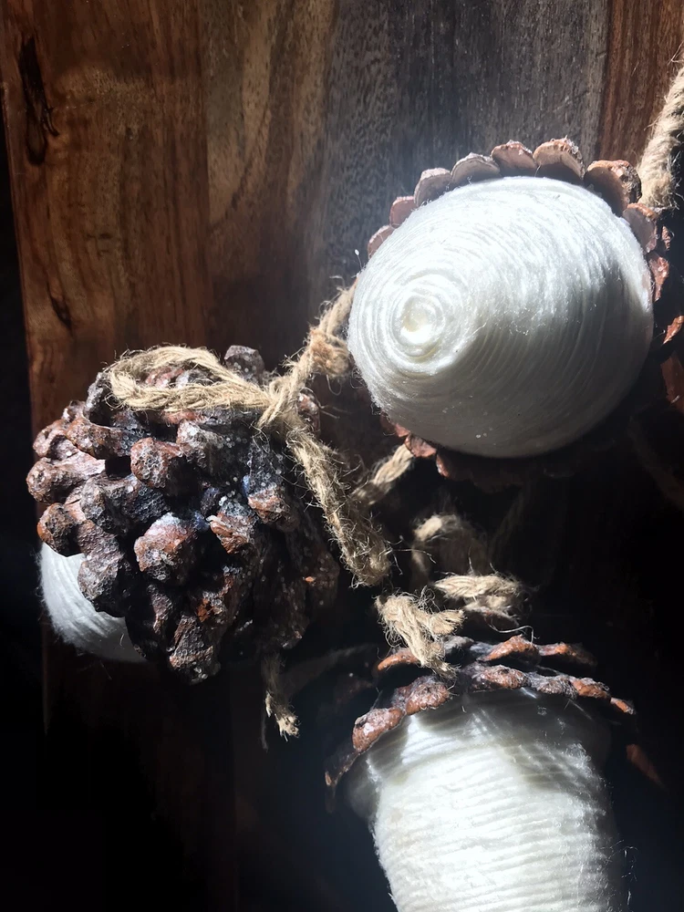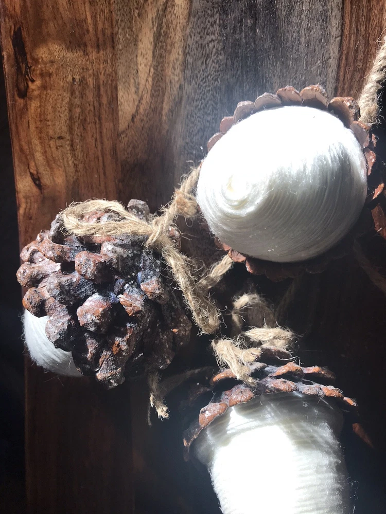 The ornament is beautifully elegant, classy, simple yet very artistic, gives your tree a very classy winter feel. Made from Styrofoam and polyester with natural pinecones and a sprinkle of glittery snow. Hangs from a jute string. Overall: 6" w x 3.25" d x 17.5" h Bought it at Pottery Barn last year and am ready to find them another home.