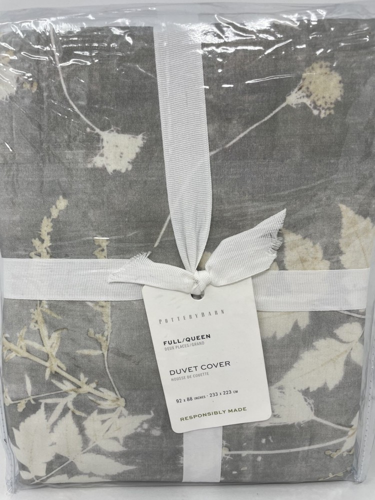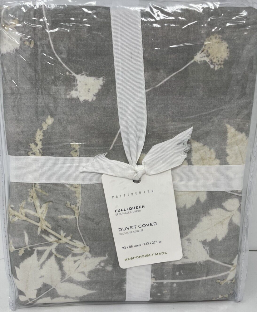 New Pottery Barn Shadow Floral Full/Queen Duvet Cover Designed at our in-house studio, the pattern on our Shadow Floral Duvet and Shams offers an elevated take on florals without being overly fussy. Each piece is printed on crisp 100% cotton that's cool to the touch. Details Material: Made from 100% cotton. Thread Count: 200-thread count. Reversible Design: Reverses to the same. Secure Design: Duvet features a hidden button closure with interior ties that keep insert in place. Place of Manufacture: Imported. Care Instructions Machine wash inside out in cold water on gentle cycle. Use only non-chlorine bleach when needed. Tumble dry on low heat; remove promptly. Warm iron if needed. Dimensions Full/Queen: 88" l x 92" w