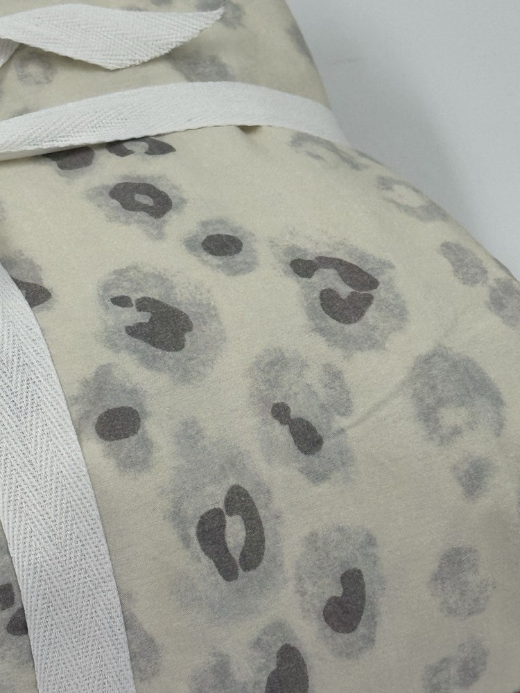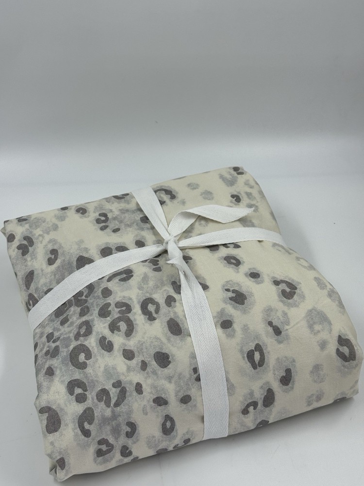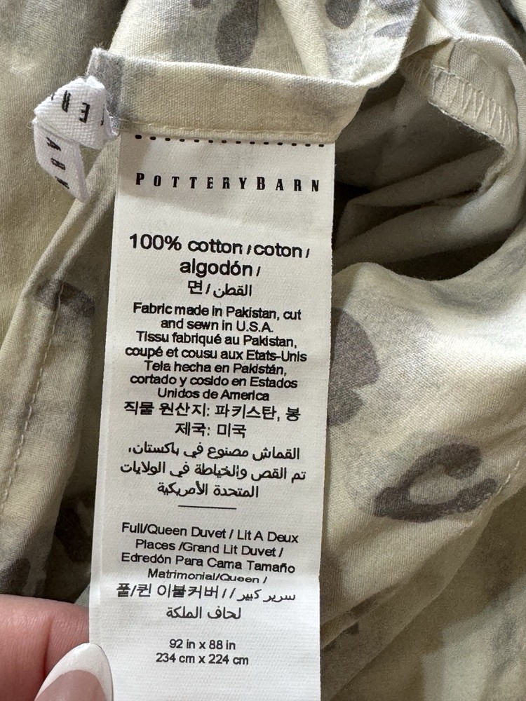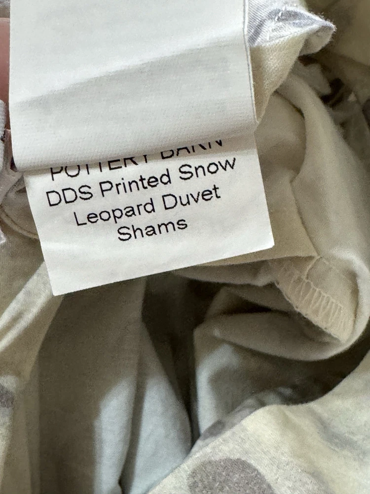 New Pottery Barn Snow Leopard Duvet Cover Full/ Queen This is an open box item. An Open Box item does not include any original packaging. Item is unused, but may arrive slightly more wrinkled than a packaged item and/or have stray hair or fibers. Made from 100% cotton percale. 200-thread count. Reverses to same. Duvet features button closure.
