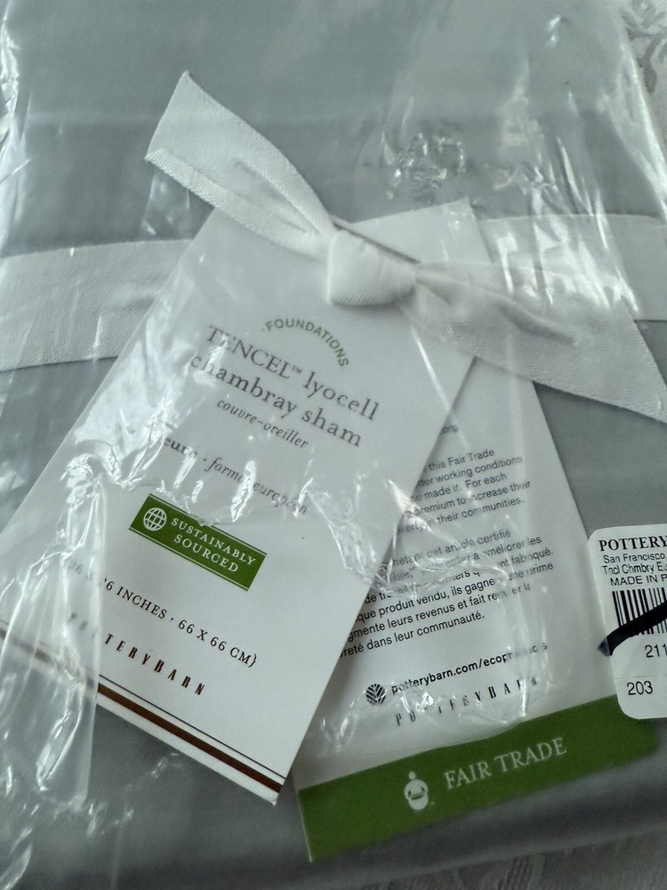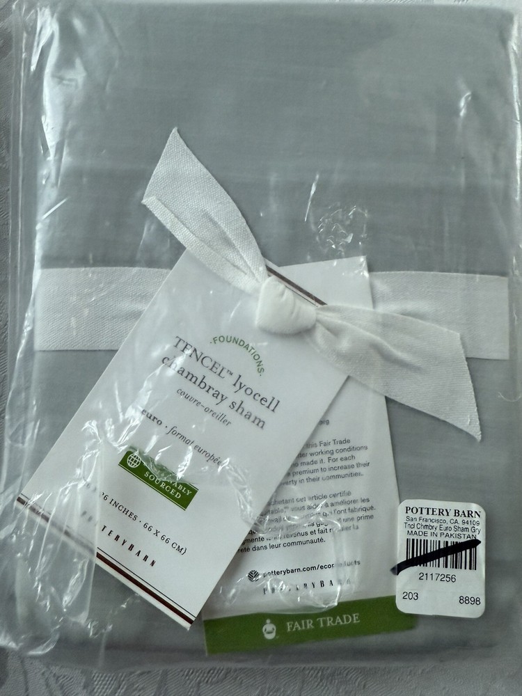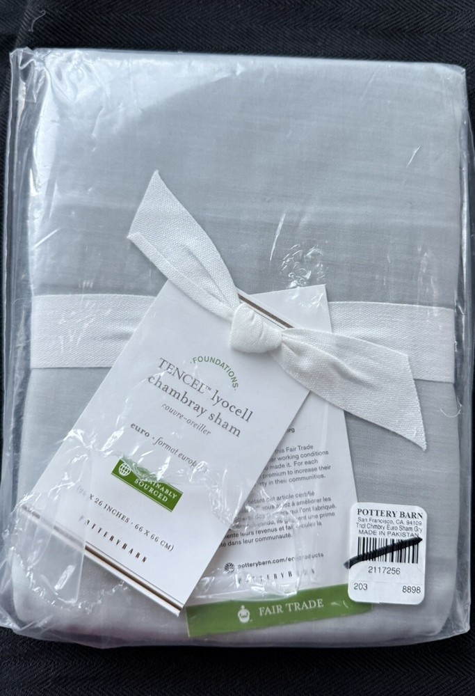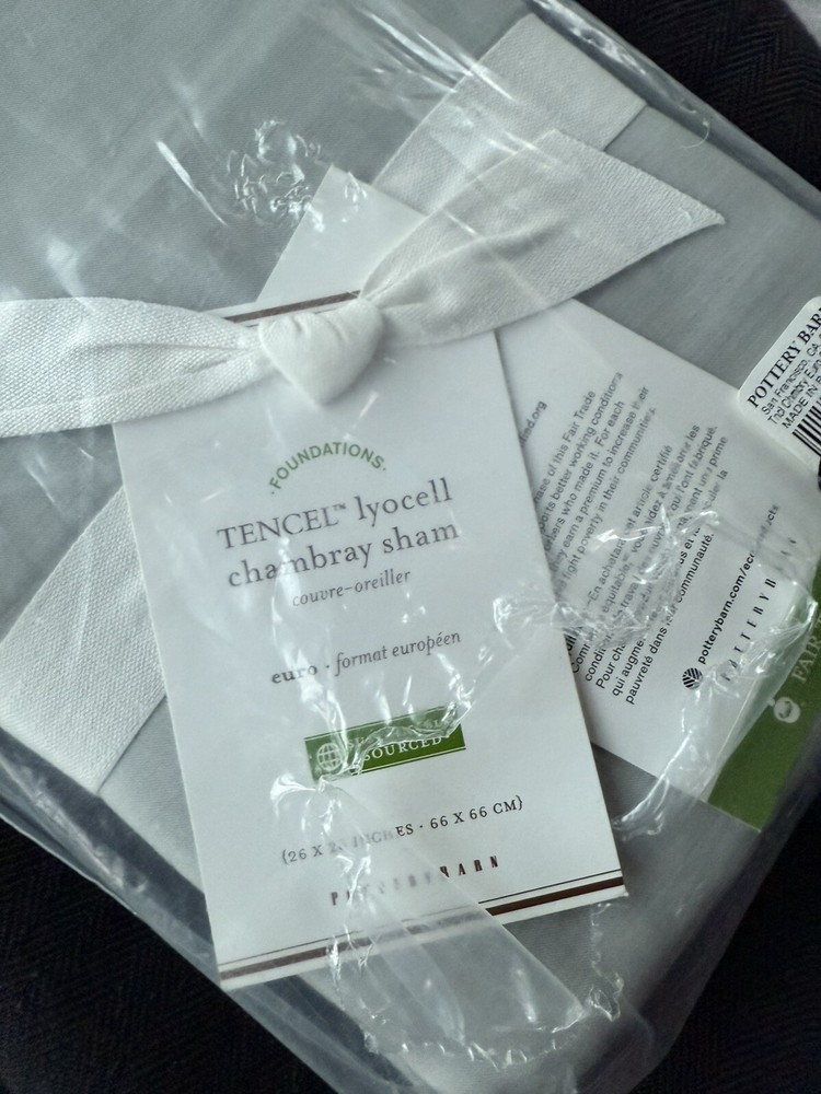 New Pottery Barn pillow sham Tencel Lyocell Euro size Chambray Grey Gray Fair Trade 1 case Package has a small hole in one side. Item is pristine, and has never been removed from the packaging See photos. Non-smoking household. Immediate shipment.