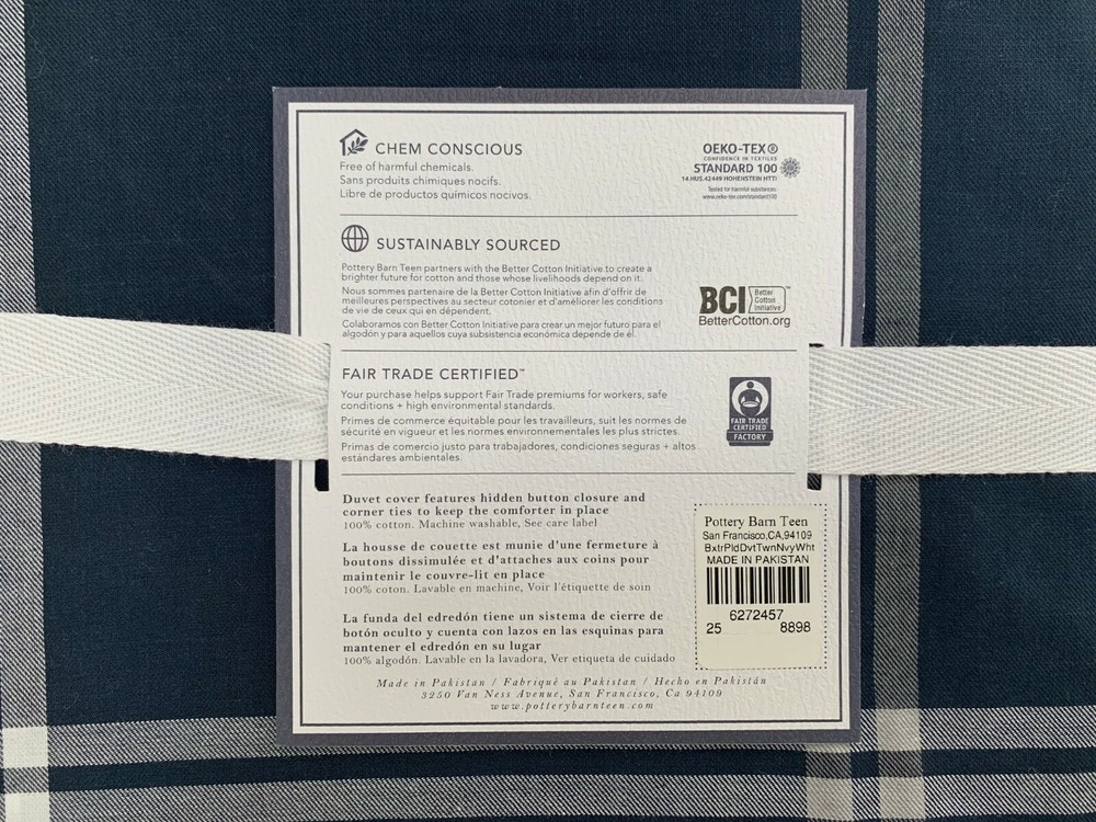 Pottery Barn Teen New Pottery barn Teen Windowpane Duvet Cover & Sham size: Twin 68 x 86" sham: 20 x 26" color: White Navy see pictures Duvet cover and sham reverse to same as front. 100% cotton Machine wash 200-thread count. Imported. Woven in a yarn-dyed windowpane plaid, this duvet cover and sham offer classic style along with the elevated quality of sustainably sourced cotton and Fair Trade Certified™ production. The soft, cozy cotton is also STANDARD 100 by OEKO-TEX® certified for a healthier sleep space. New in Original Packages from a smoke free, pet friendly home!
