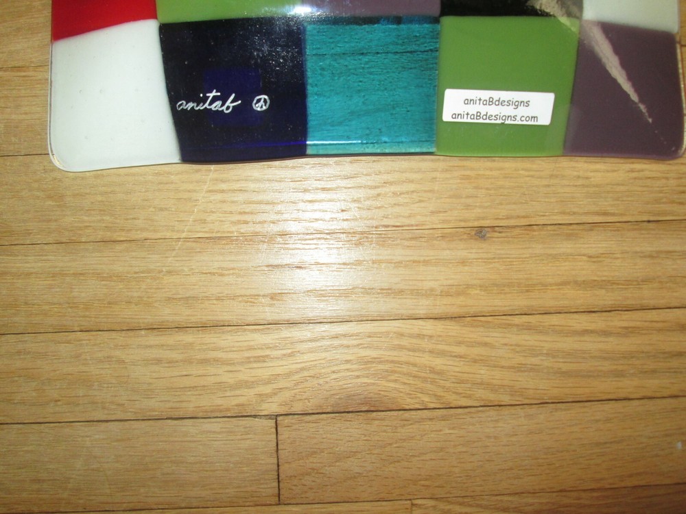 Beautiful and eclectic fused art glass square tray, signed by artist - AnitaB (Anita B Lang). Measures approx. 10.25" L X 10.25" W. Never used...just displayed in a cabinet and in mint condition.