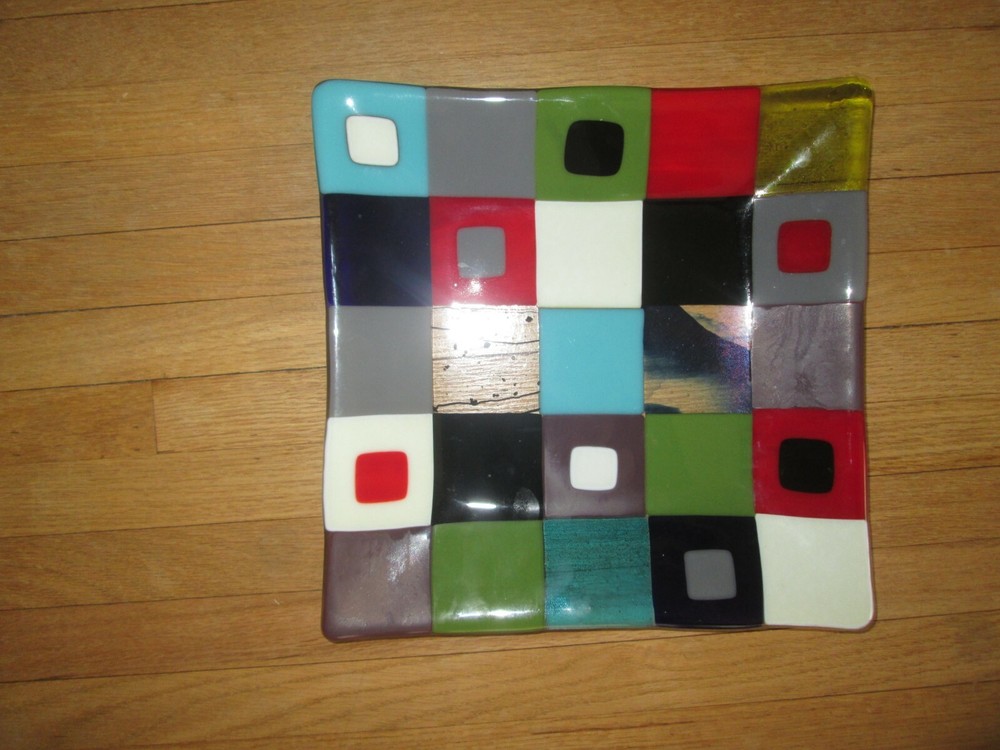 Beautiful and eclectic fused art glass square tray, signed by artist - AnitaB (Anita B Lang). Measures approx. 10.25" L X 10.25" W. Never used...just displayed in a cabinet and in mint condition....