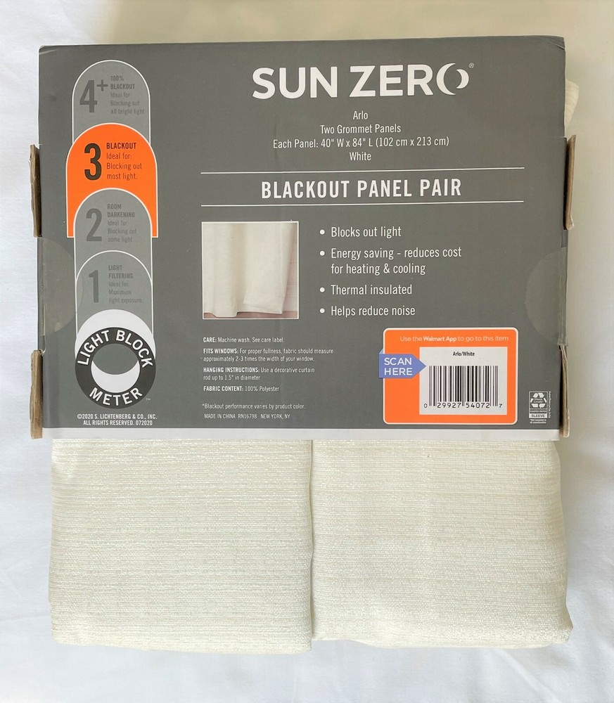 New Sun Zero Arlo 84" x 40" Blackout Energy Efficient 2 Grommet Curtain Panels Off White. Blackout panel pair. Block out light. Energy-saving. Thermal insulated. Helps reduce noise. Please ask any que...