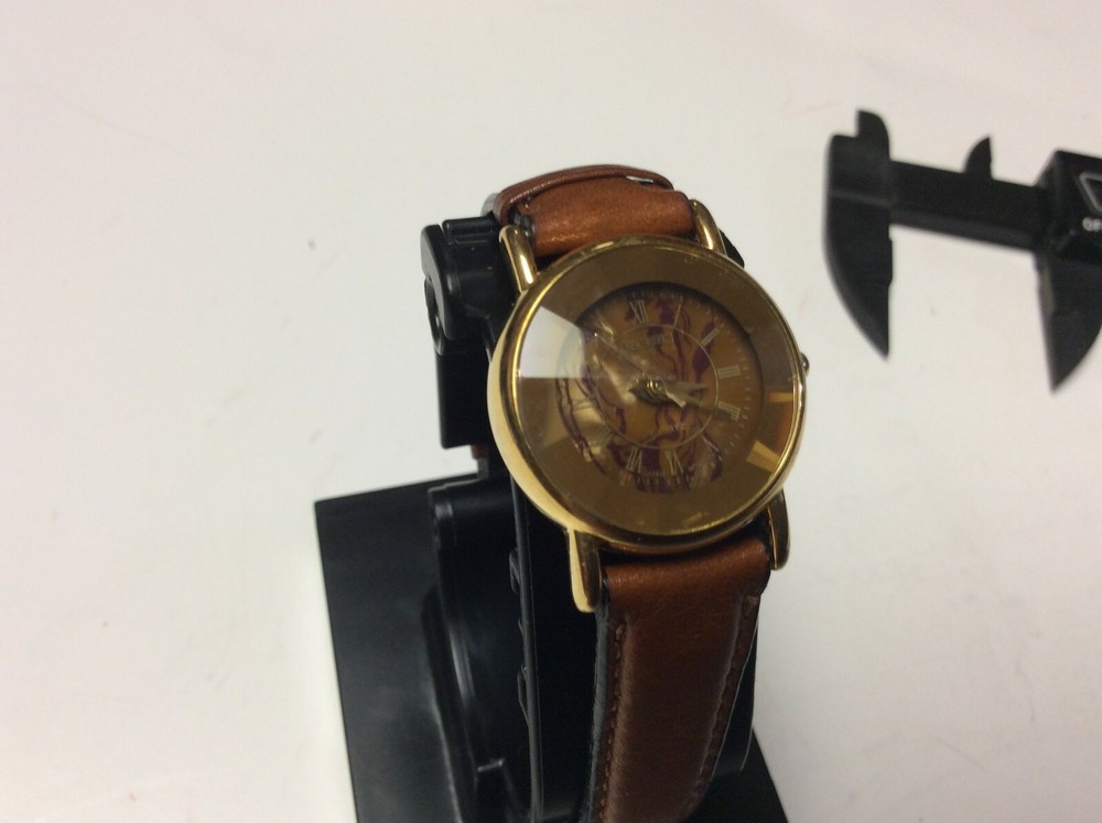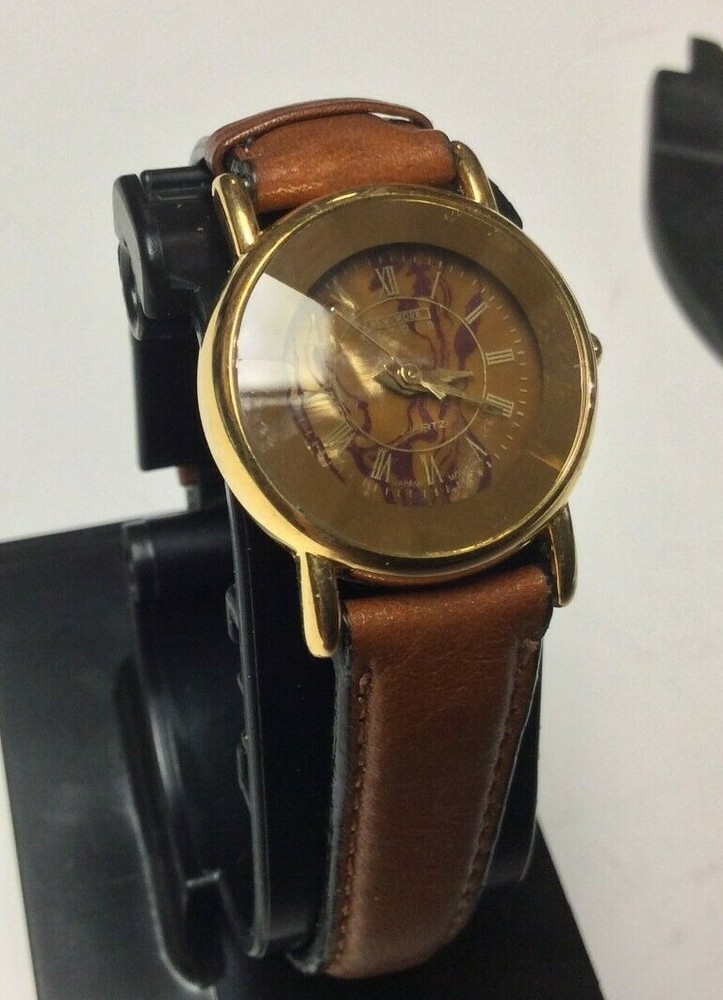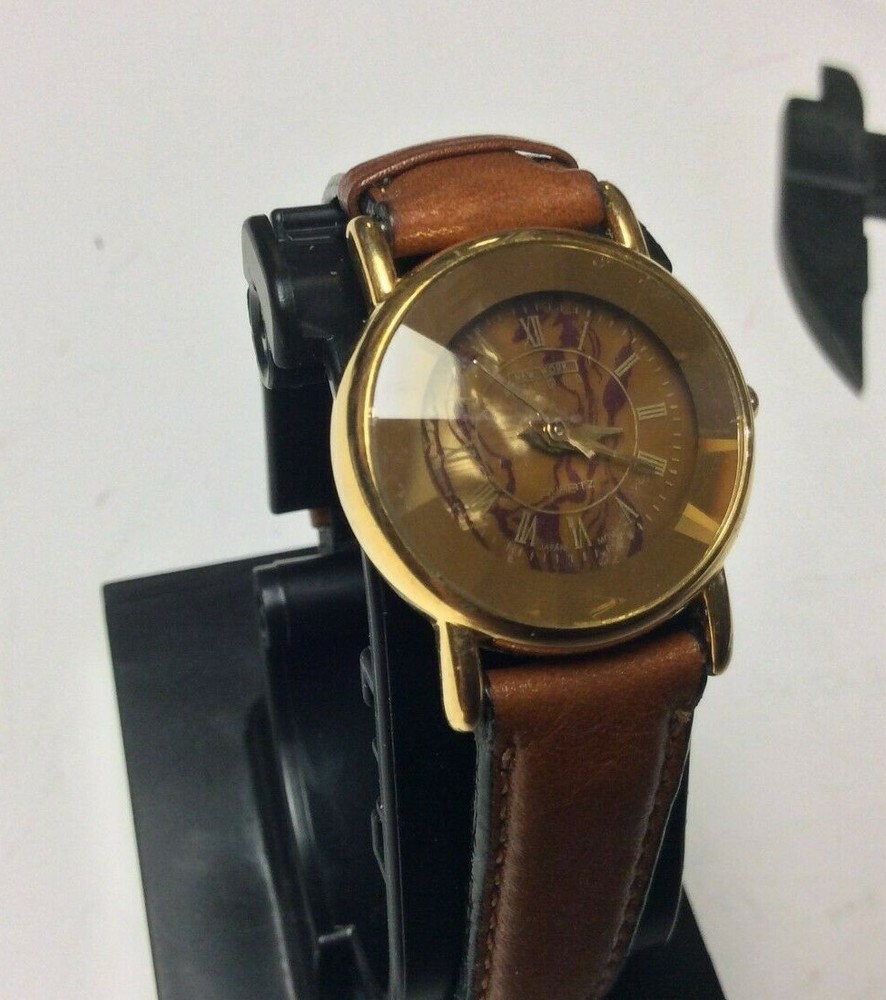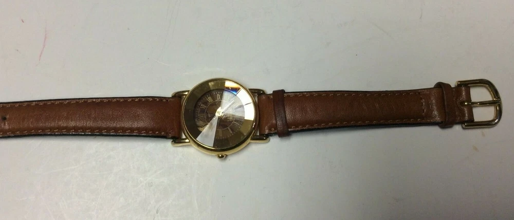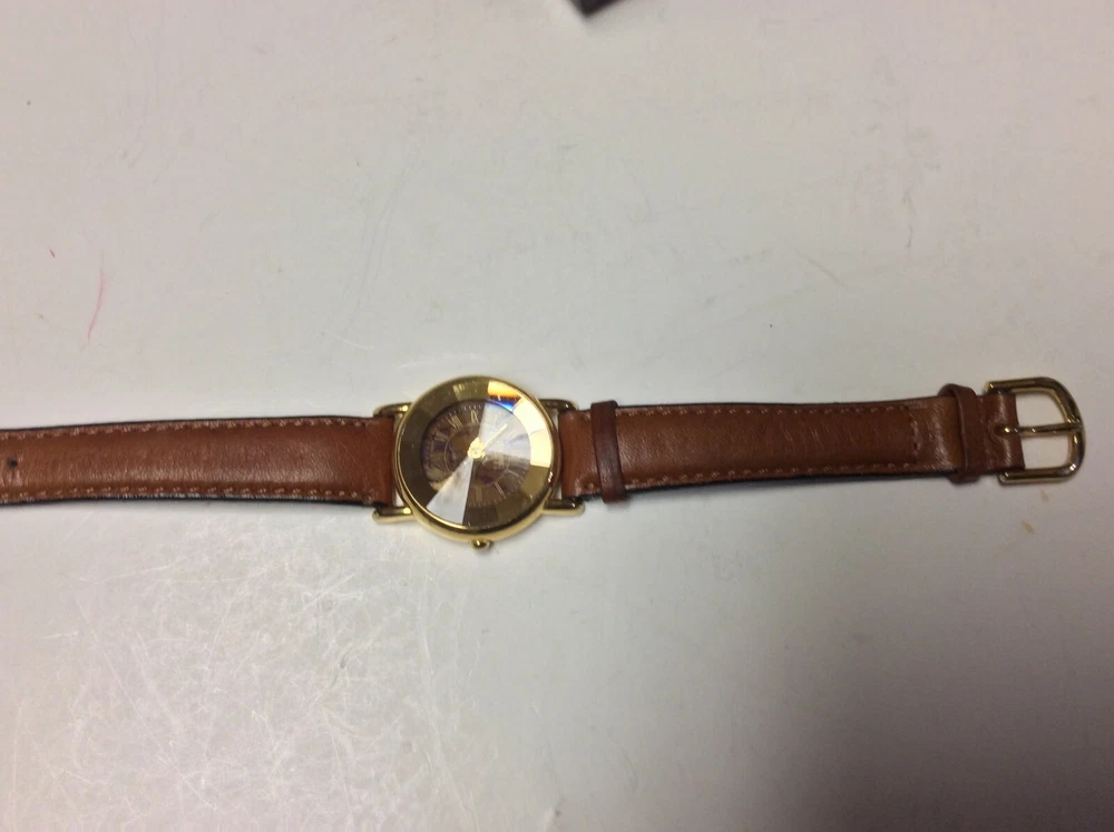 THANK YOU FOR SHOPPING AT HAROLDS TREASURES IF THERE ARE ANY ISSUES PLEASE MESSAGE ME DIRECT BEFORE OPENING A RETURN OR CONTACTING EBAY. IF YOU FIND THESE TERMS UNACCEPTABLE THEN WE ASK THAT YOU DO NOT PURCHASE ANY ITEMS FROM MY STORE. ITEM DESCRIPTION I TEM BRAND / NAME : New York Studios MOVEMENT : Very clean precision quartz with a new battery installed. The watch sets and keeps time as designed. DIAL : Round multi color dial that is very nice and unique signed New York Studios at the top. The dial is in perfect condition. CRYSTAL : Very clear diamond shaped crystal showing some minor surface marks and the dial is clearly visible. CASE: Shiny gold tone case with a silver tone snap down case back. The case shows some light and normal surface marks but n damage and it looks good. BAND: Higher end leather strap showing very little signs of ever being worn and in good ready to wear condition. Shipping info: We do not profit from shipping rates and when shipping our clocks and heavier items we use ebays “cost by location”. These rates are based off of weight and location with packing material included. We also combine shipping whenever possible.