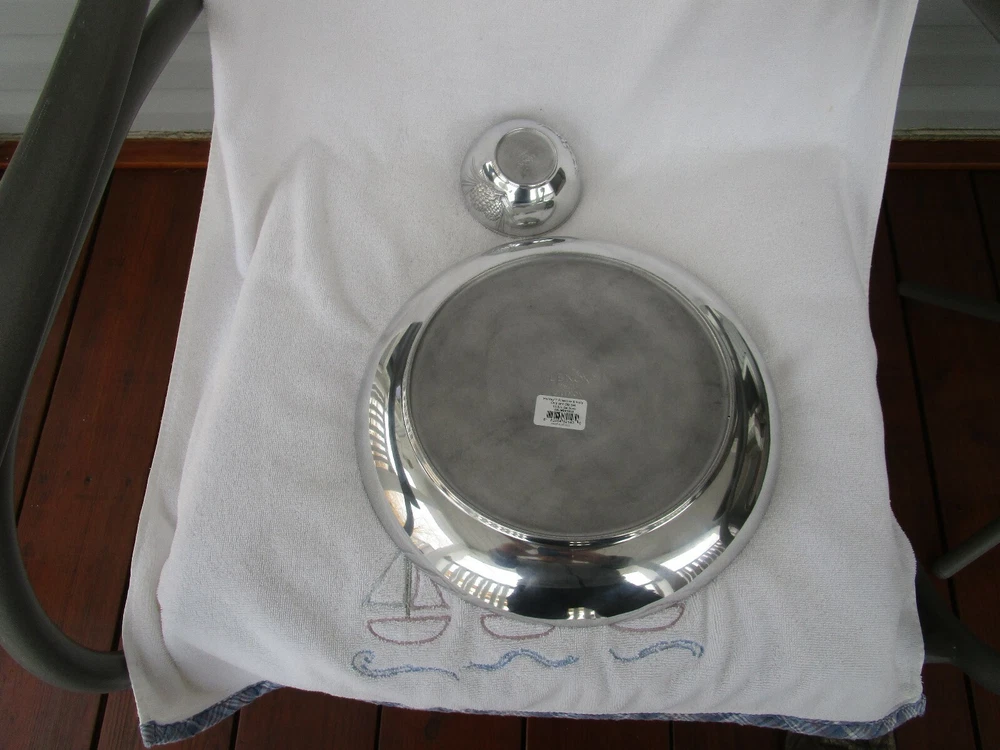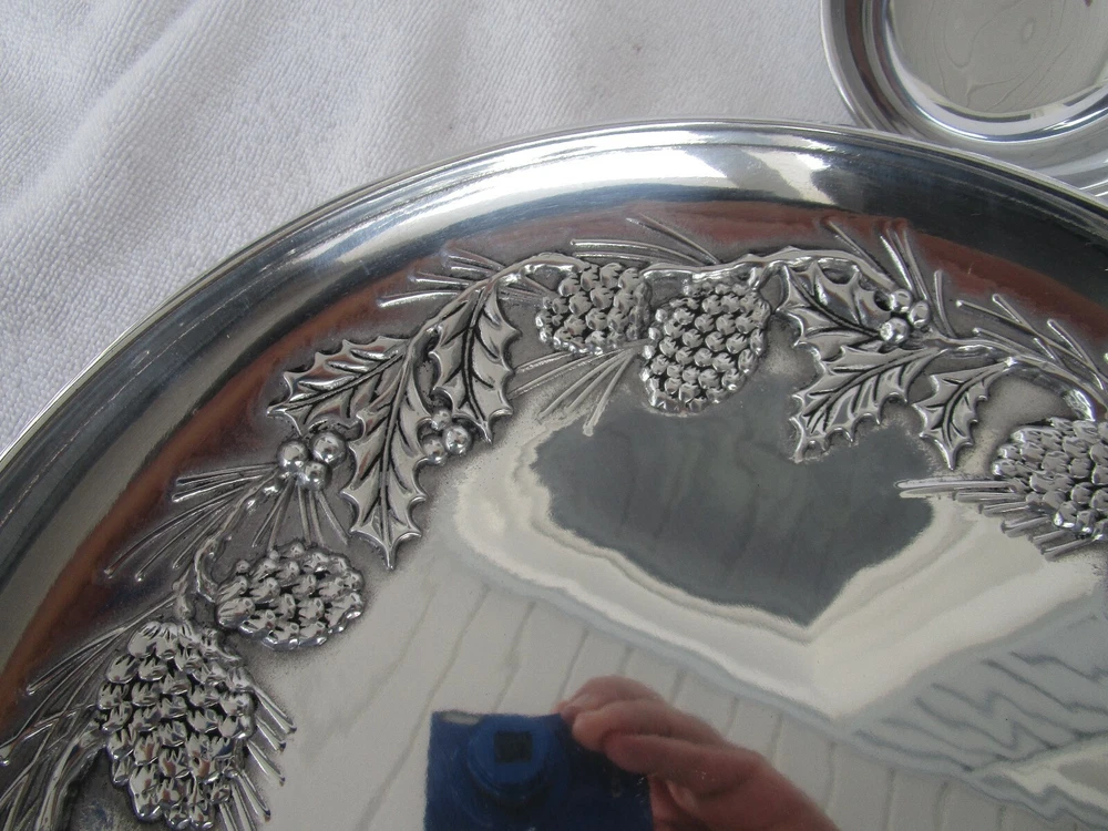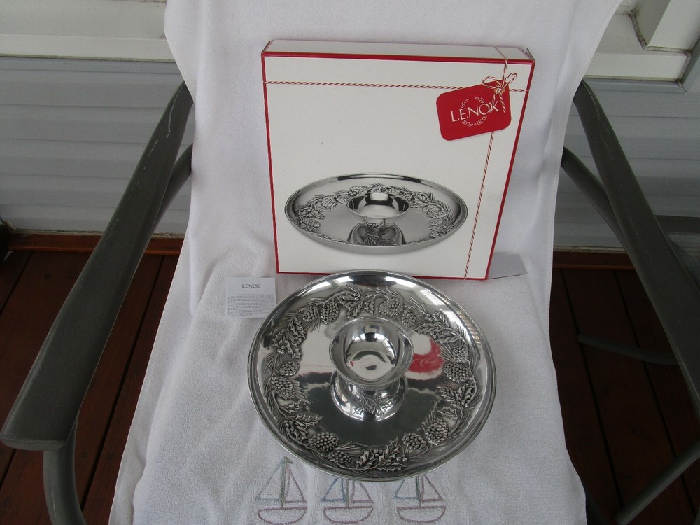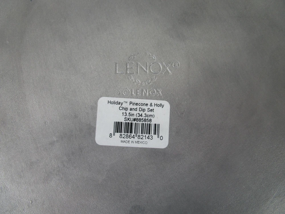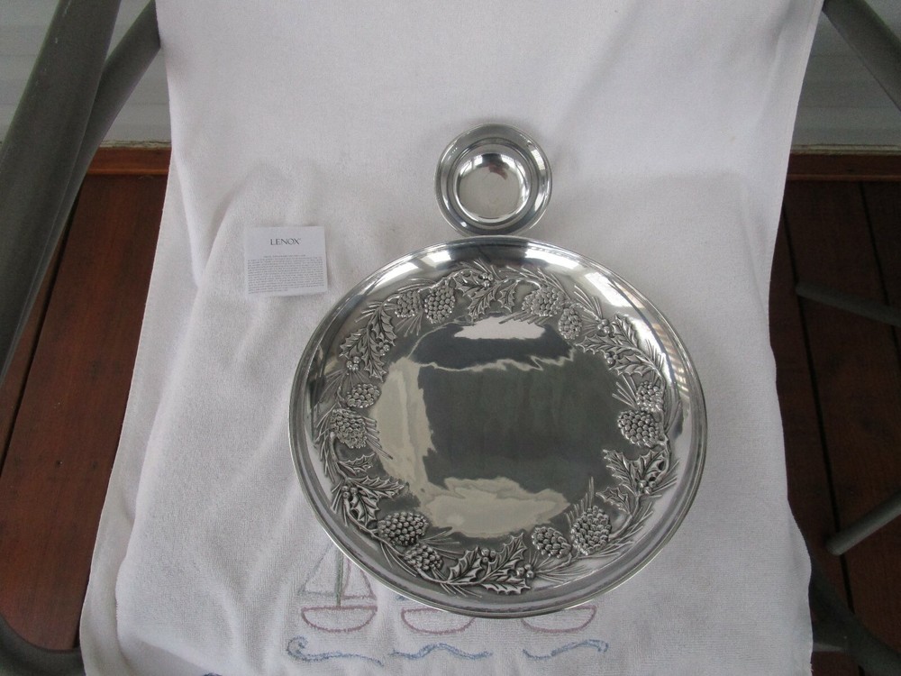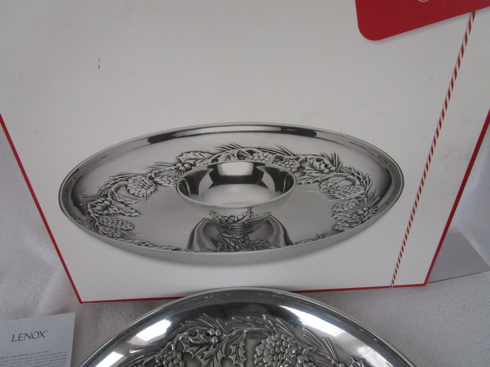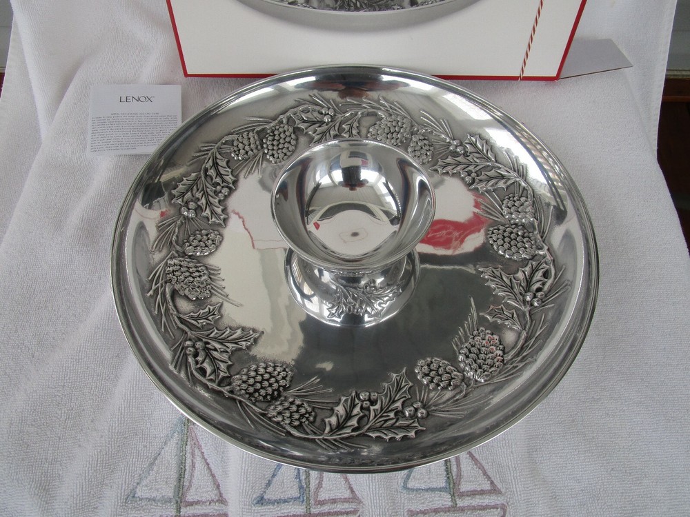 THIS IS A GORGEOUS+[LENOX] ~METAL~[HOLIDAY PINECONE&HOLLY] CHIP AND DIP SET WILL NEVER RUST!!!! EXPERTLY CRAFTED~HIGH QUALITY 13.5" IN DIAMETER 5 POUNDS + 11 OUNCES 7 POUNDS PACKED FOR SHIPING WHAT A GORGEOUS CENTERPIECE!!!! [SELLERS NOTE~~GARAGE TABLE/SHELF]
