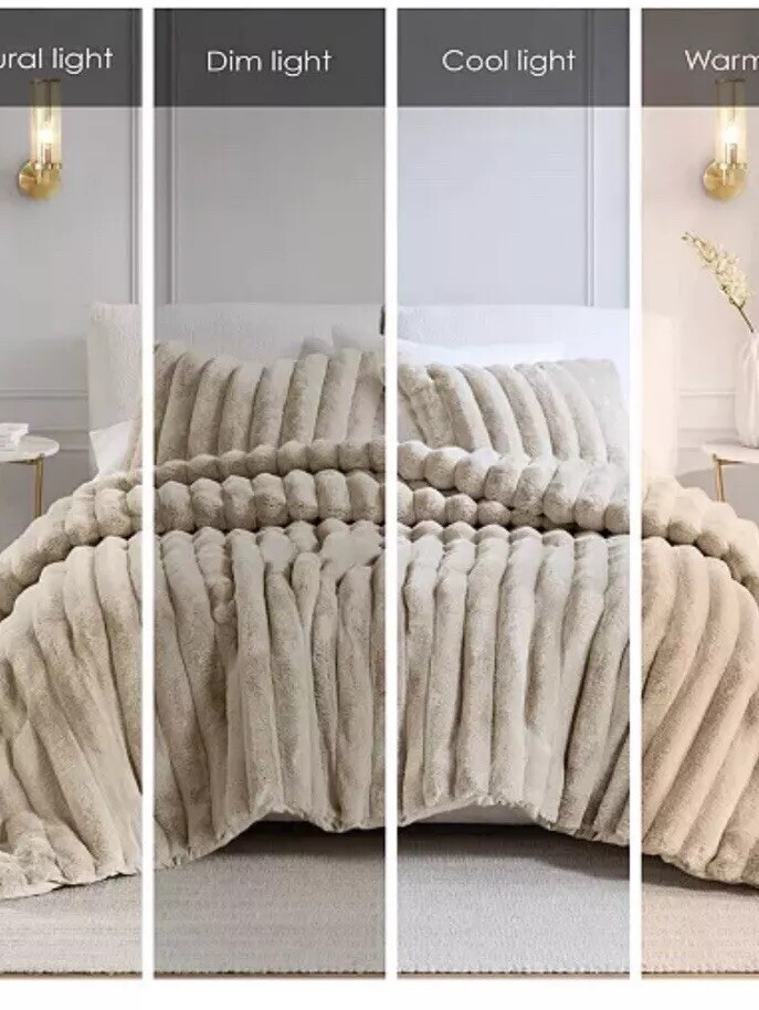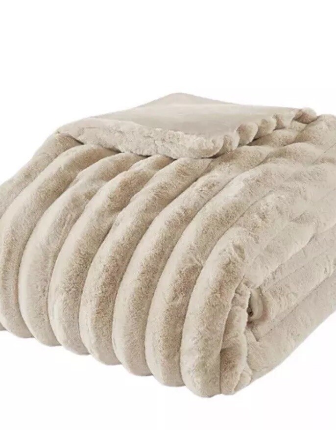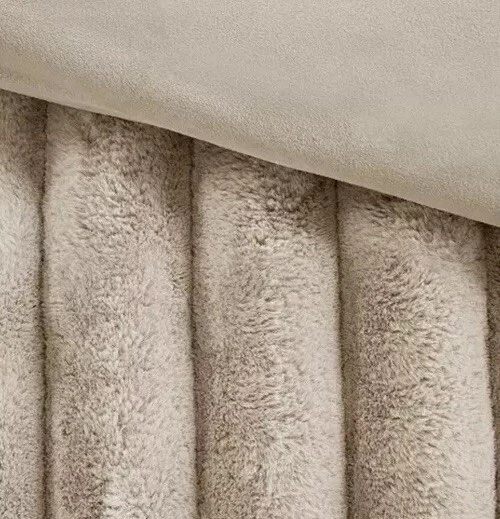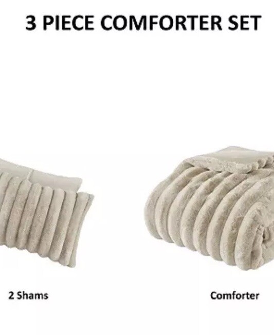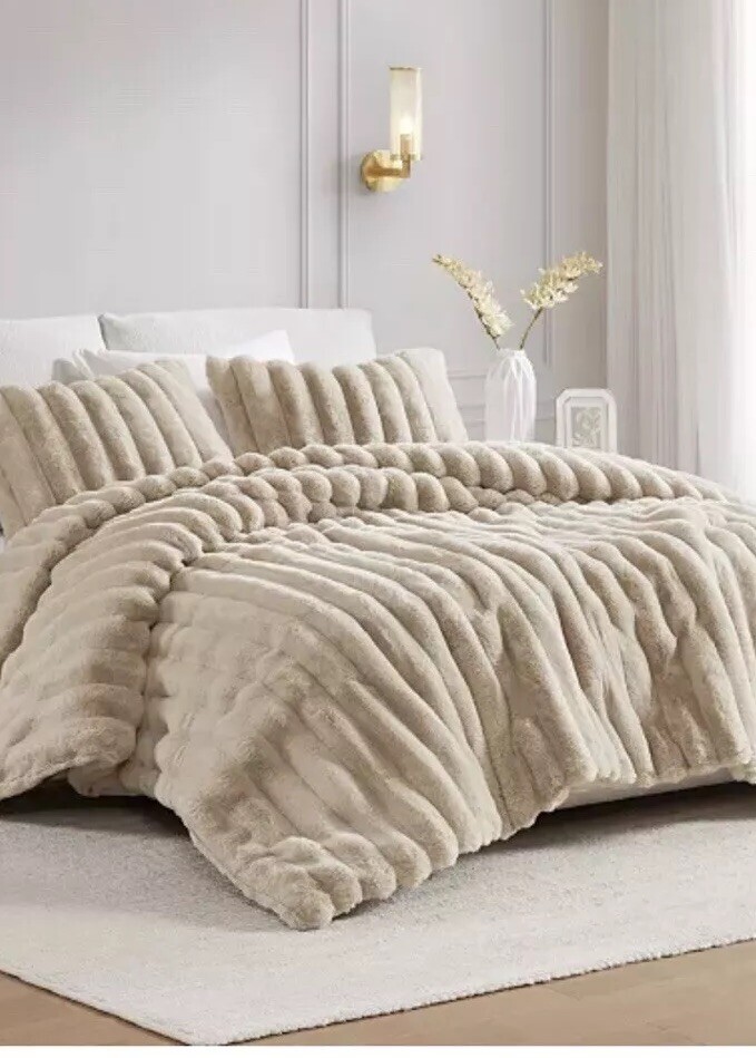 New-Macy’s Madison Park Jasmine Taupe Faux Fur Reverse to Velvet 3-Pc. Comforter Set, King. Suggested Retail Price: $330.00 With a luxurious hand feel and velvety softness, this faux fur comforter set will bring inviting warmth to your bedroom. The simple corded texture pairs perfectly with neutral hues to add visual interest that will match any decor. Product Features: Dimensions: 1 Comforter: 104"W x 90"L, 2 King Shams: 20"W x 36"L Includes: 1 Comforter, 2 King Shams Corded design adds texture and visual interest to the solid neutral hues For best result before first use, put the product in dry with setting "no heat" of "air fluff" to remove loose fibers and reduce shedding Polyester Machine washable Beautiful, new and luxurious bedding. Unfortunately, didn’t match my color scheme. My loss is your gain! Thanks for looking.
