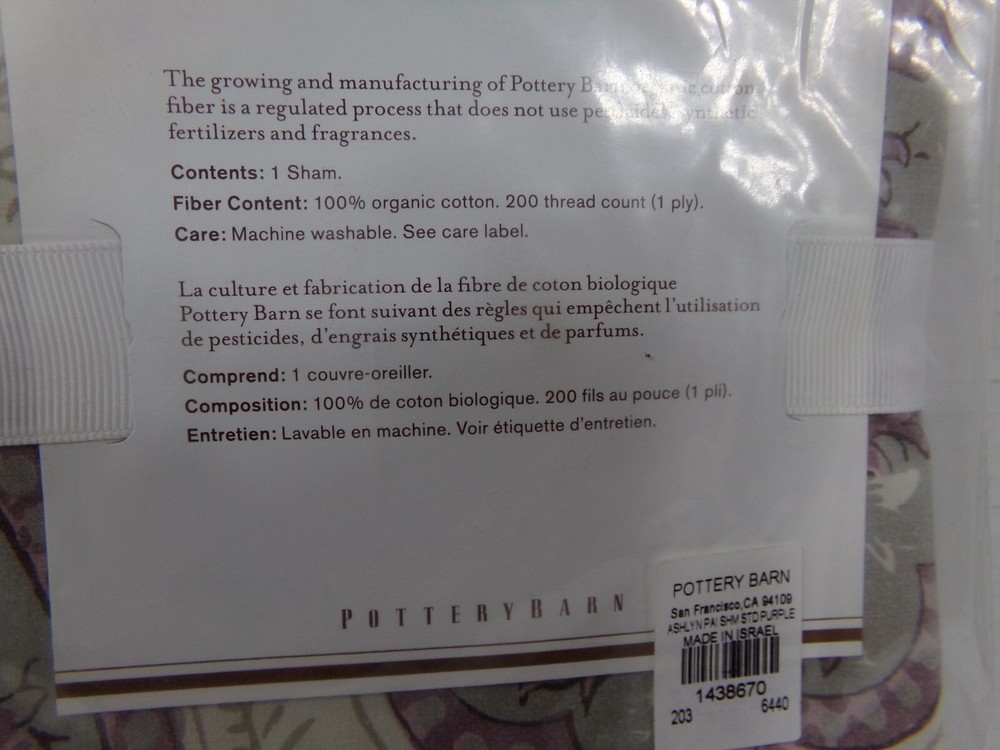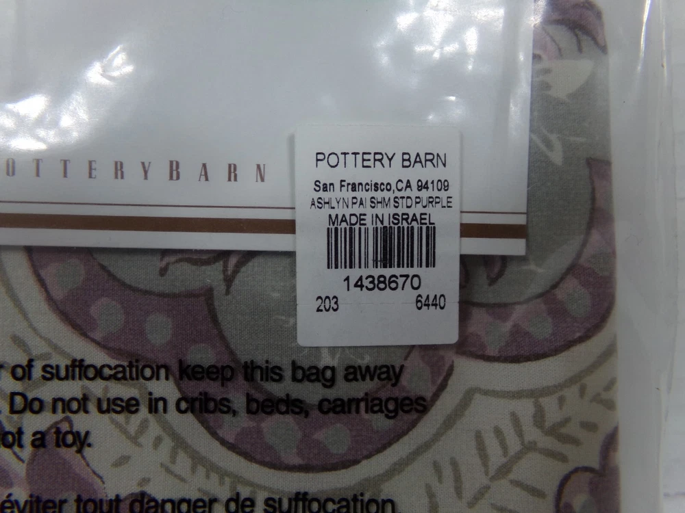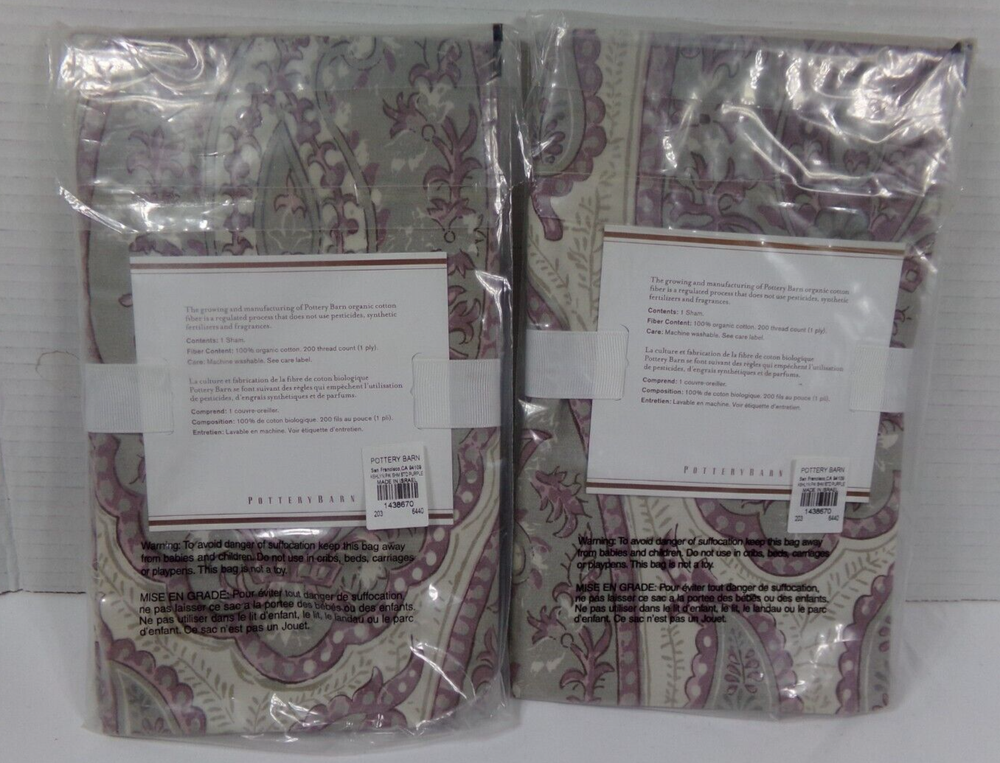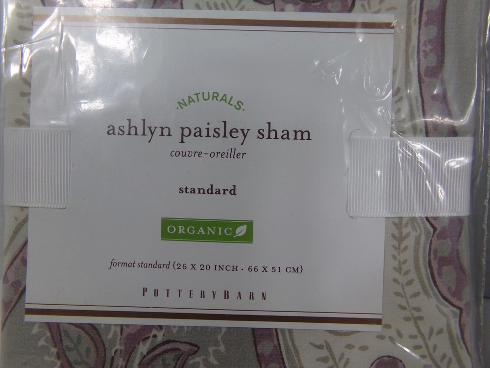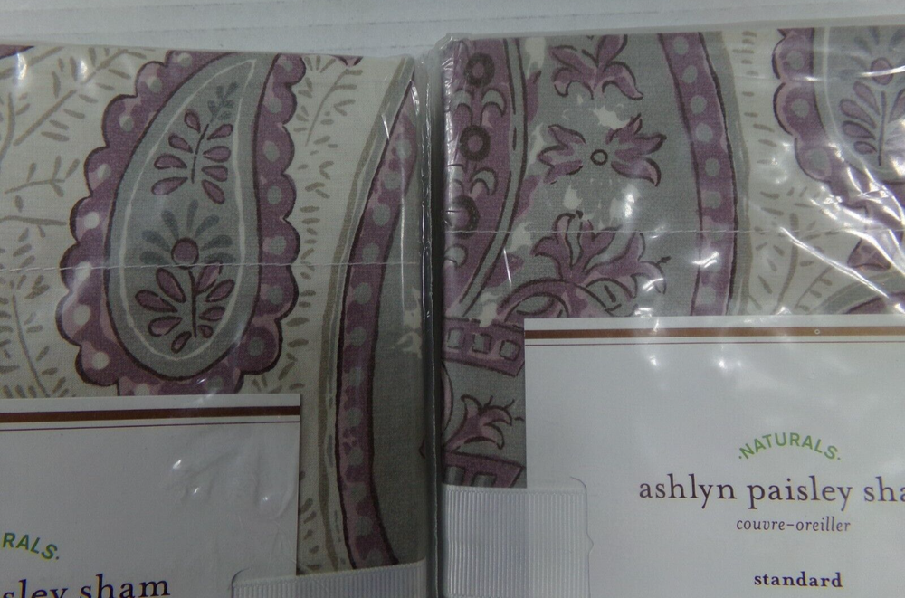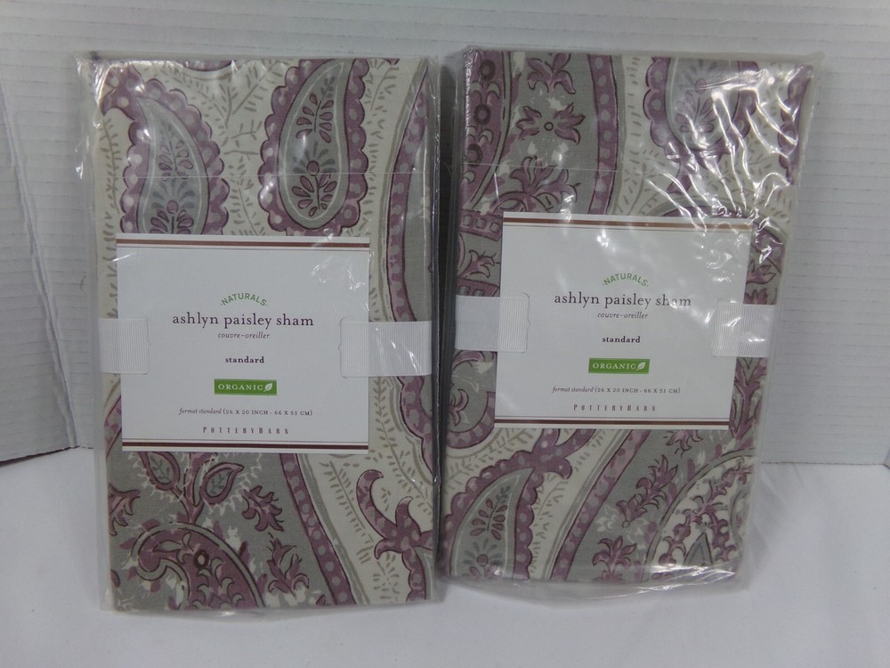 New in packages is a lot of 2 Pottery Barn shams. These are Pottery Barn Naturals - Ashlyn Paisley Sham in standard size (20" x 26"). Fabric is organic cotton. Thread count is 200. Design is a paisley in soft grays and lavender. Buyer agrees to add shipping (inventory code 2. 25.1 )