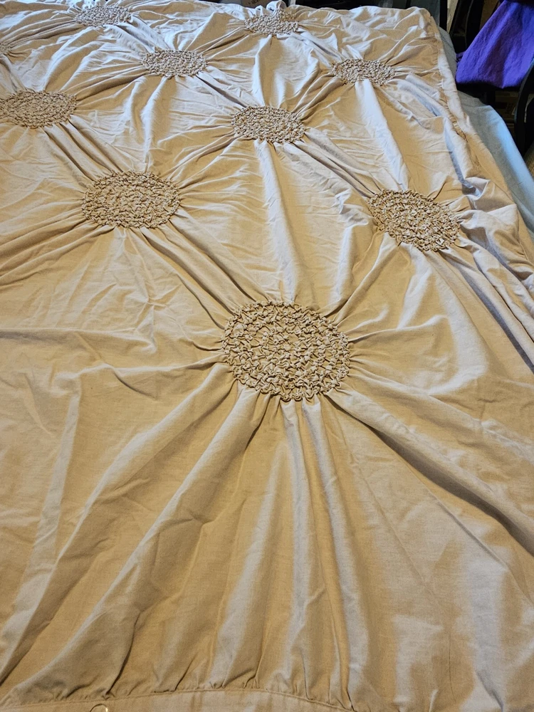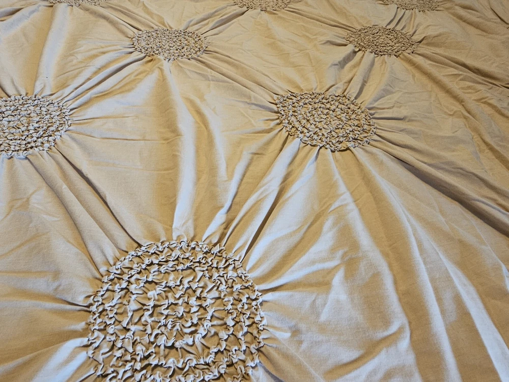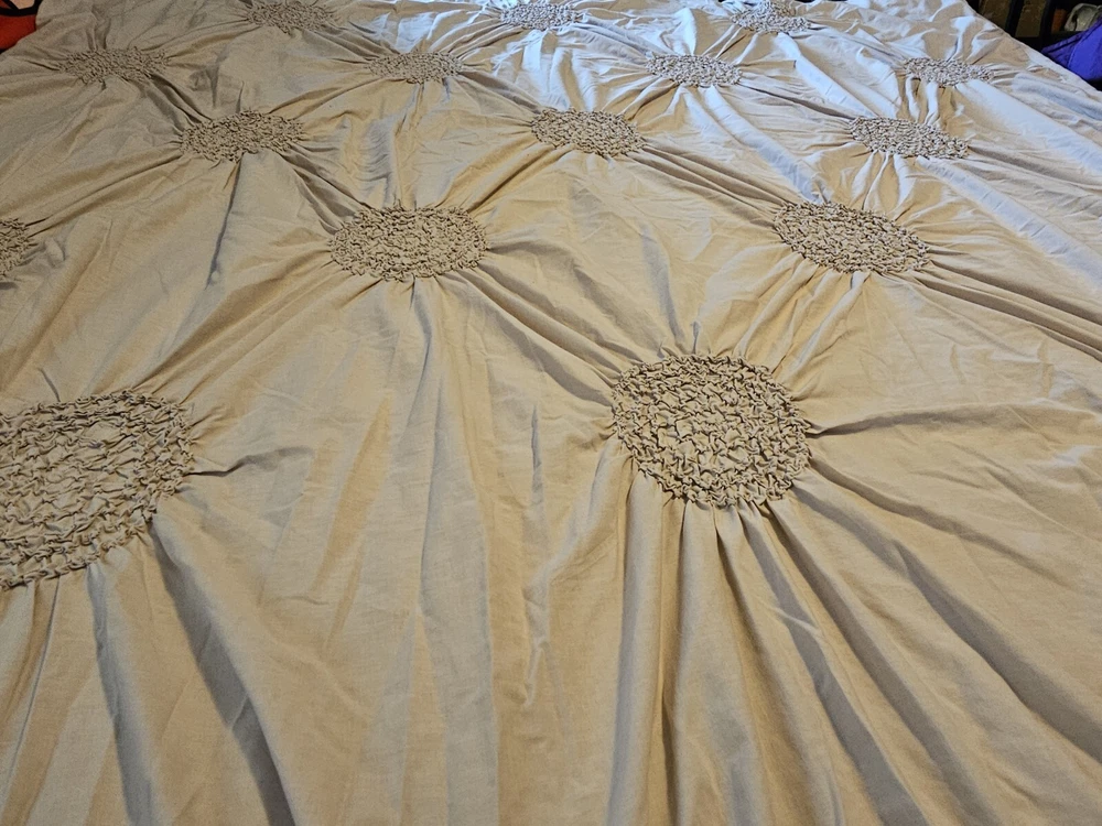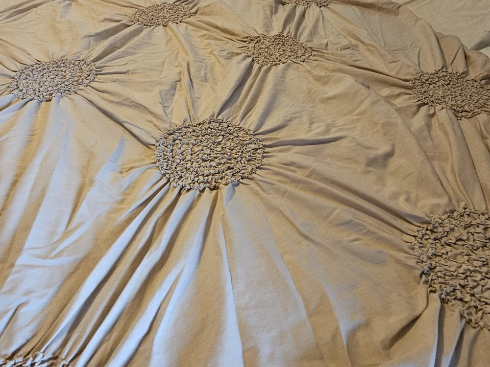 Natural color circle ruched duvet. Full size with 2 shams 80 inch by 78 inches. In very good condition, no flaws noticed. Laundered and clean. Cotton blend, machine washable.